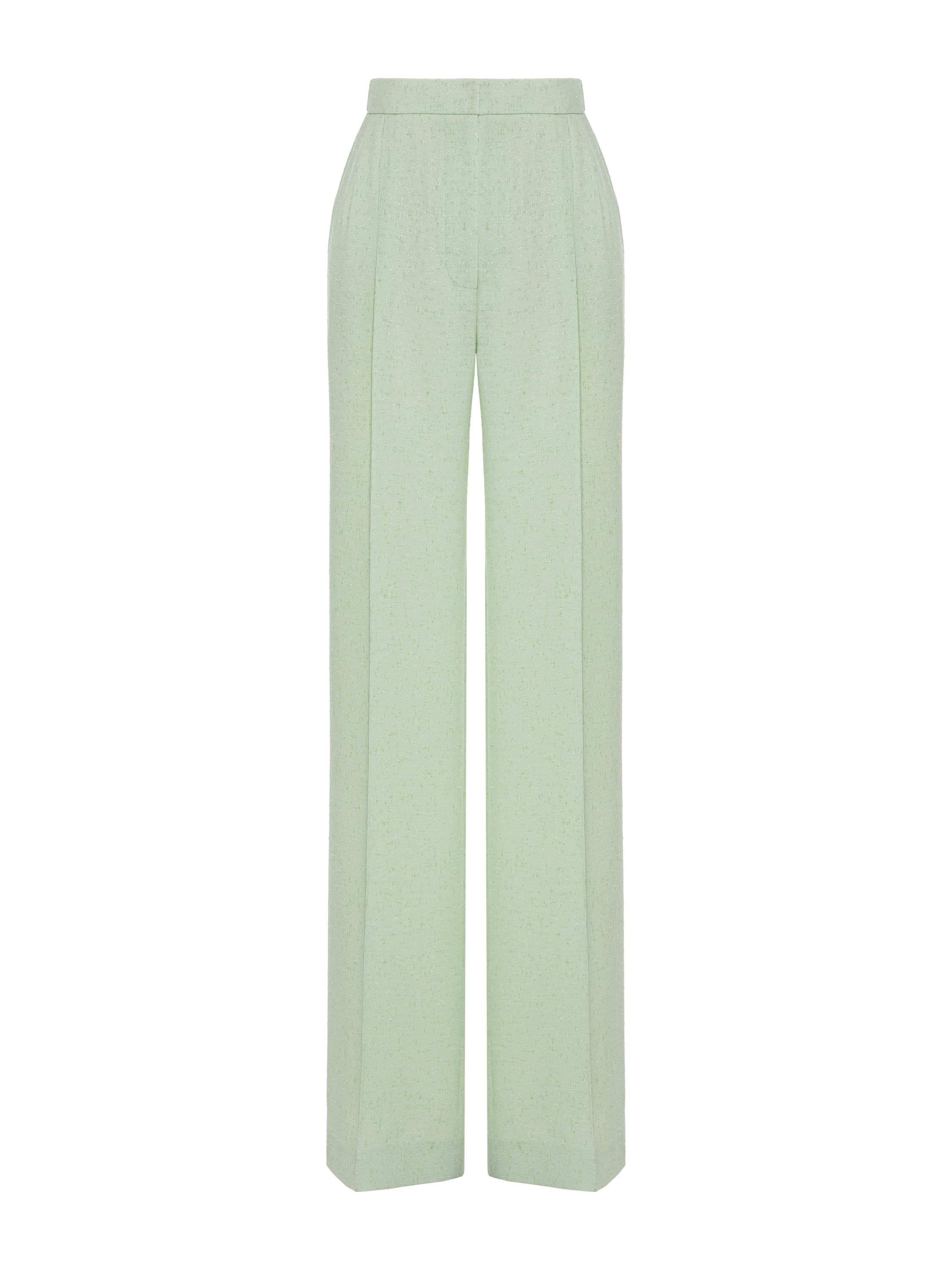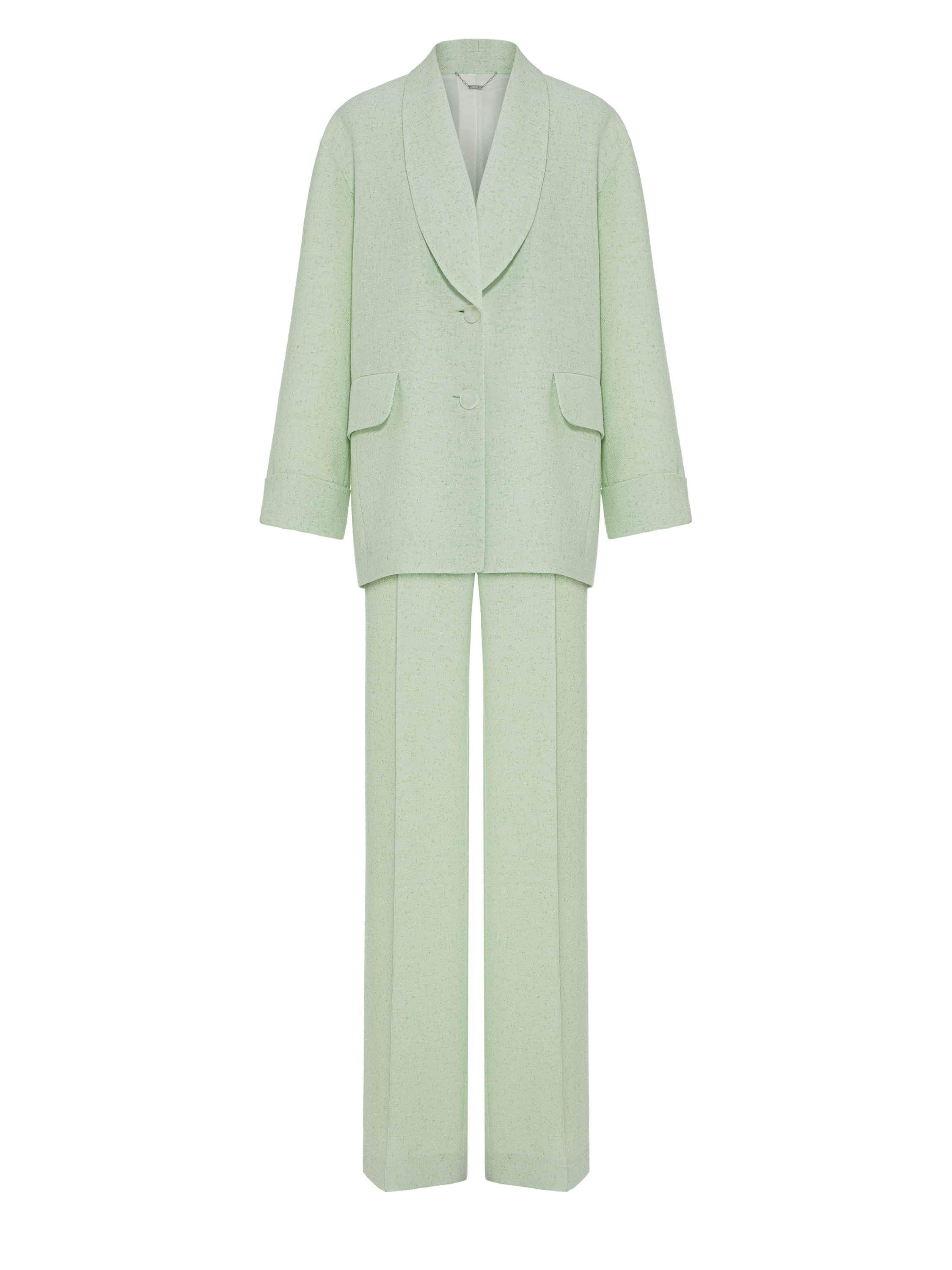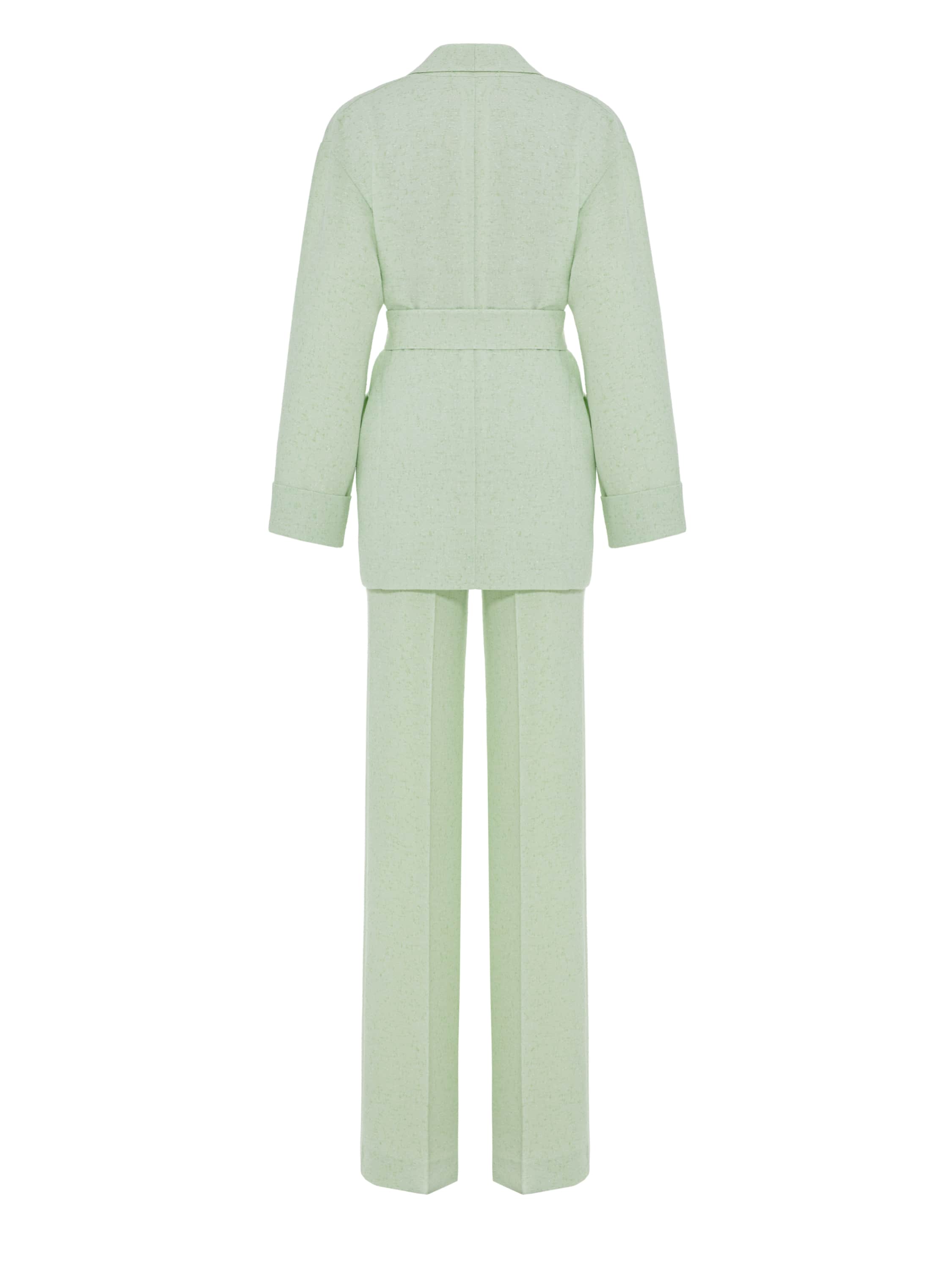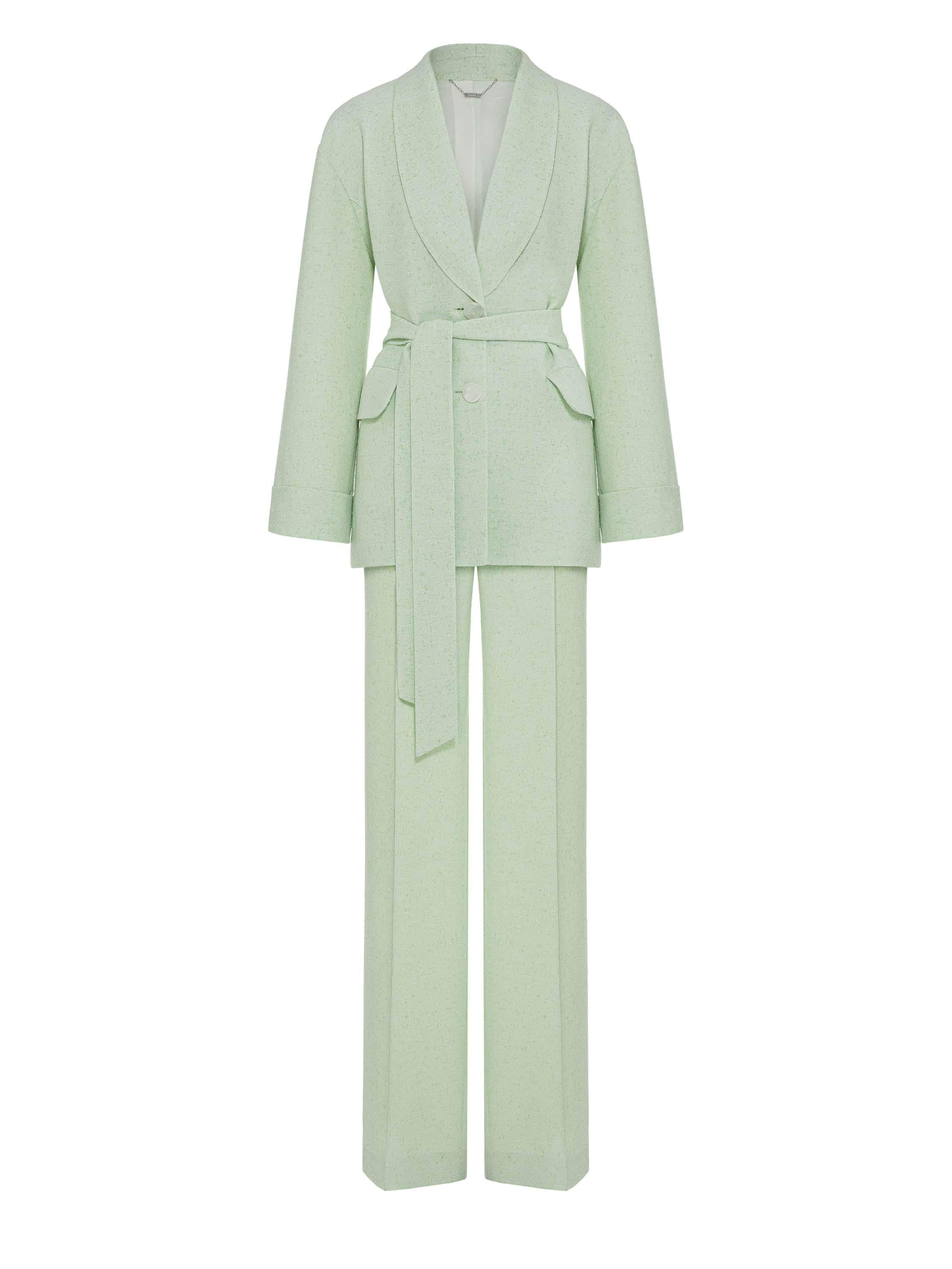 The light green tweed two-piece suit consists of a single-breasted jacket with a belt and straight-leg trousers. The laconic set is suitable both for a formal event and for a business meeting.
