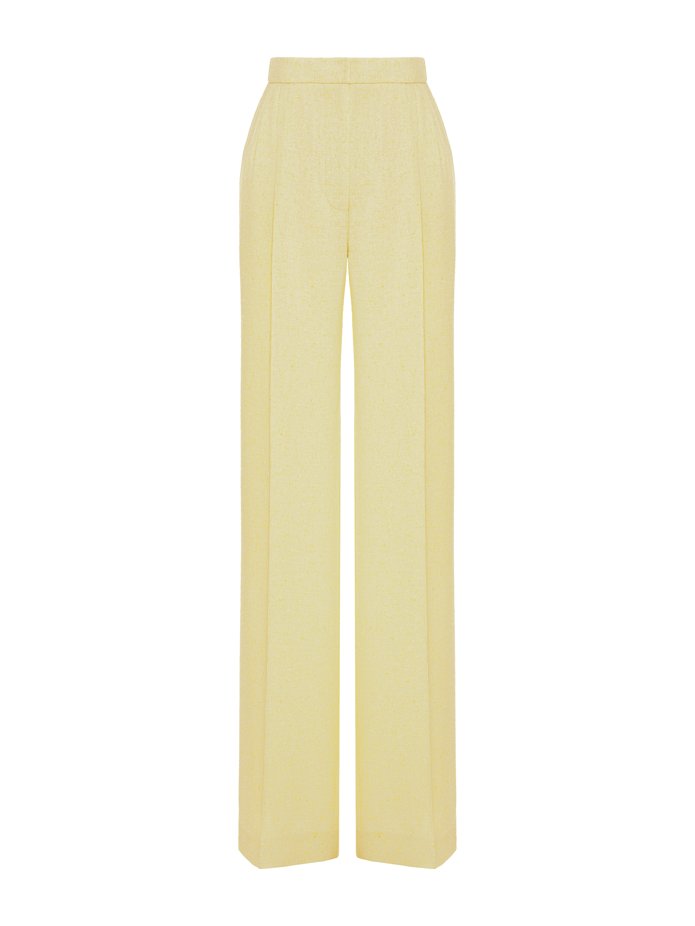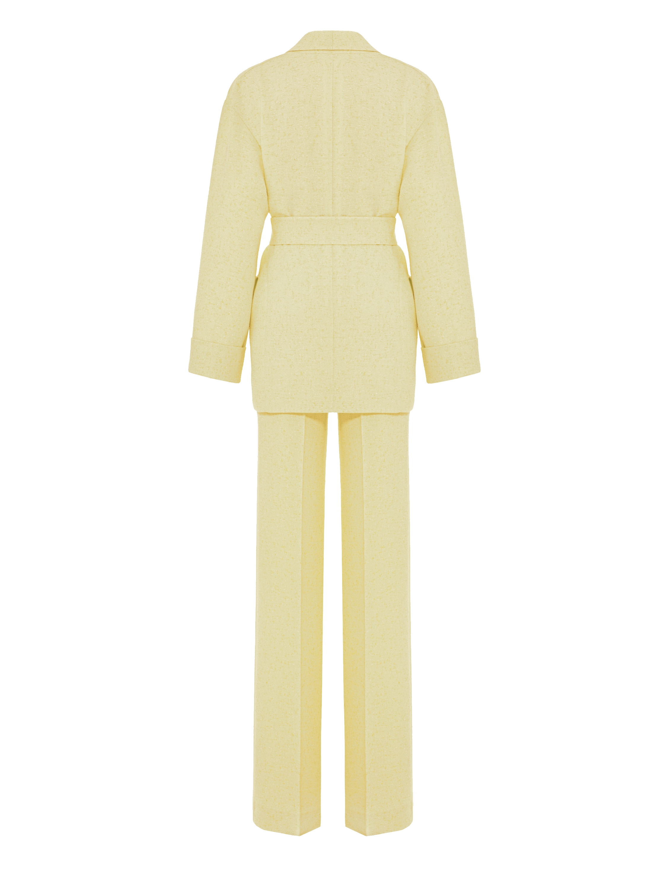 The yellow tweed two-piece suit consists of a single-breasted jacket with a belt and straight-cut trousers. The laconic set is suitable both for a formal event and a business meeting.