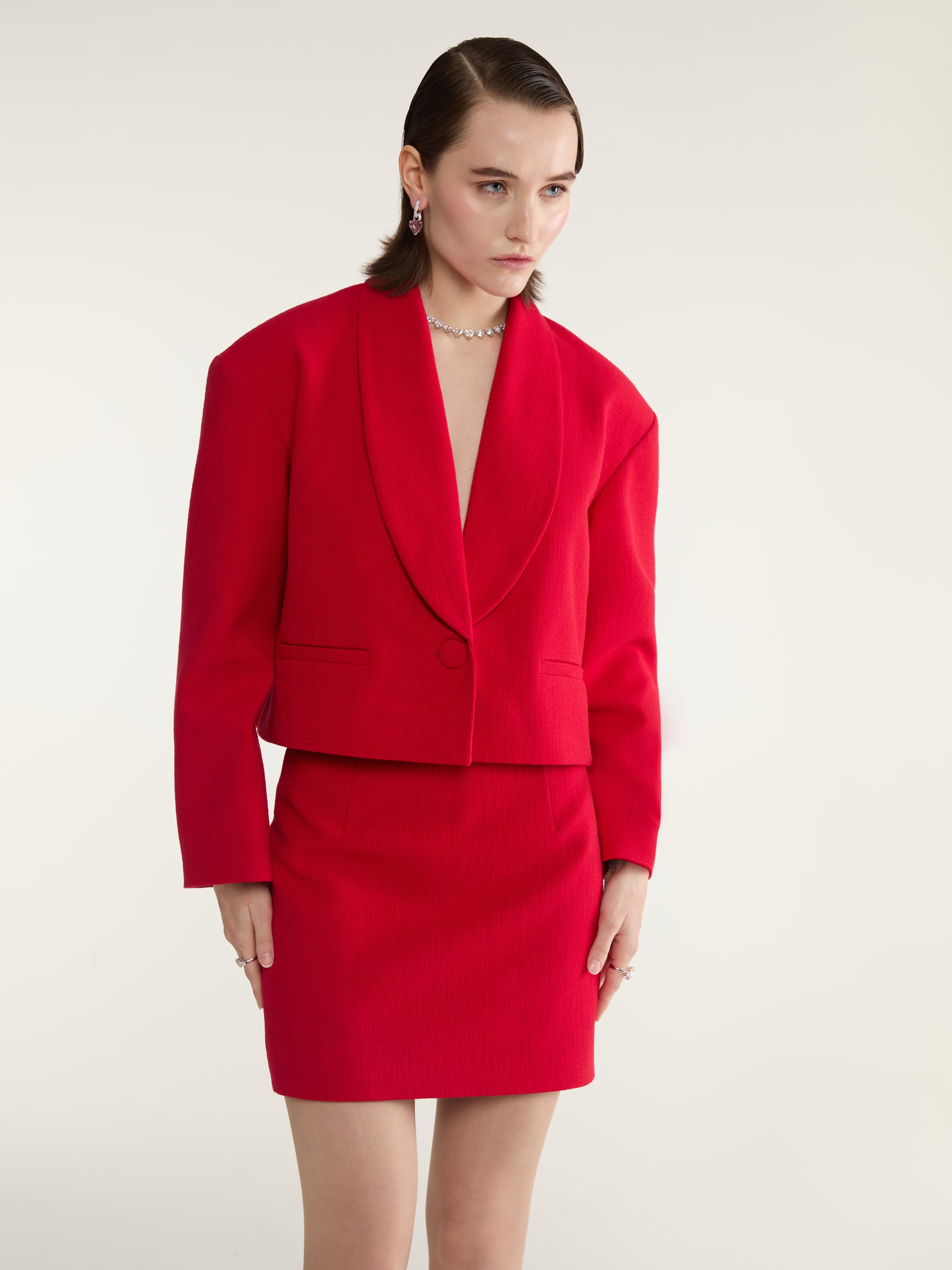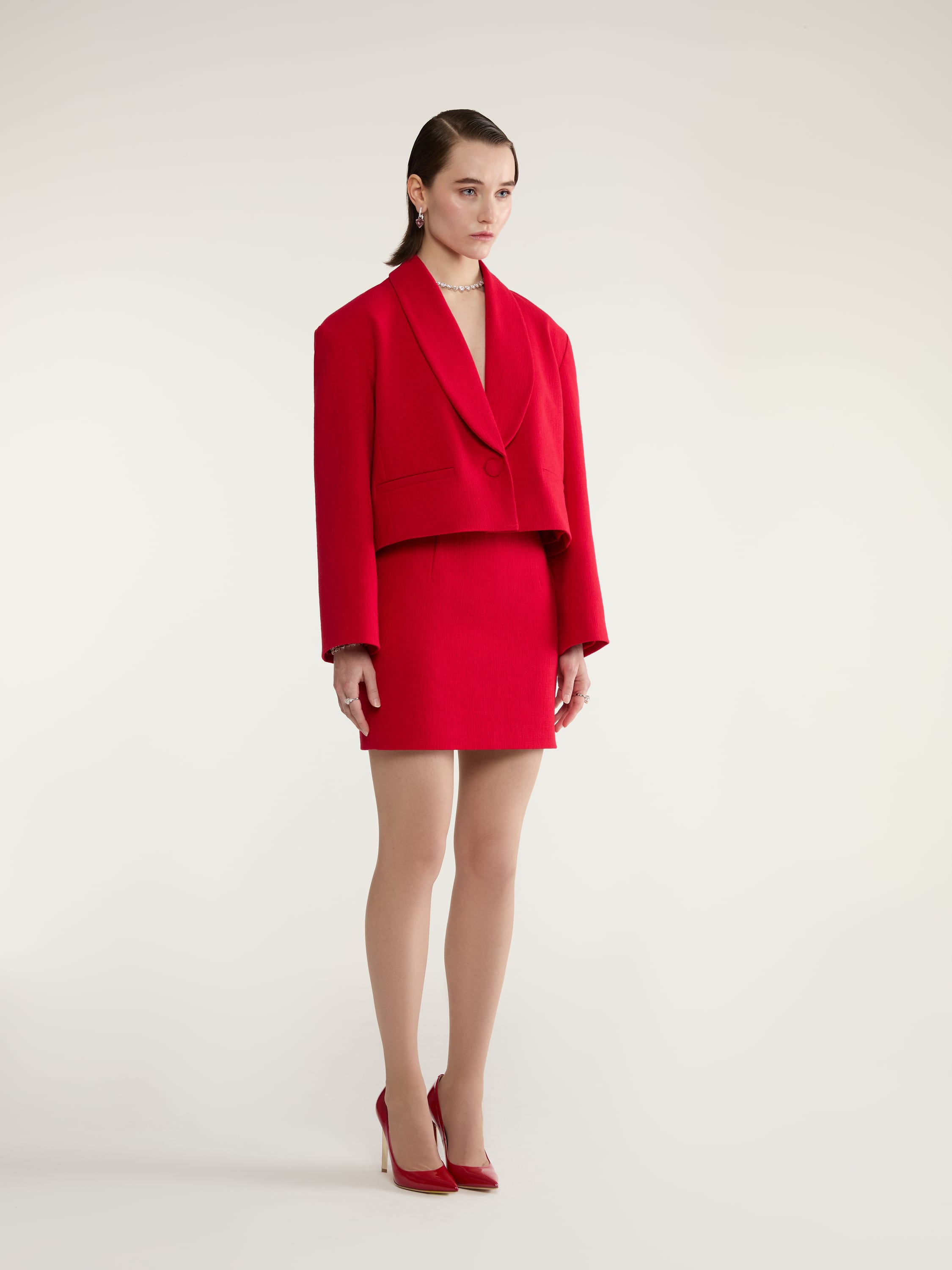 A bright red two-piece suit consists of a cropped single-breasted jacket with a shawl collar and a mini skirt. The set from the new collection can become a spectacular everyday option that will allow you to advantageously showcase your figure.