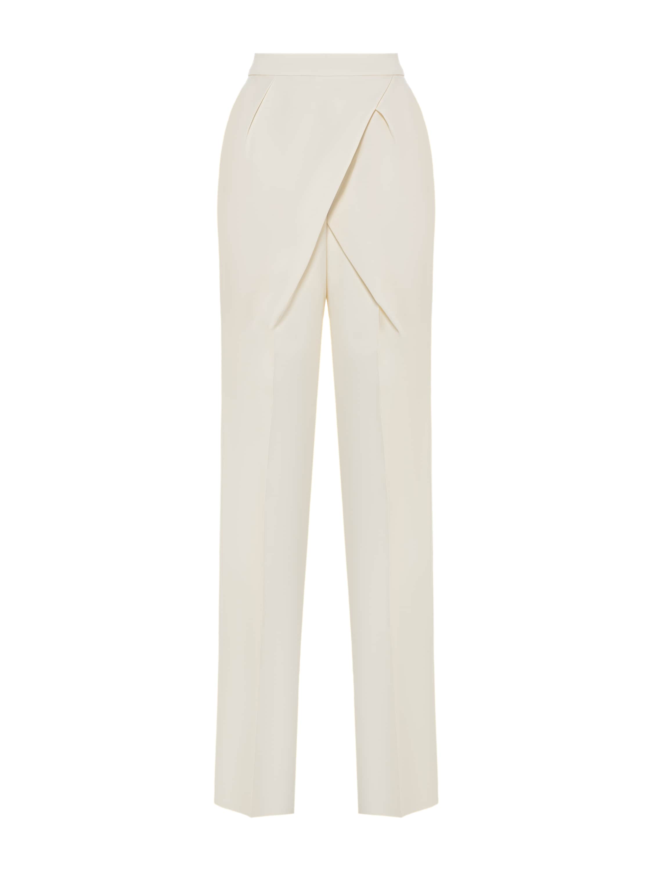 A solid-colored two-piece suit in a delicate milky shade in an Asian style consists of a cropped jacket with a stand-up collar and wrap trousers. The set looks original and allows you to show off maximum femininity.