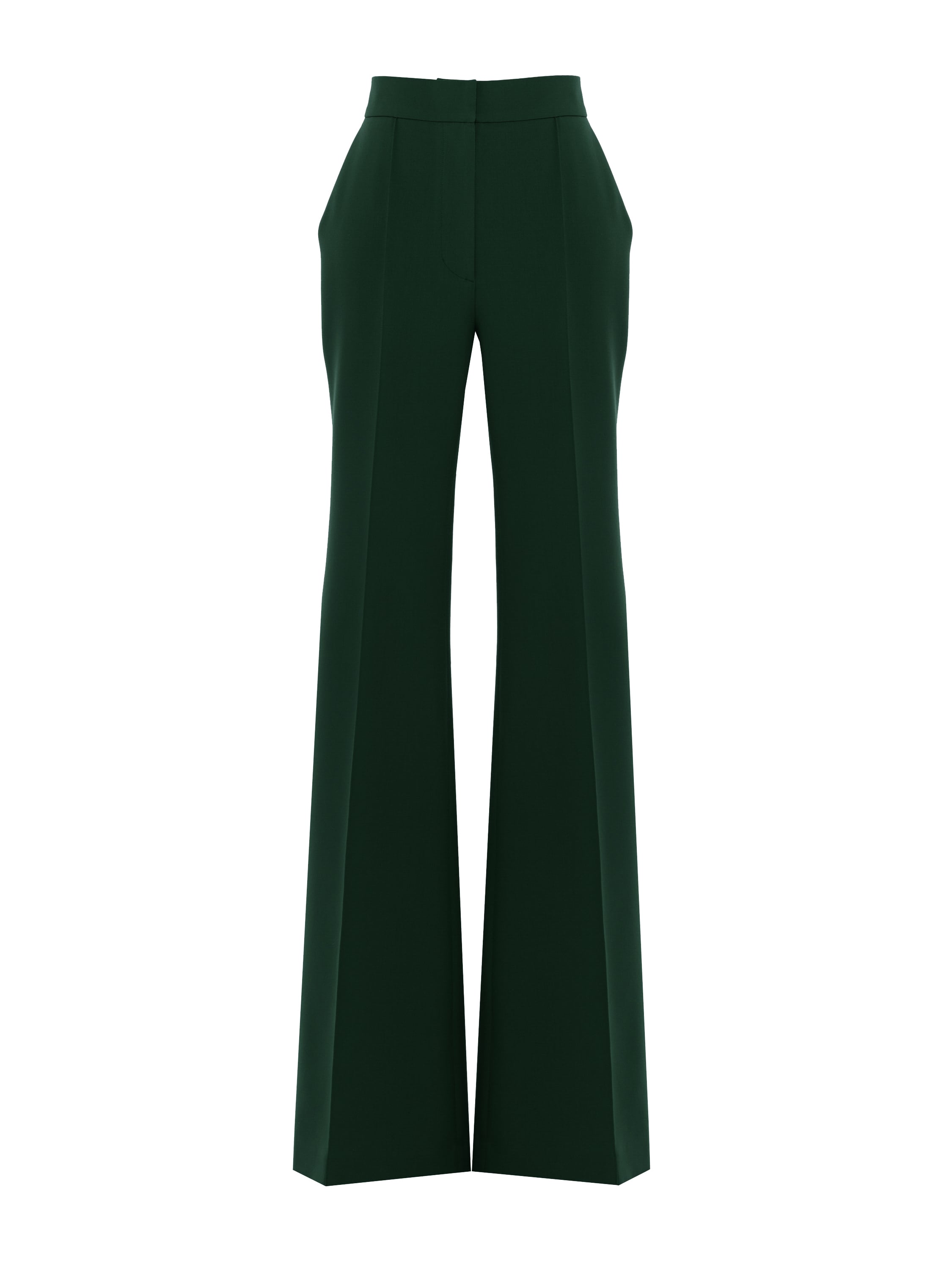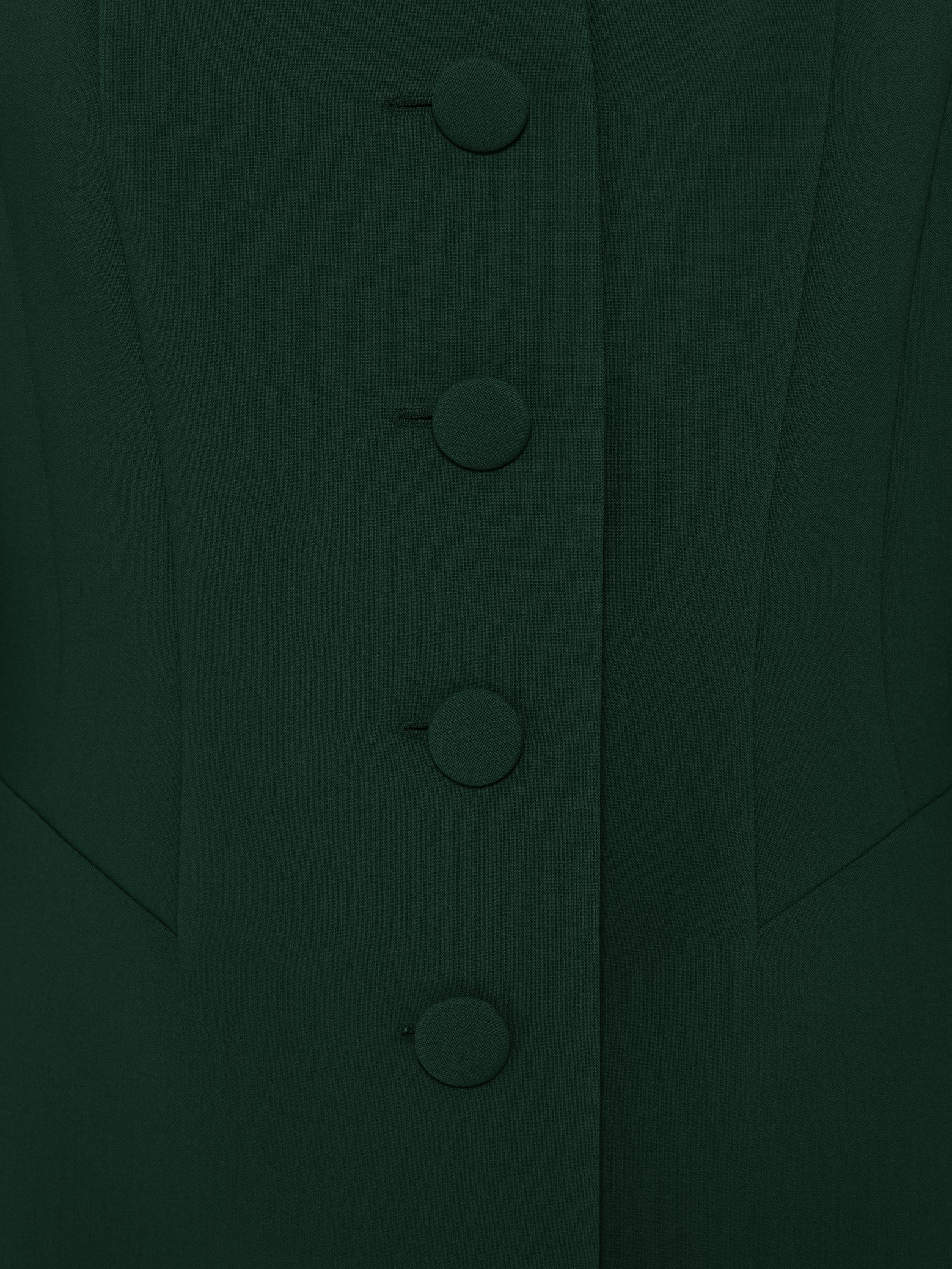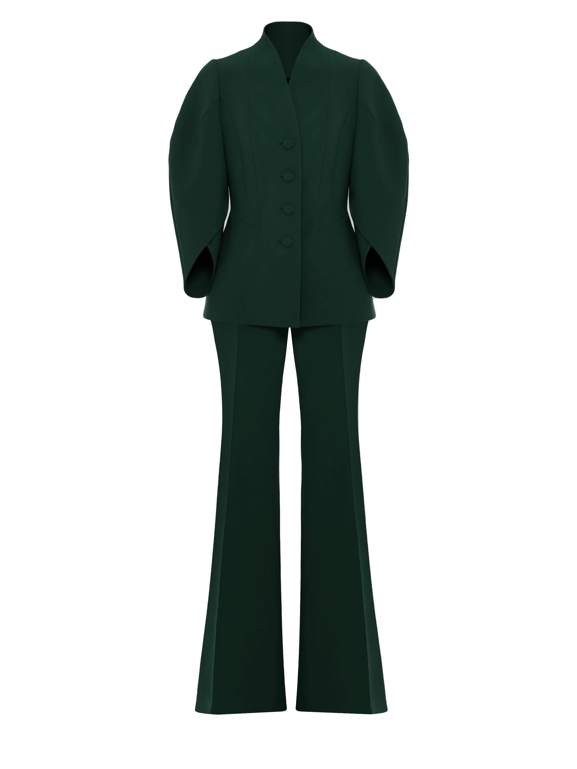 The green two-piece suit consists of a single-breasted jacket and flared, crease-pressed trousers. The fitted jacket is complemented by voluminous sleeves and shaped seams. The evening set in oriental style looks original and allows you to show the maximum femininity. Dense cotton blend was used for the piece.