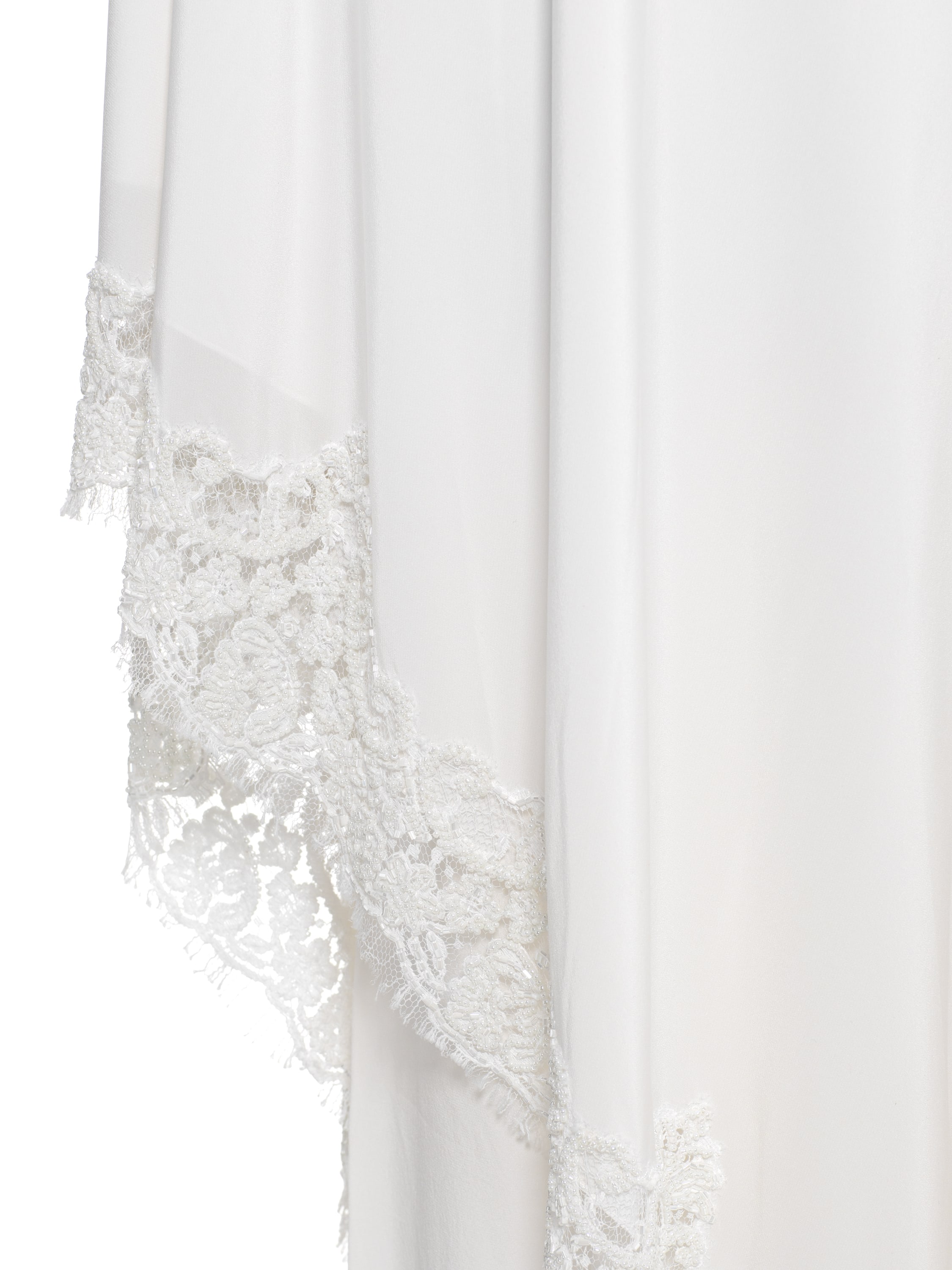 For the set of a one‑shoulder tunic and joggers, white silk fabric was used. The asymmetric cut is accentuated with delicate lace and bead embroidery.