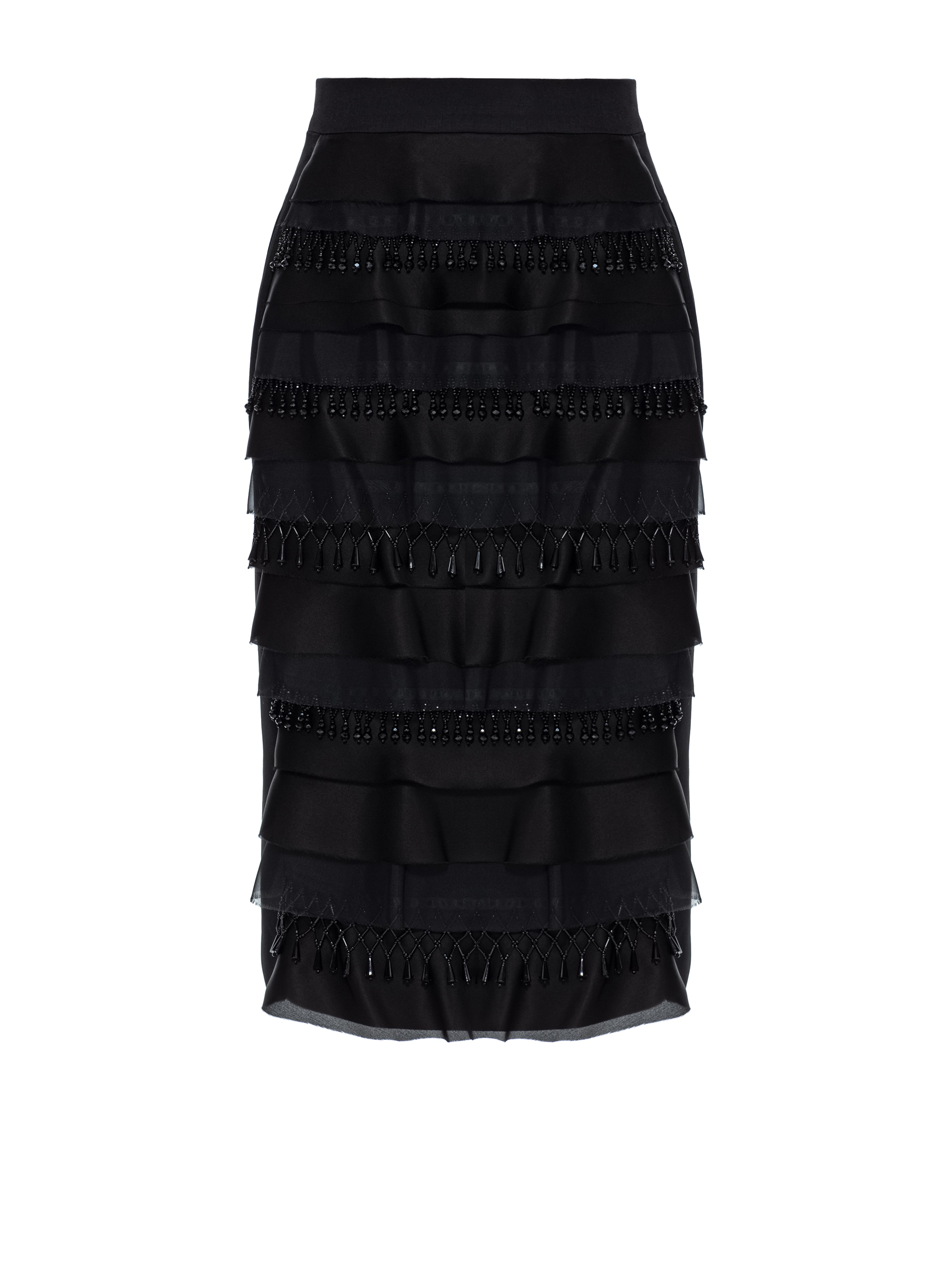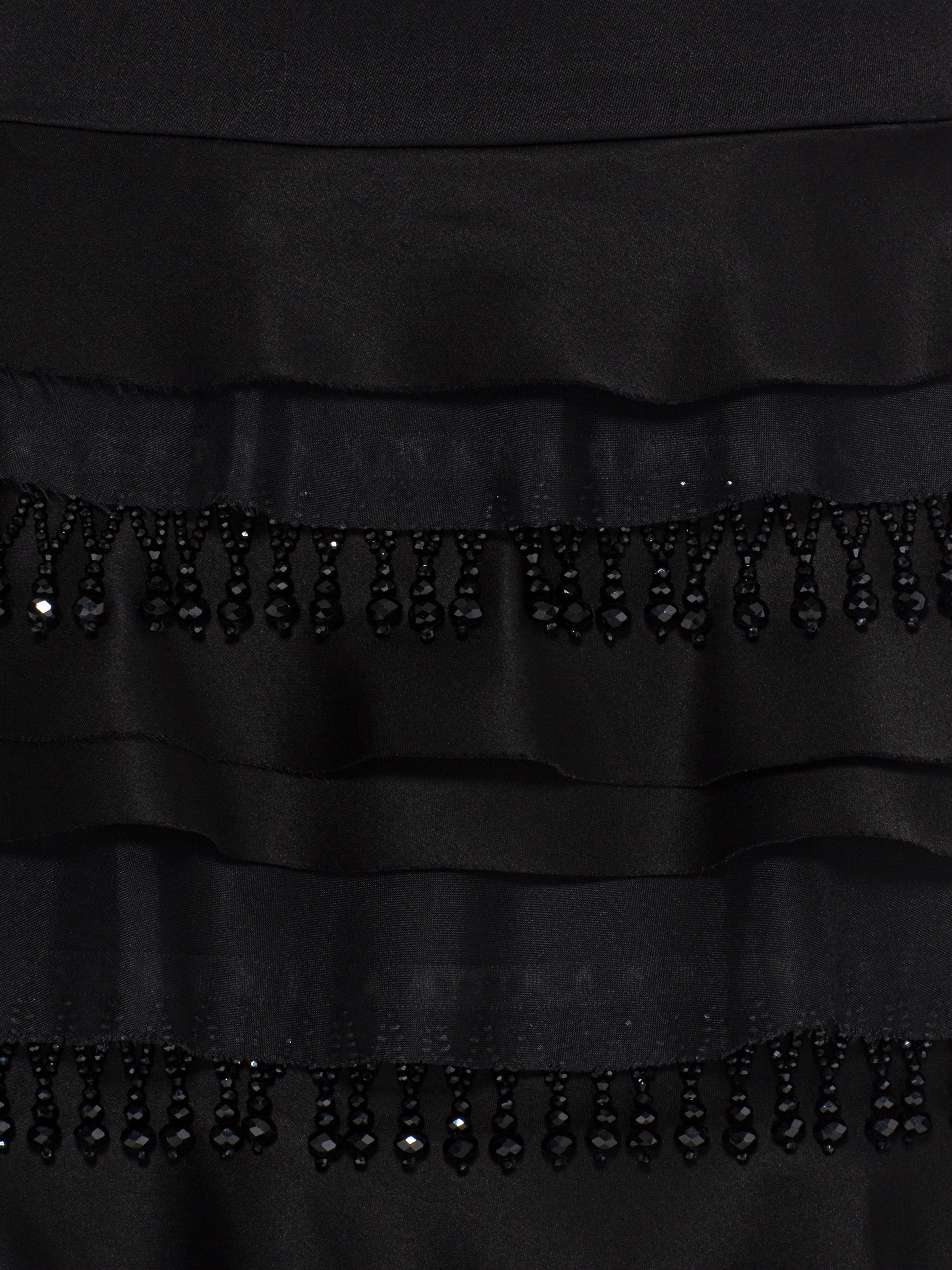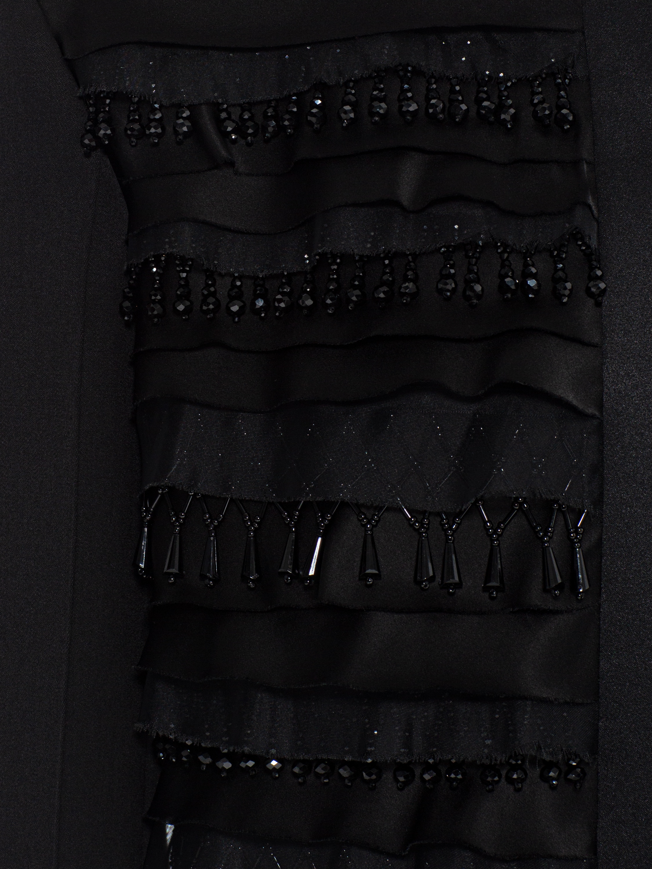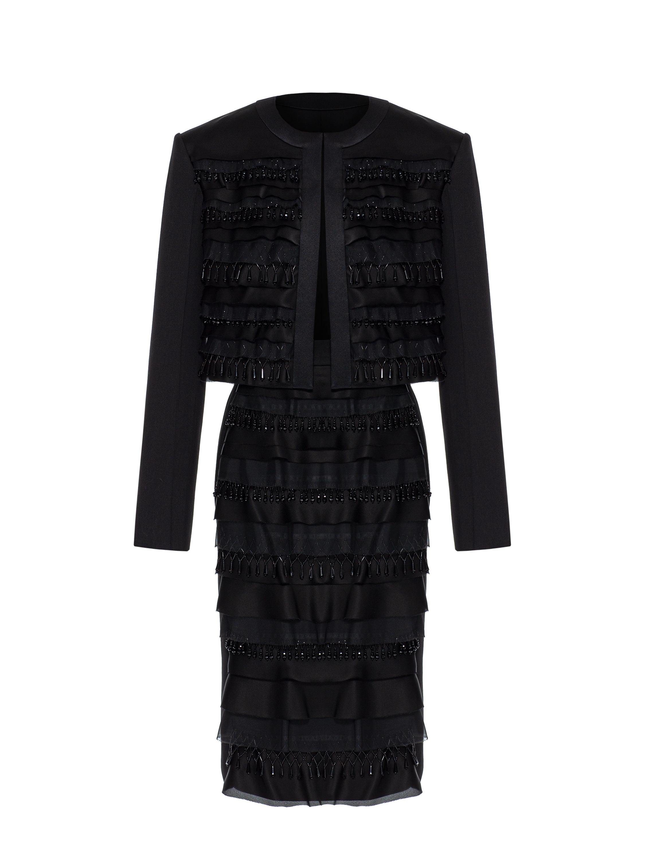 The minimalist black two-piece suit consists of a cropped jacket and a midi skirt. The set is decorated with textured organza tiers and handcrafted beaded fringe.