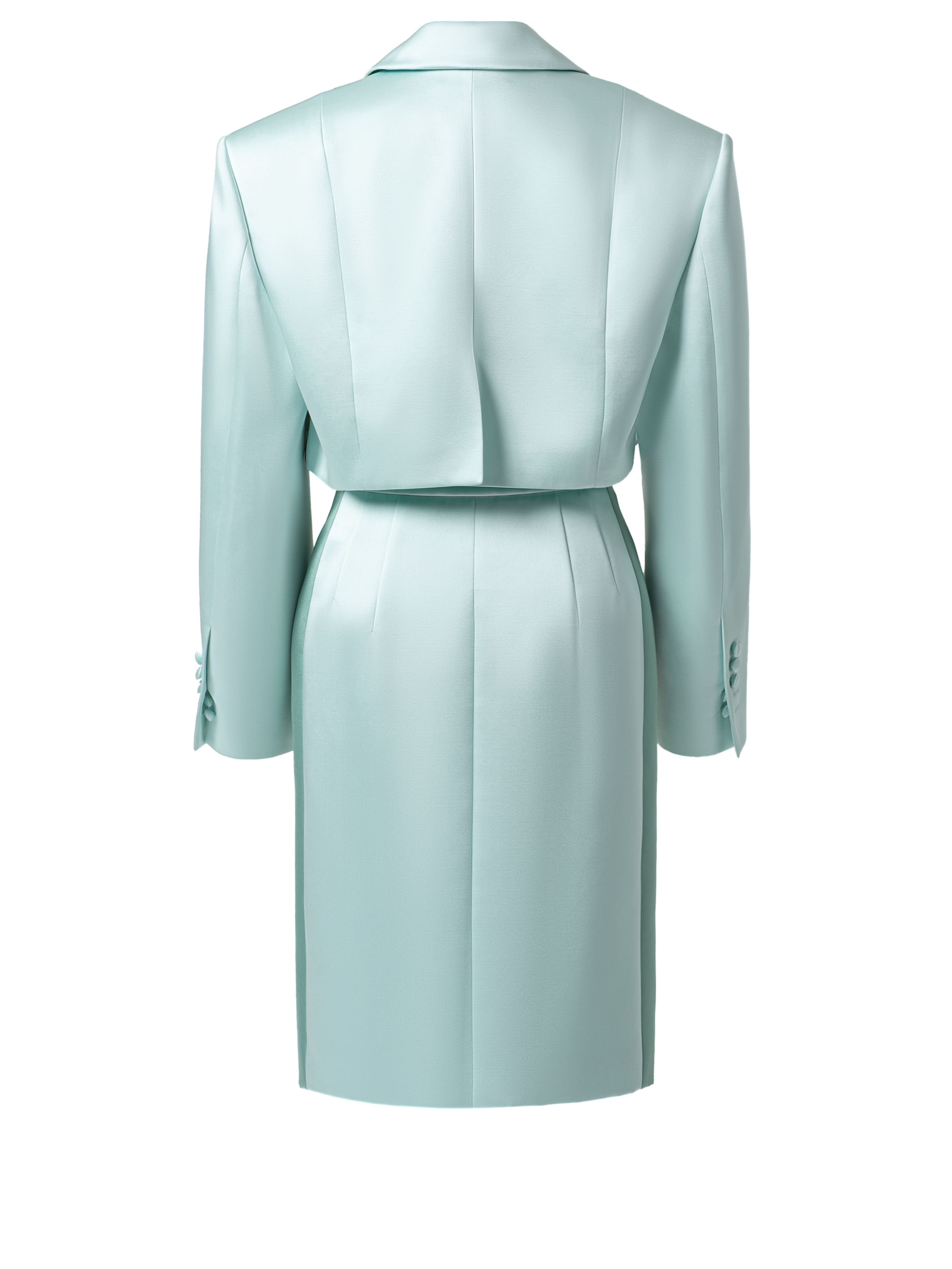 A mint‑green two‑piece suit consisting of a cropped jacket and a midi skirt. The set is made of duchesse and brocade with a floral pattern.