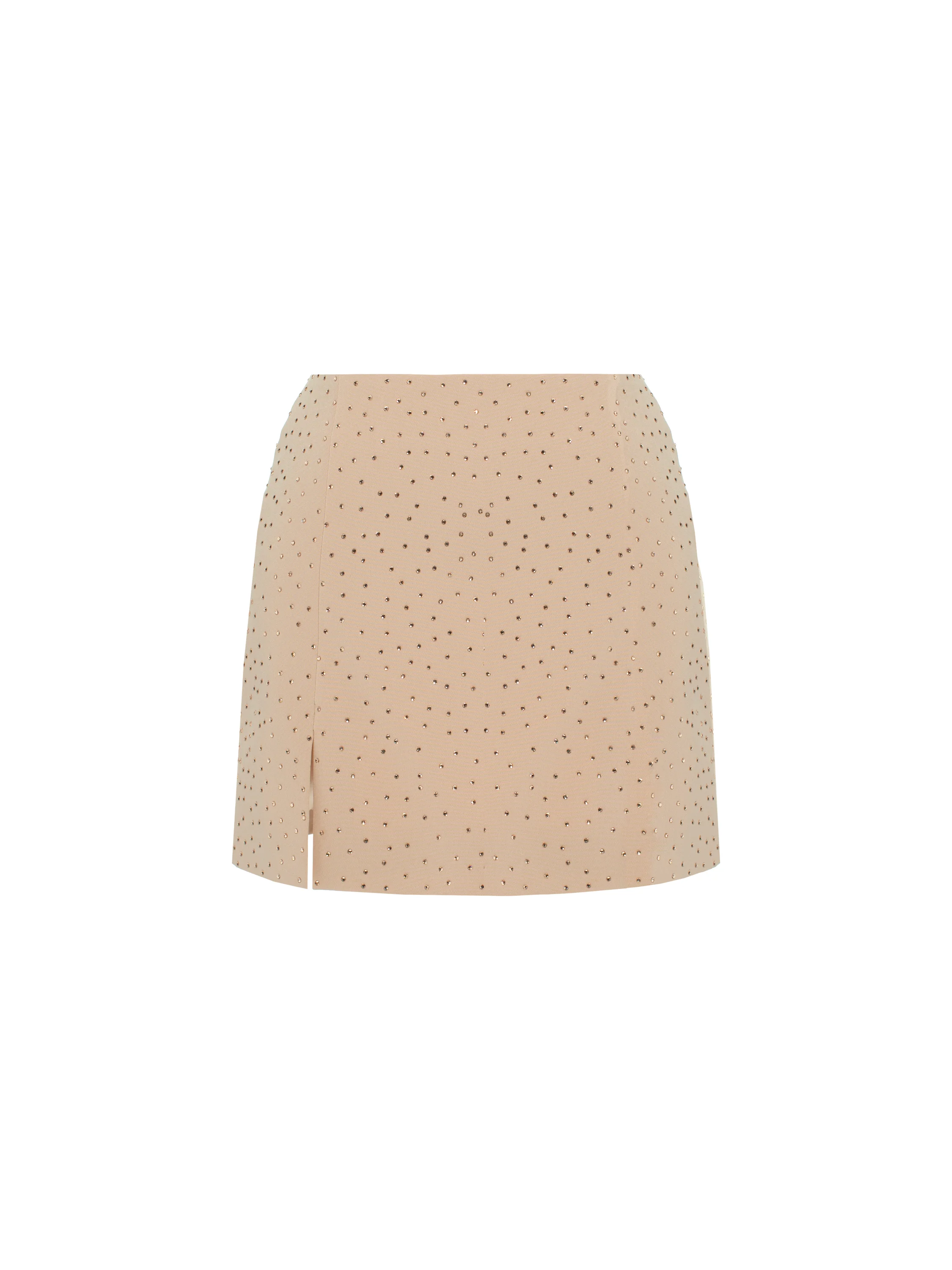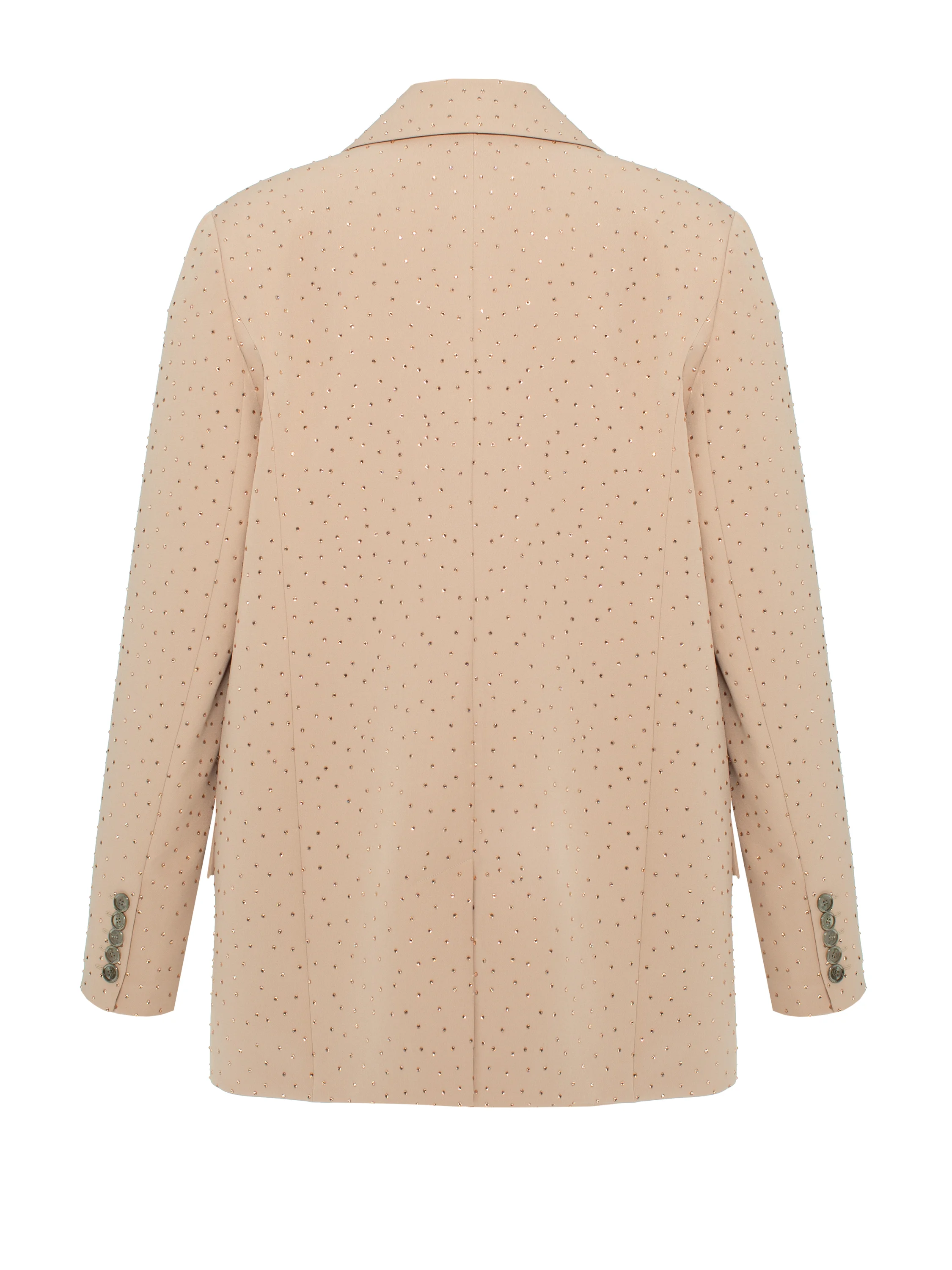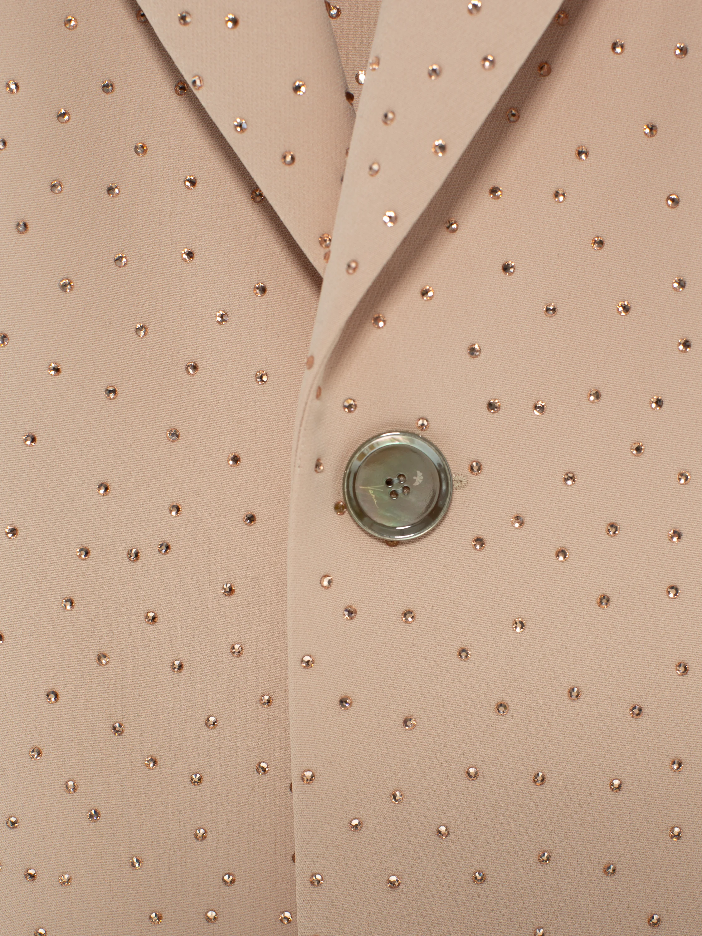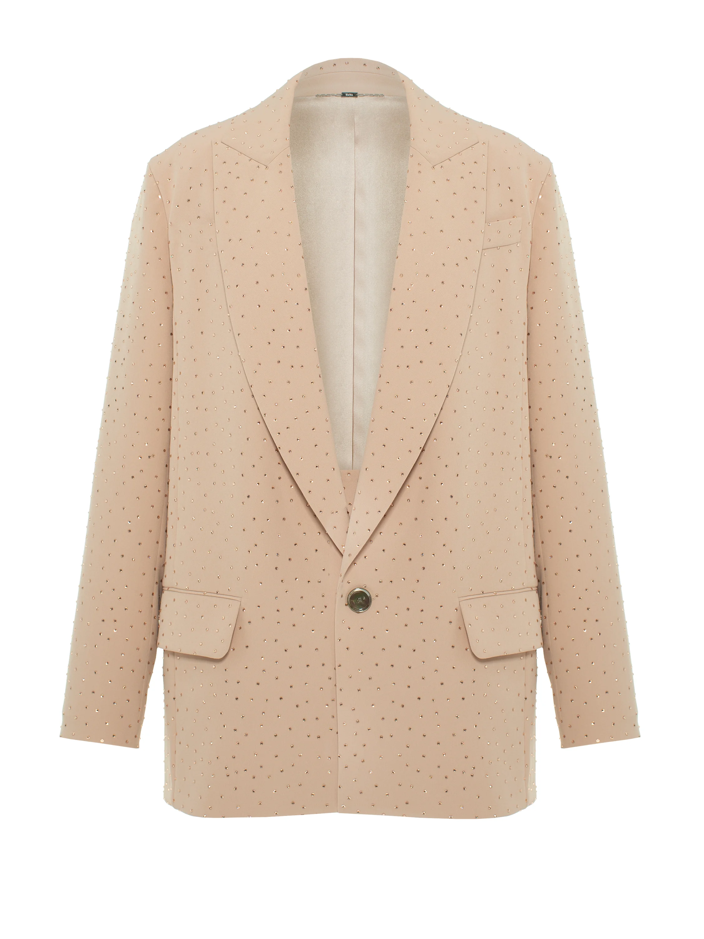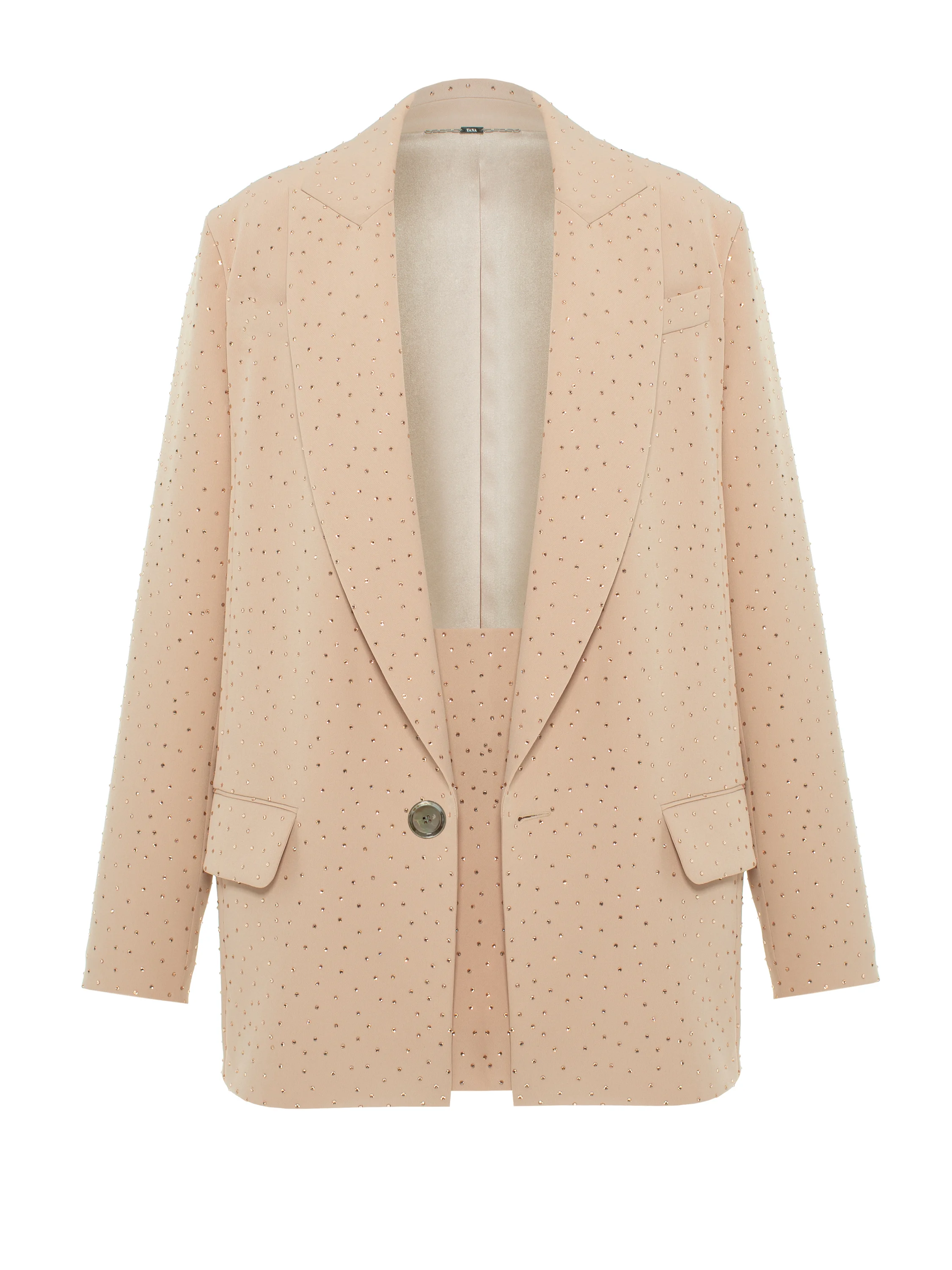 A beige two-piece suit adorned with shimmering Swarovski crystals claims to be a worthy alternative to an evening dress. The suit consists of a single-breasted jacket with shaped lapels and a straight-cut mini skirt with a side slit. The oversized single-button jacket is complemented by patch pockets with flaps on the sides.