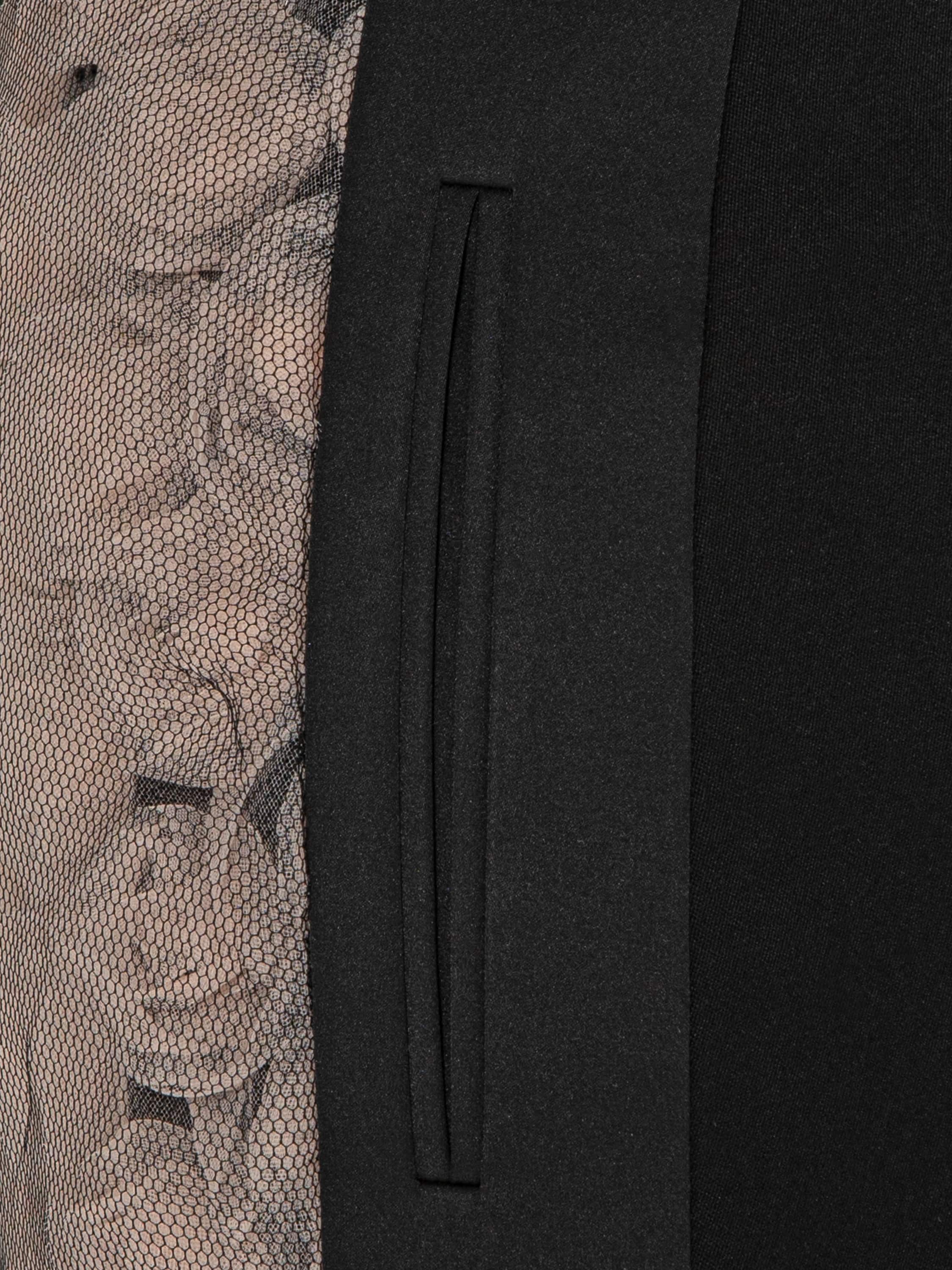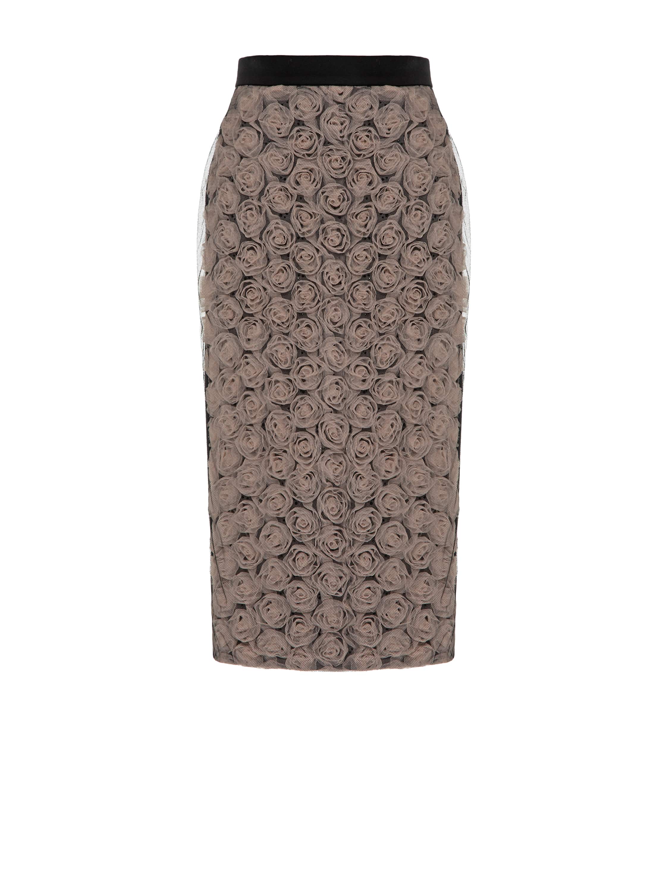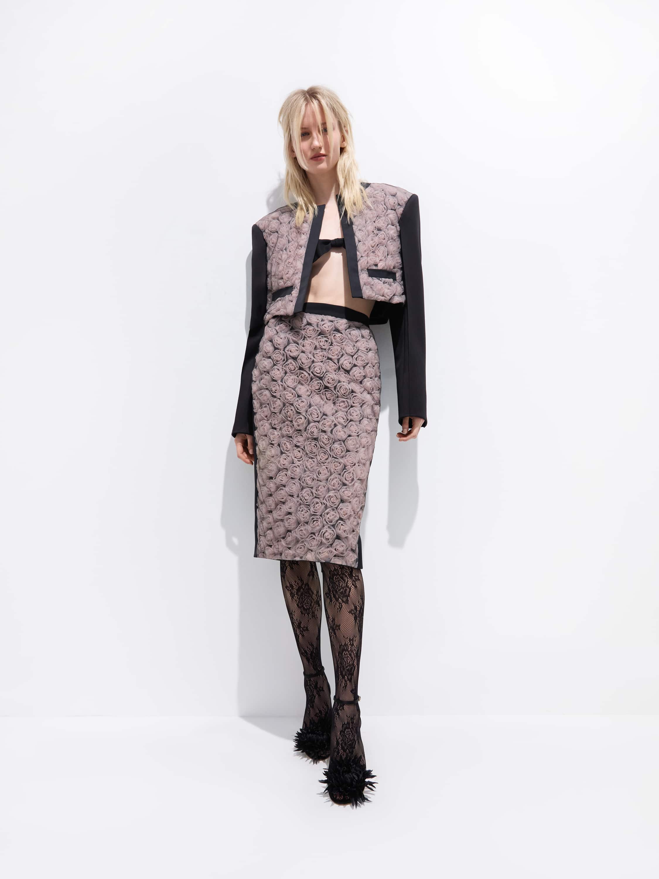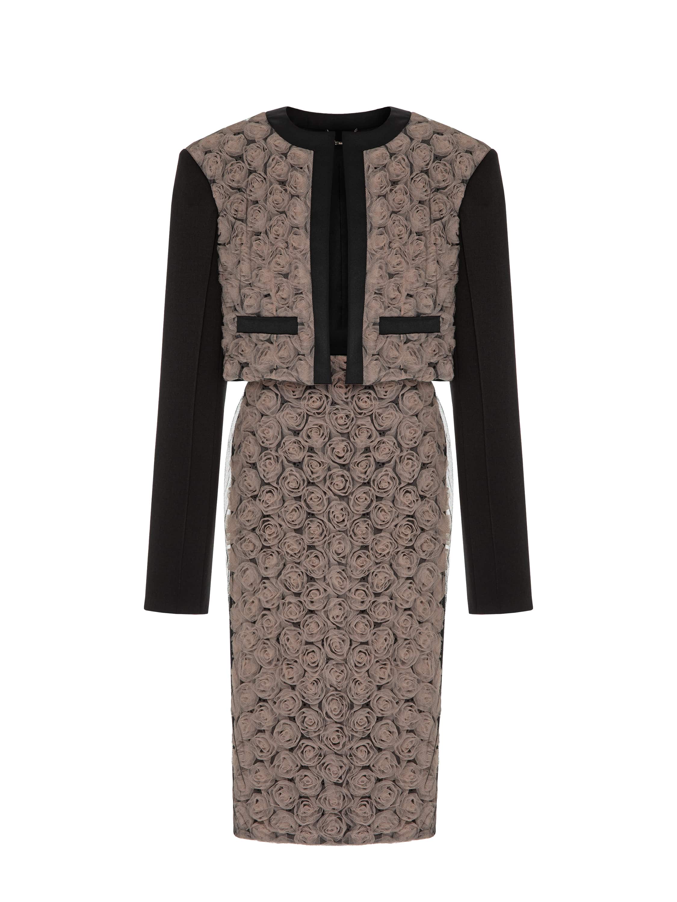 The two-piece suit consists of a cropped jacket and a midi skirt. The suit is made of blended wool and black mesh. The style is decorated with roses in a delicate pink shade.