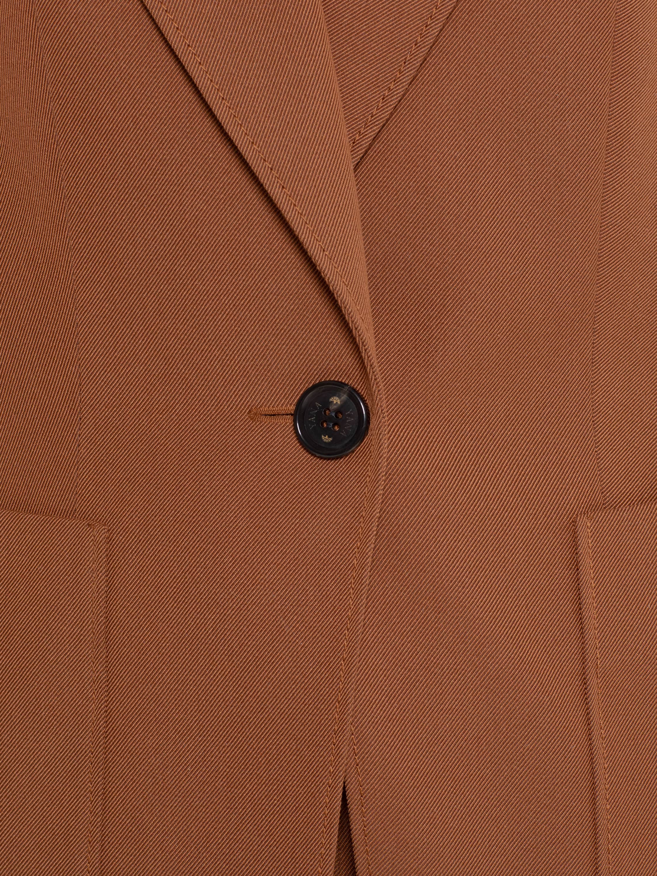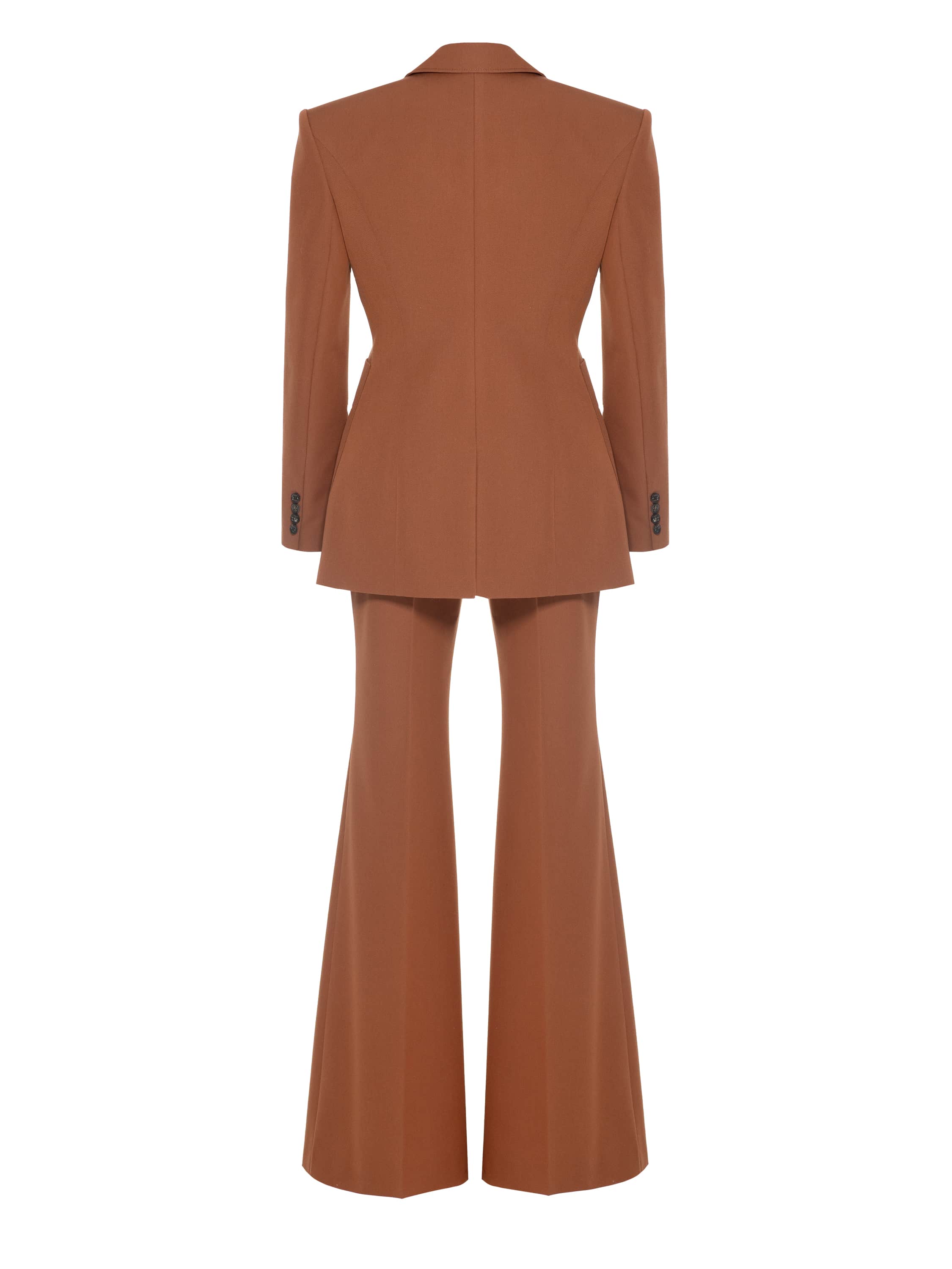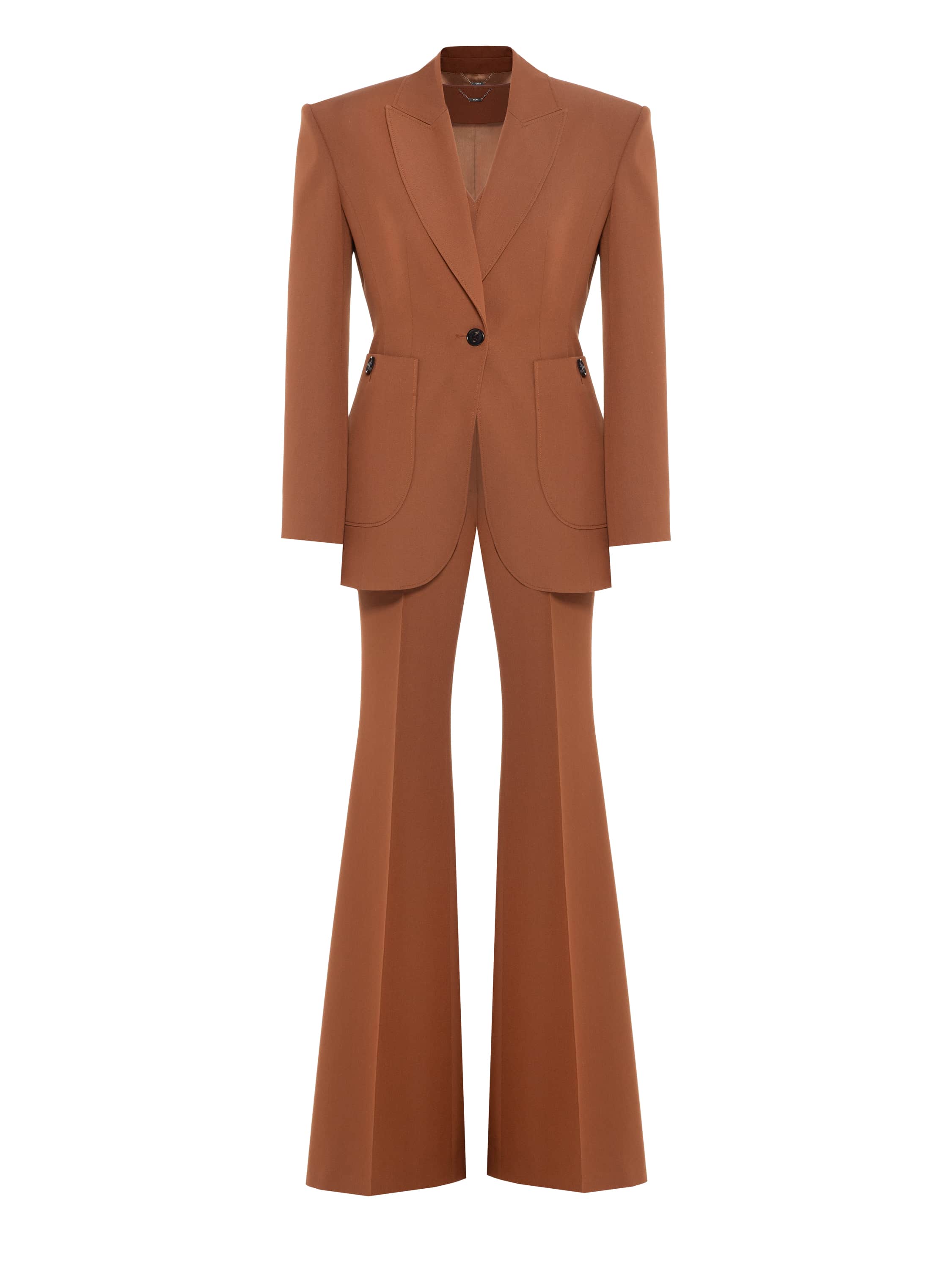 The brown three-piece suit consists of a fitted jacket with shaped lapels, a waistcoat and flared trousers. The monochrome set will help create a trendy business-style look.