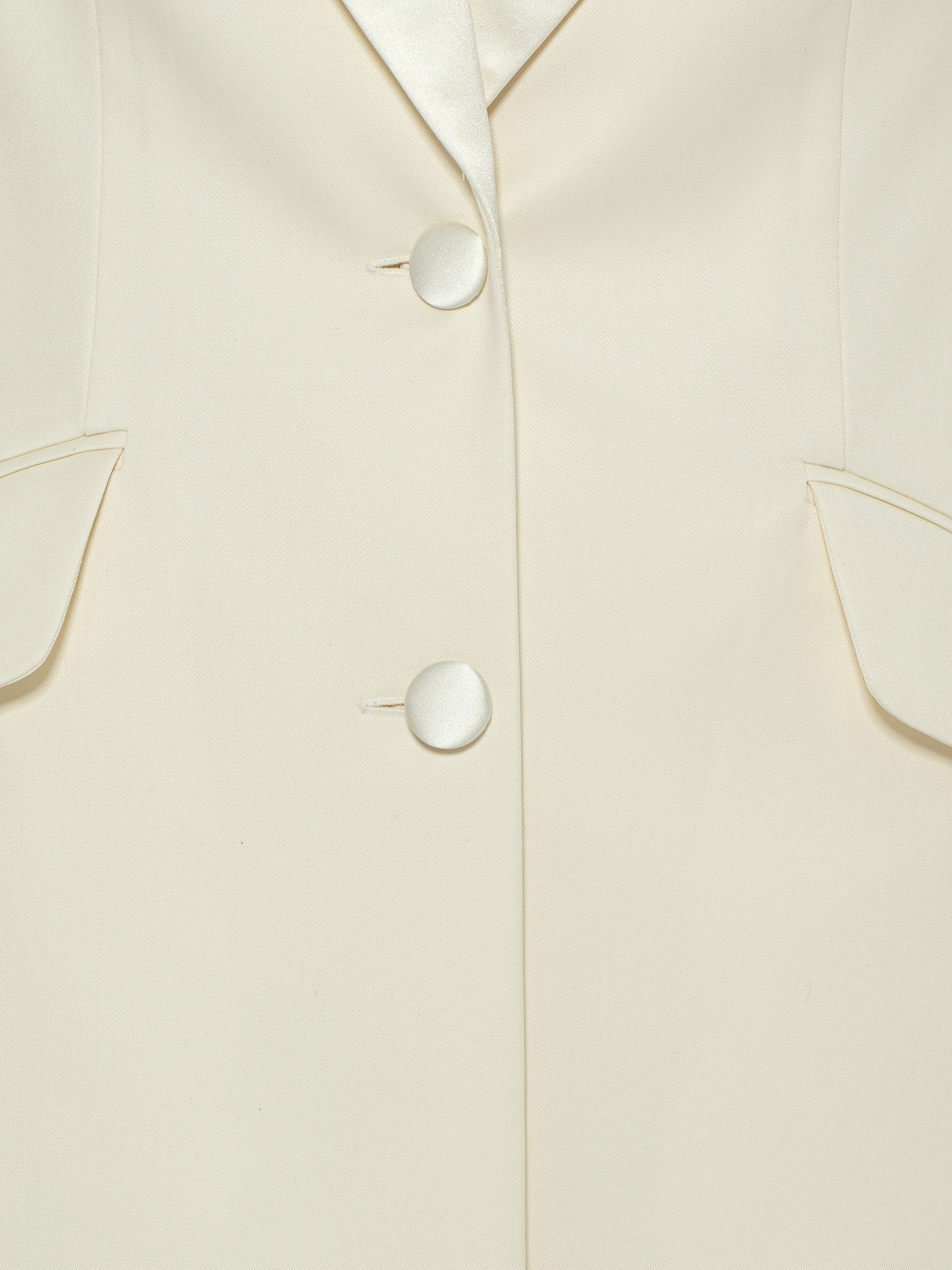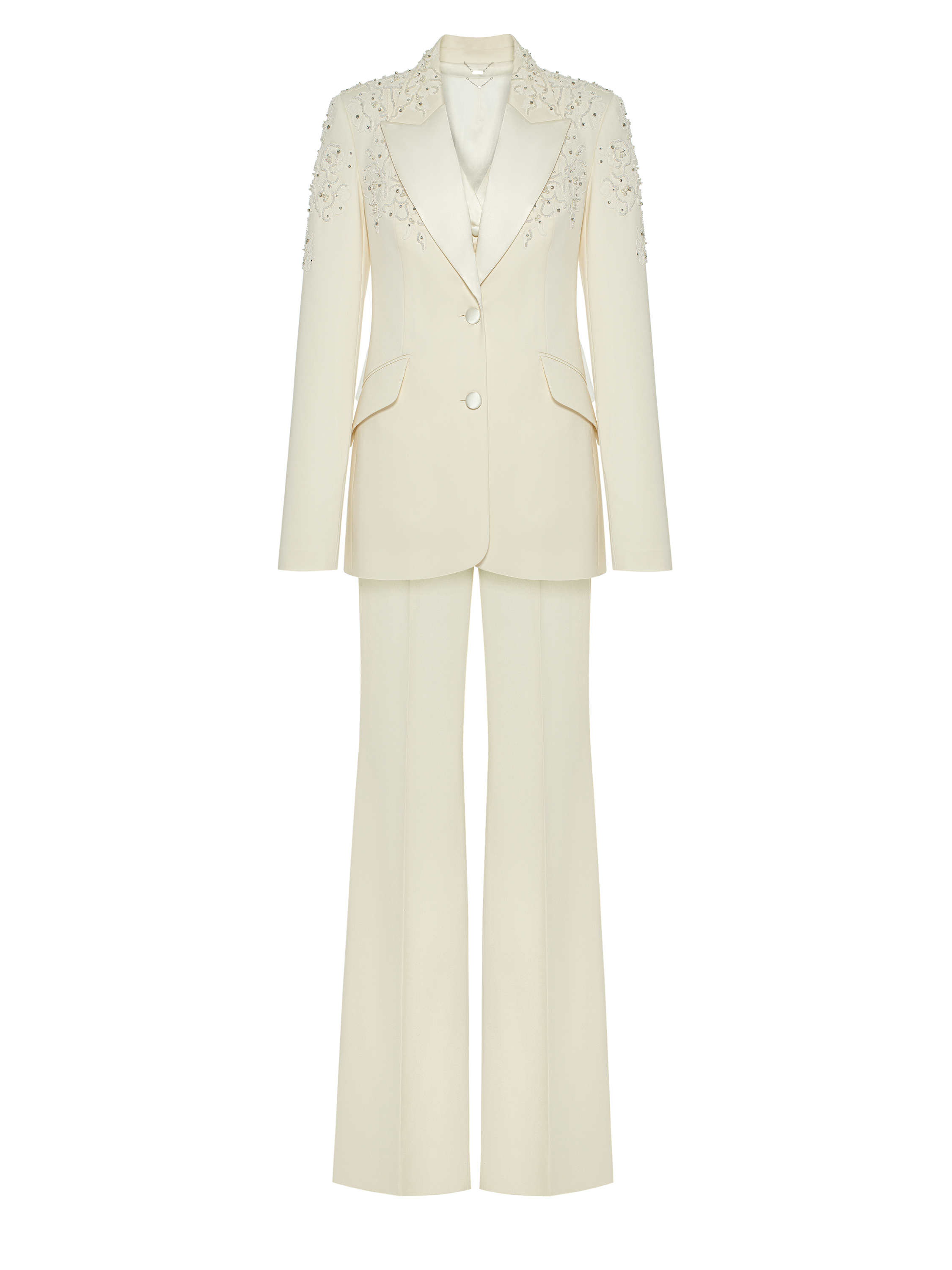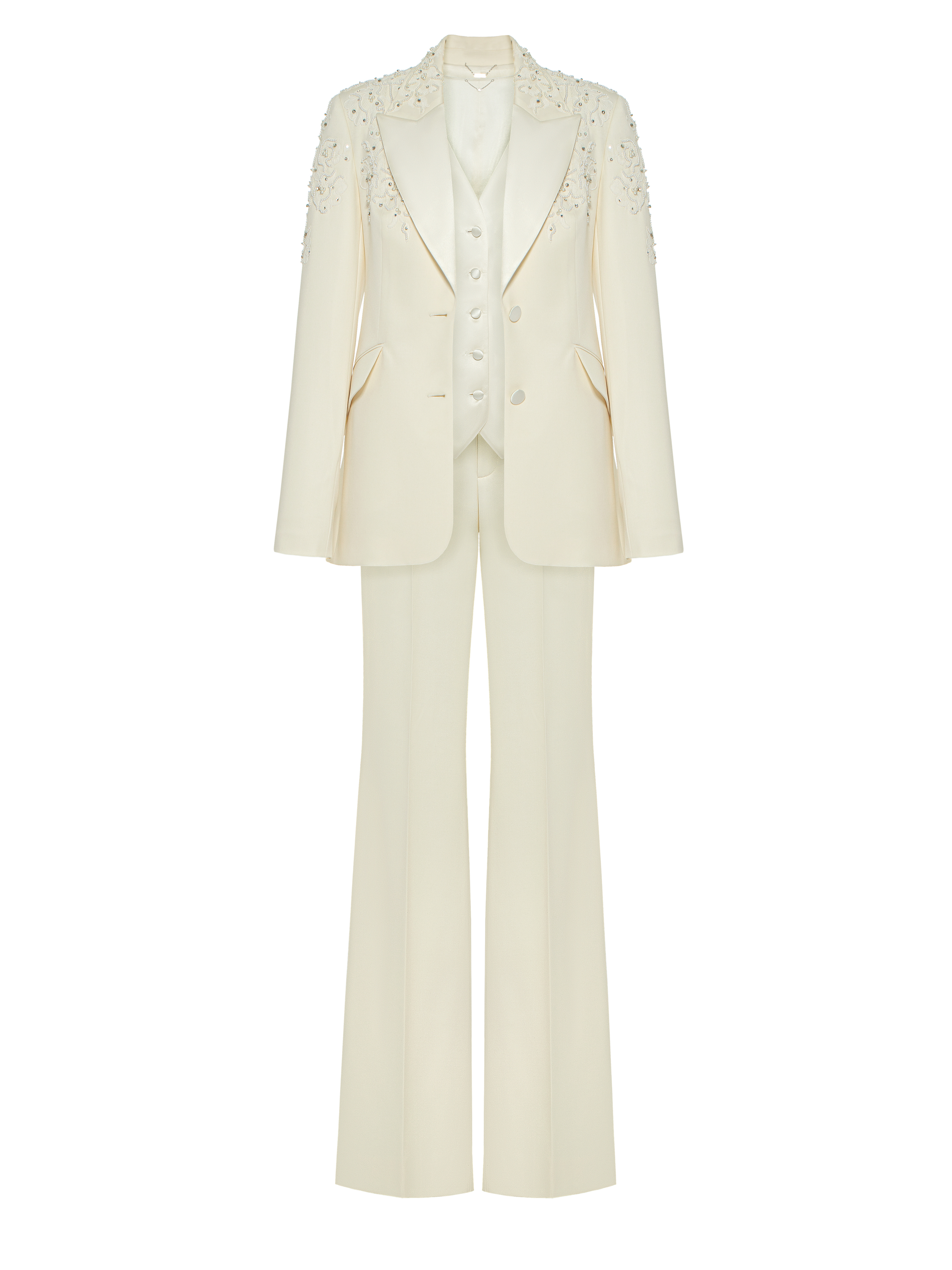 An unconventional approach to the wedding tradition — a three-piece trouser suit, hand-embroidered with lace flowers, pearls and Swarovski crystals.