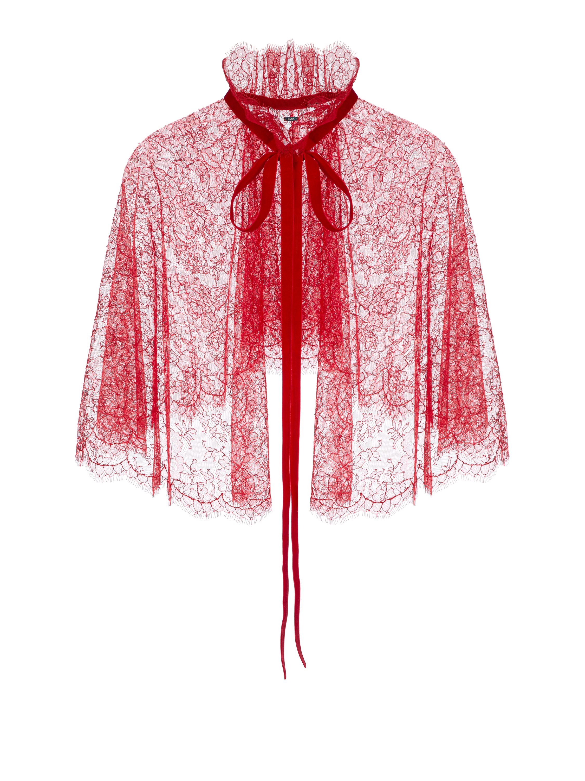 A red cape made of semi-sheer lace. Front velvet ties in a matching shade. The cape will be the perfect finishing touch to a Yana look.