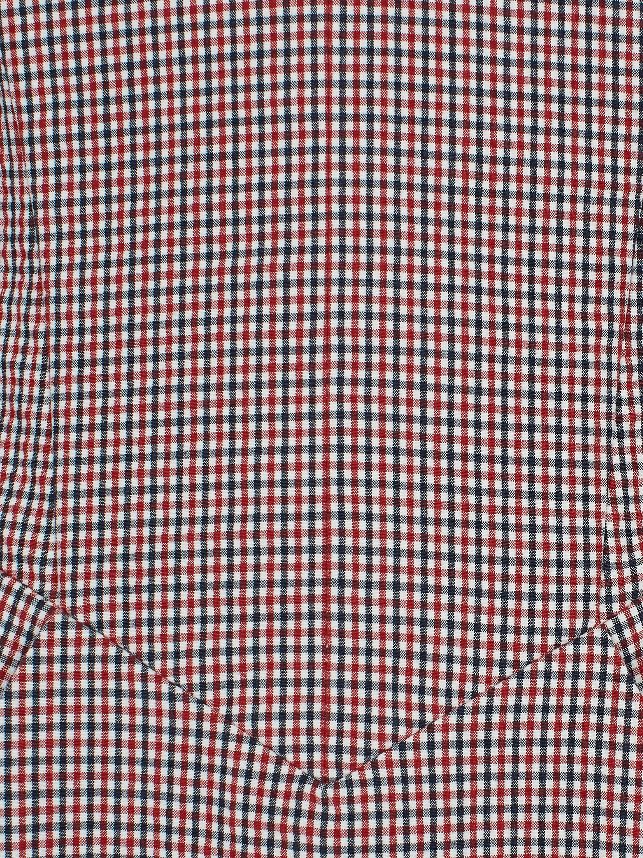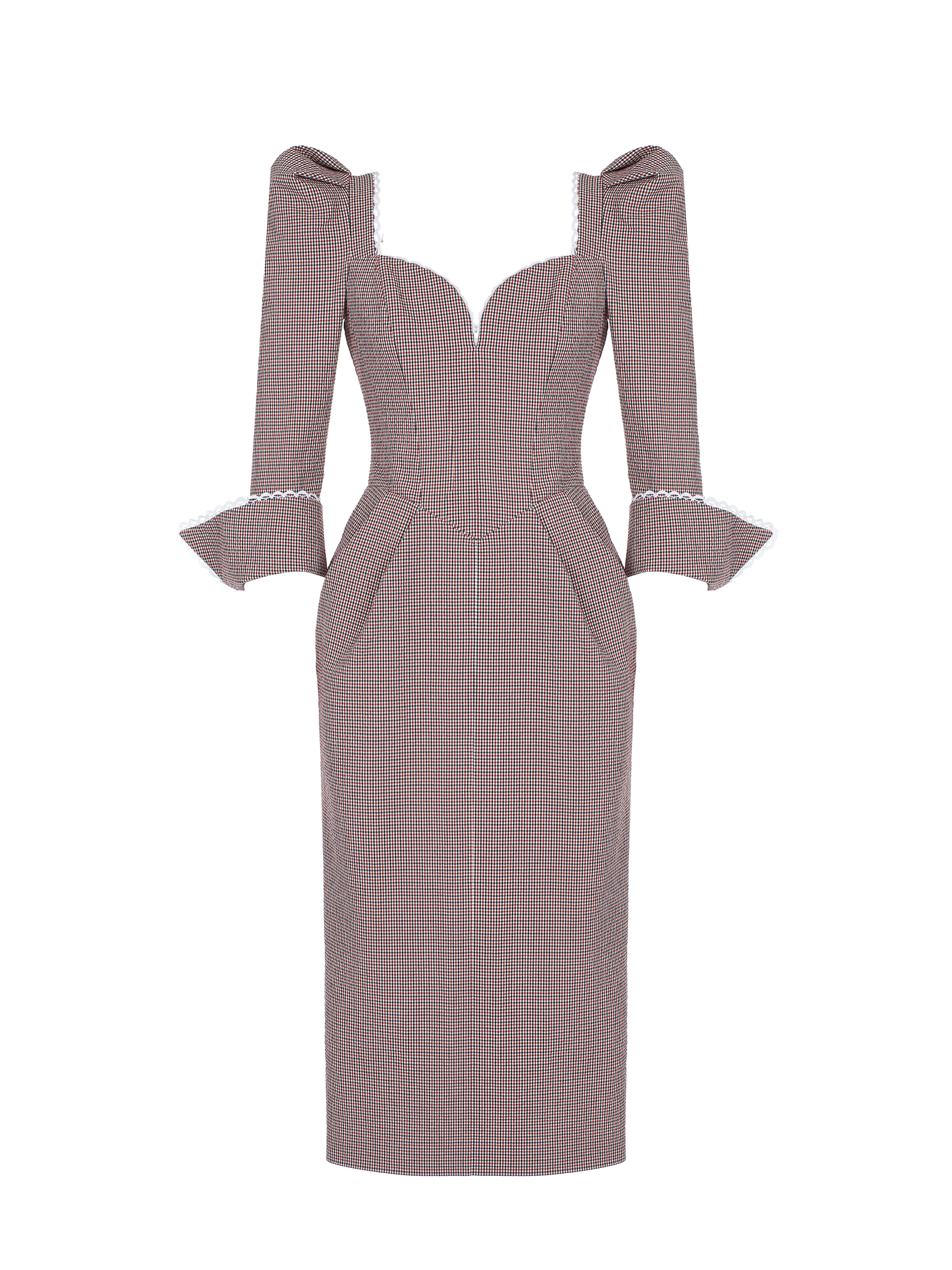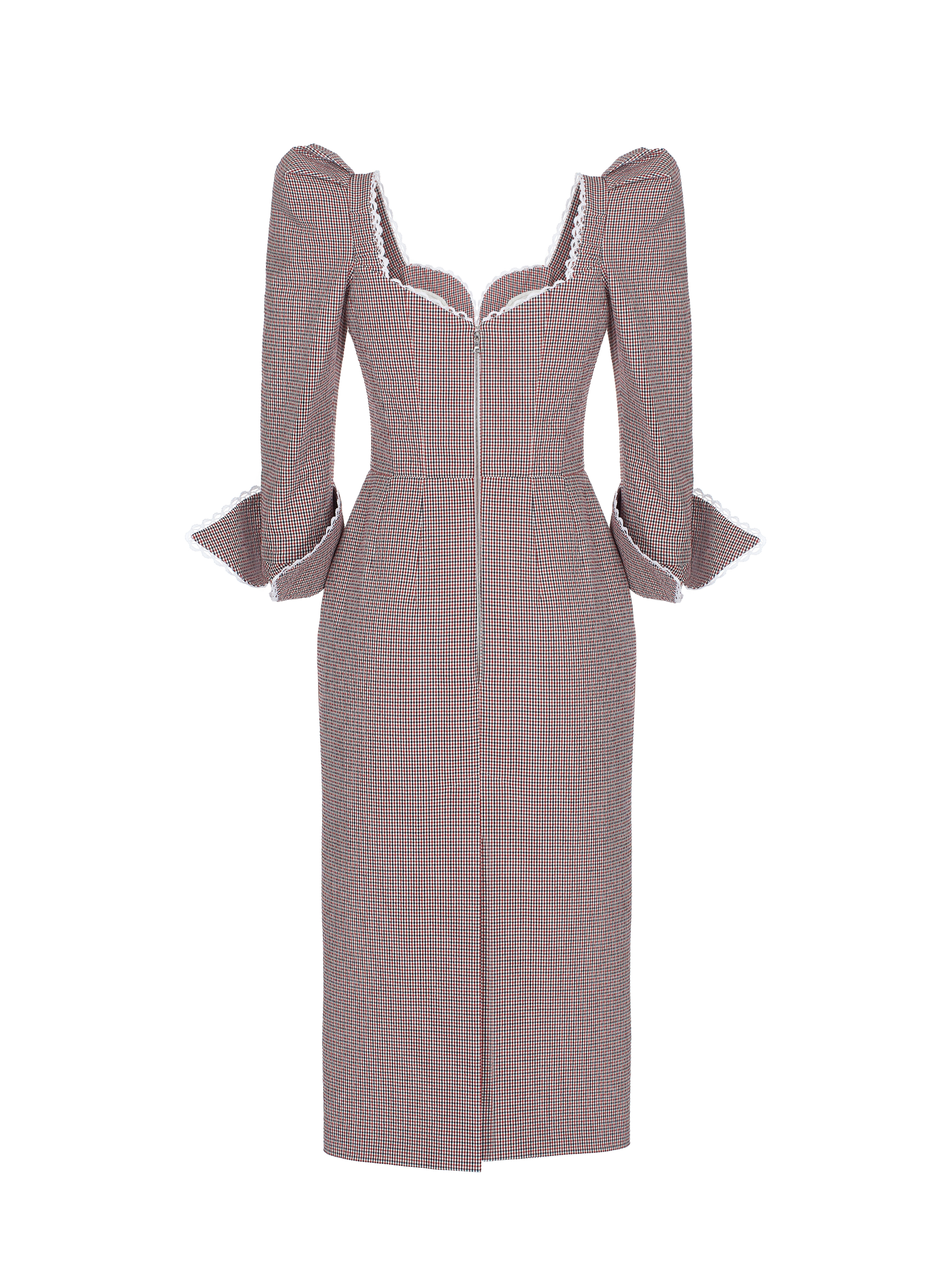 The midi dress with puff sleeves and a tulip skirt is made of red cotton in a small black-and-white check and complemented by a shaped cut-out at the chest. The cuffs and neckline are decorated with white lace. Zip fastening at the back.