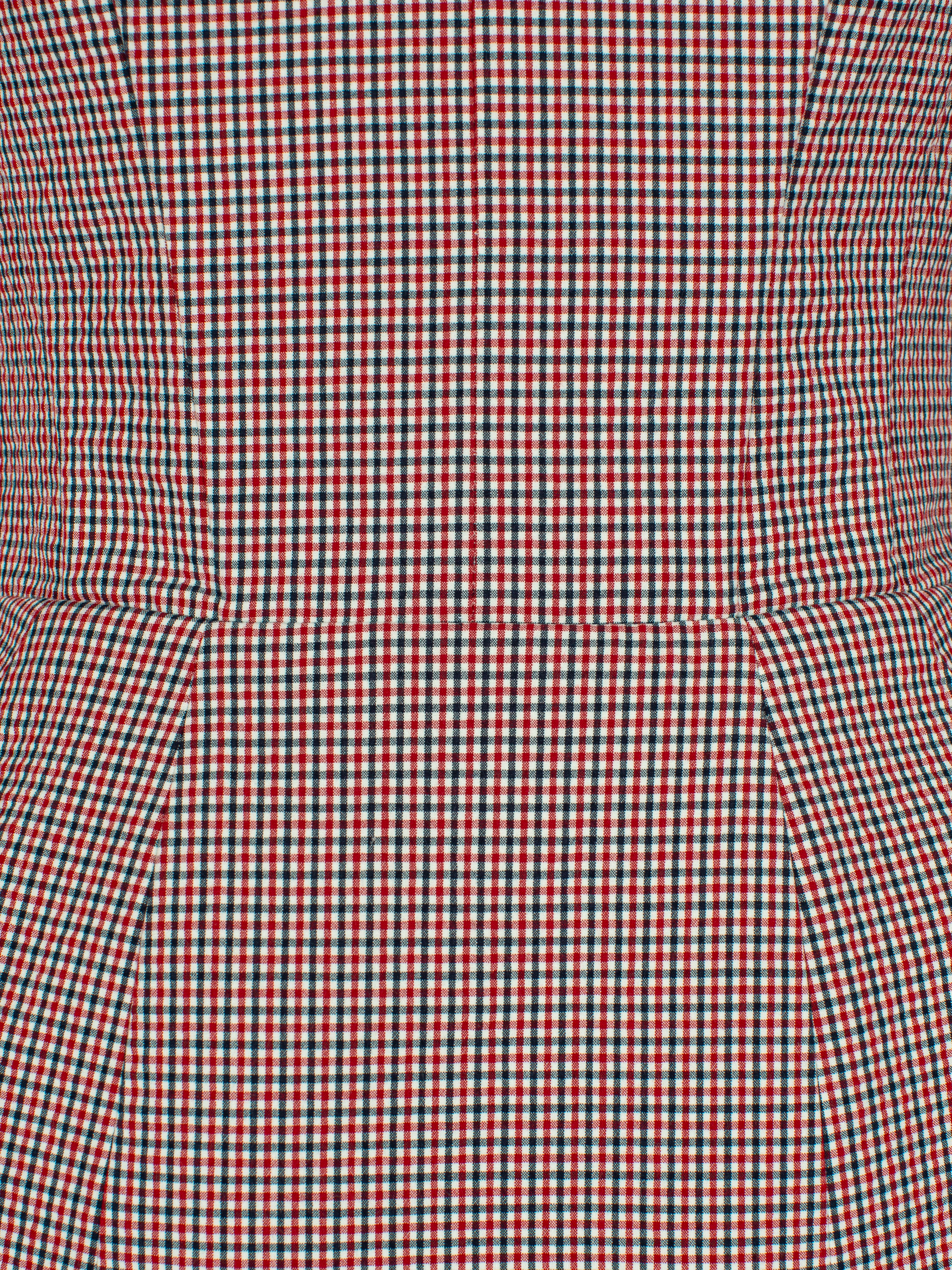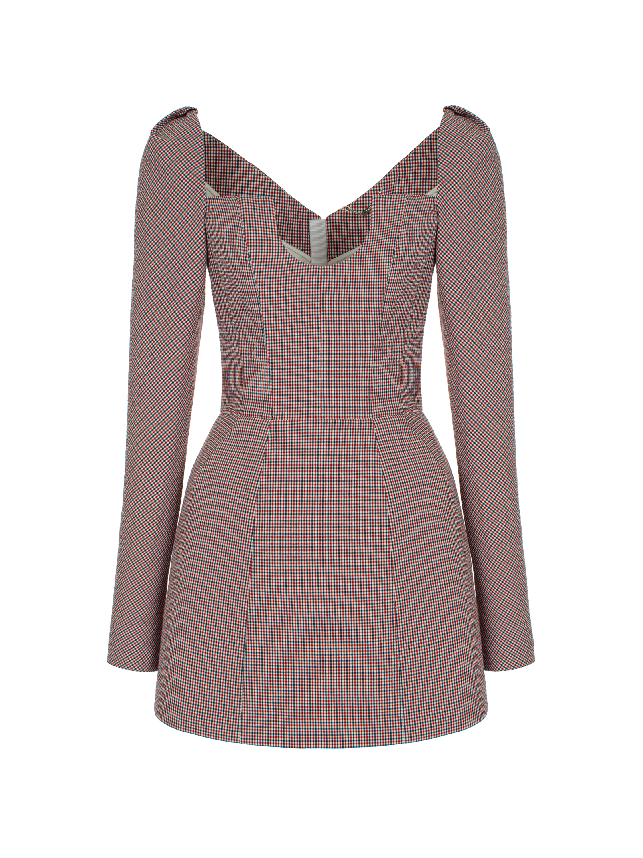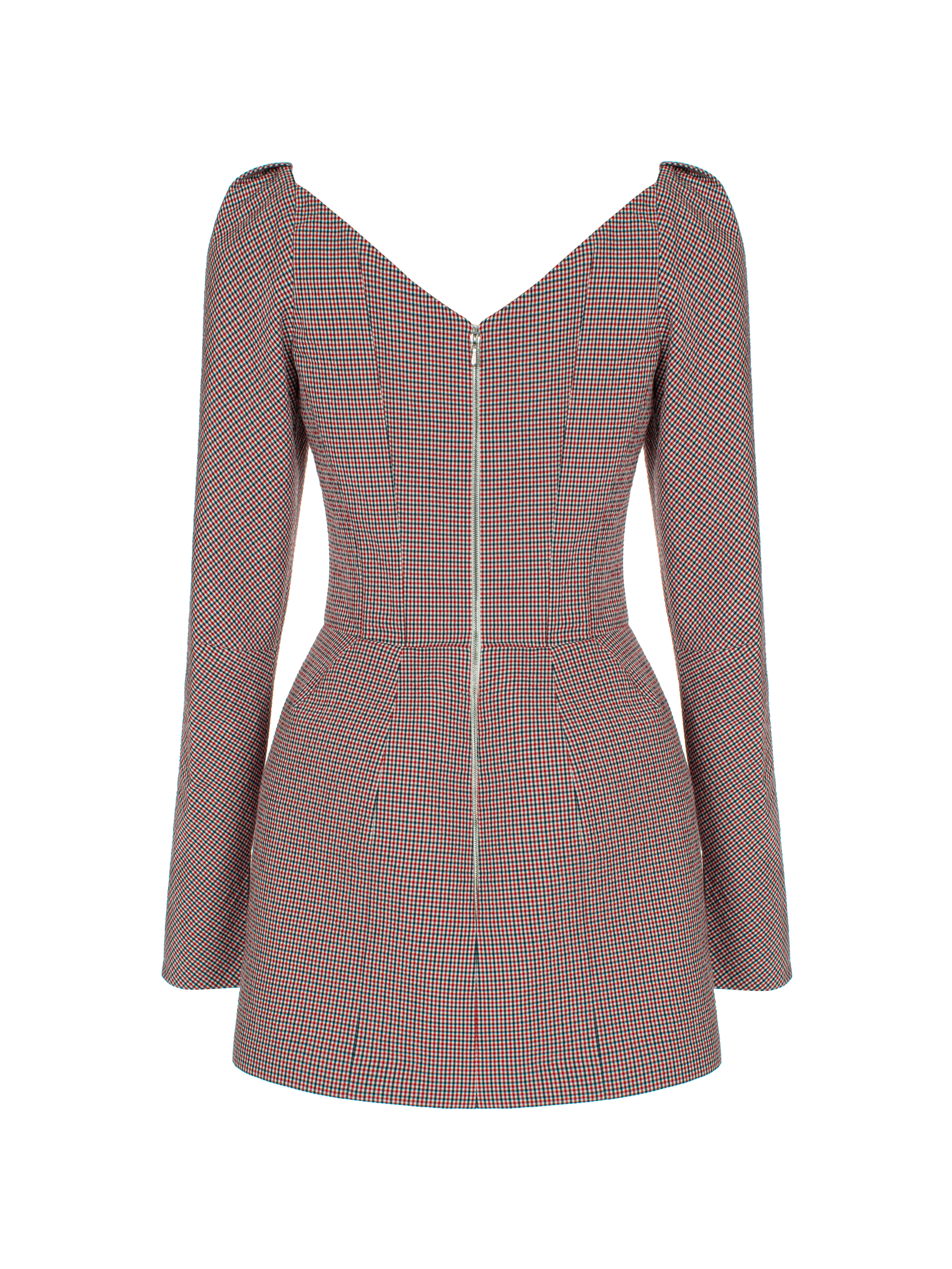 Red mini dress in a small black and white check is complemented by long puff sleeves and a corset bodice with a shaped neckline at the chest. The model fastens with a zipper at the back.
