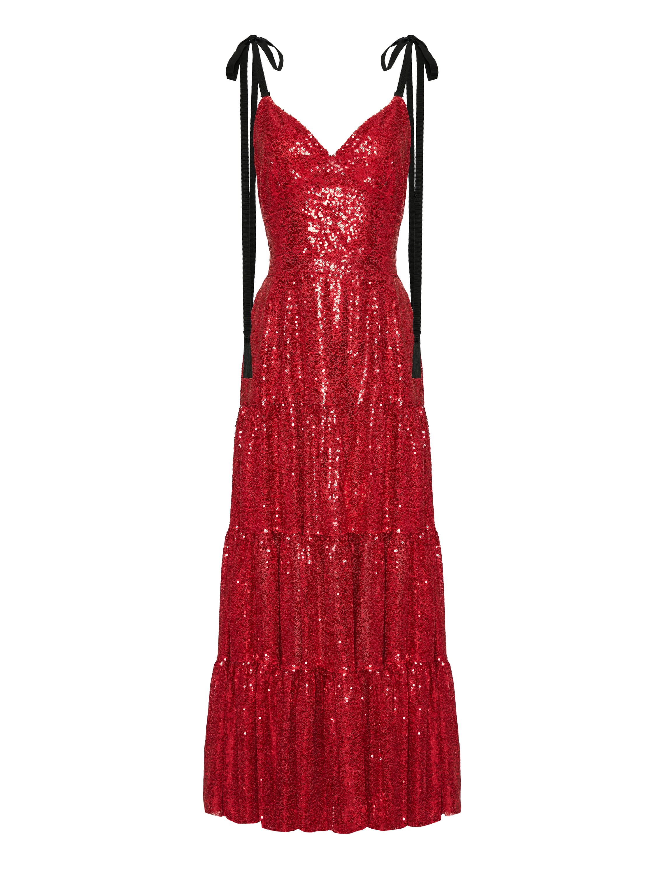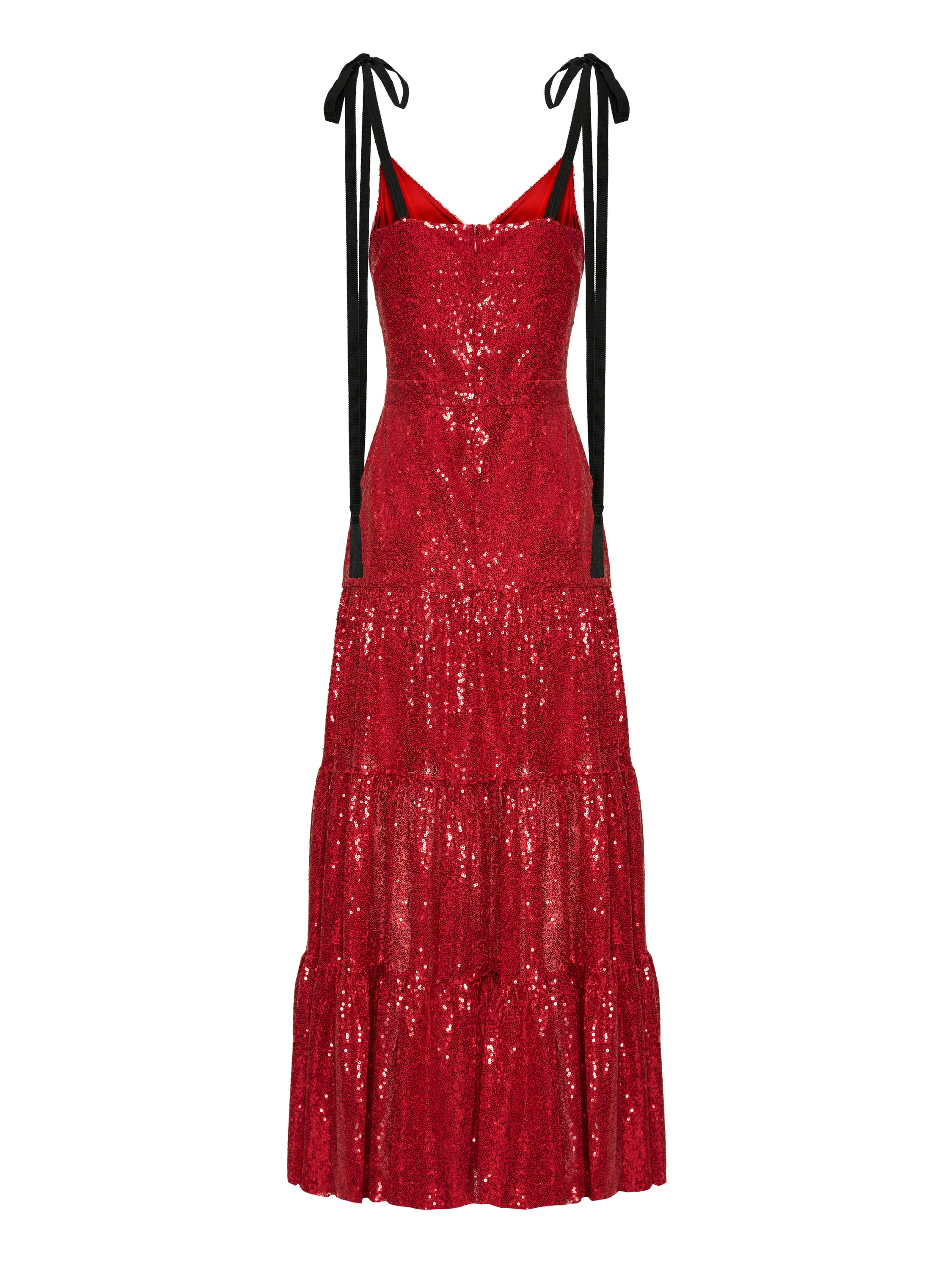 A red sundress dress embroidered with sparkling sequins, with black contrasting tie straps. The hem is cut in three tiers. Zipper fastening at the back.