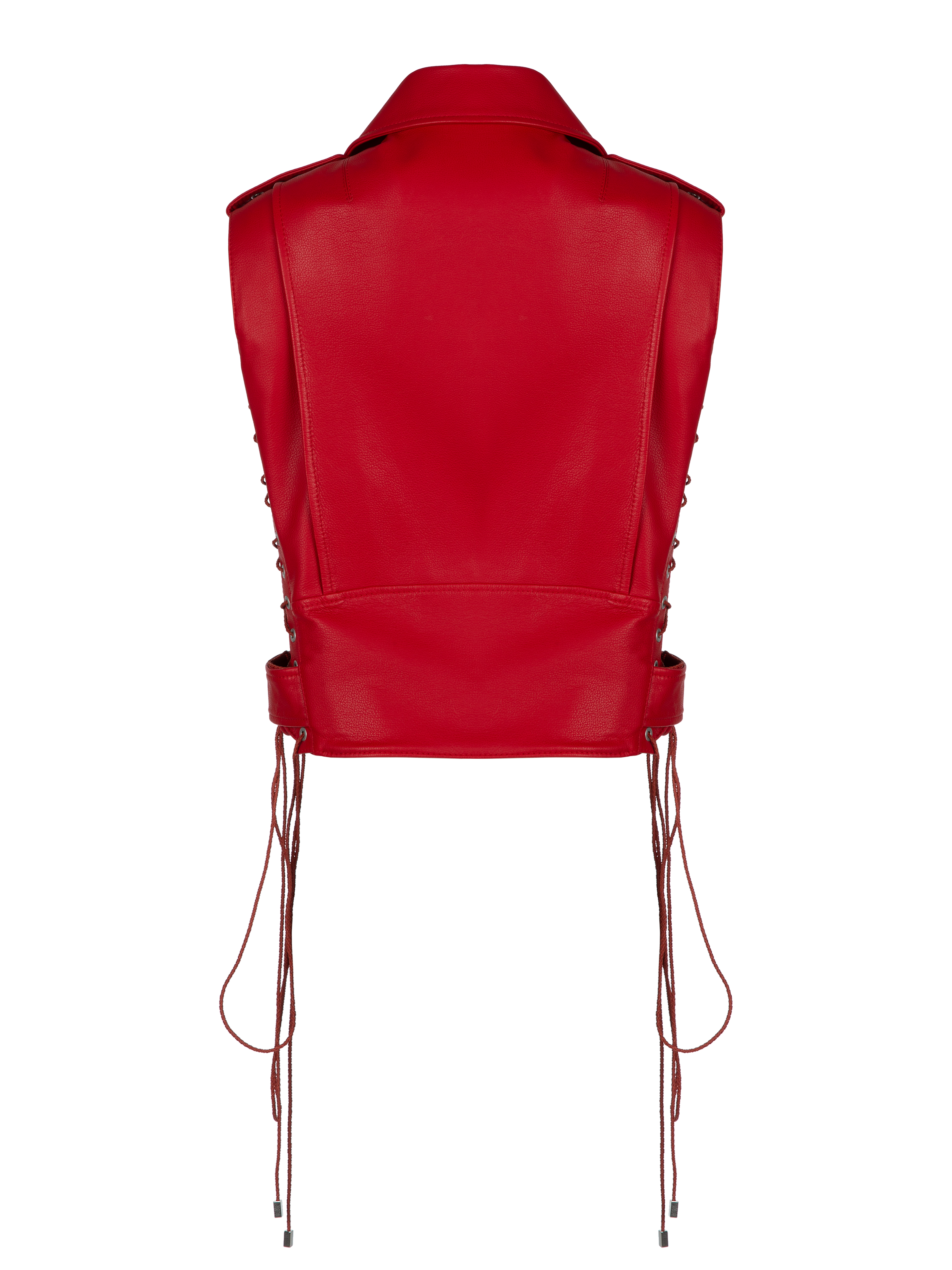 A red sleeveless biker jacket is made of genuine sheep leather. The model is lined with silk and decorated with lacing on the sides and on the epaulettes. Pair it with flowing feminine blouses to create a #TenderRock style look.