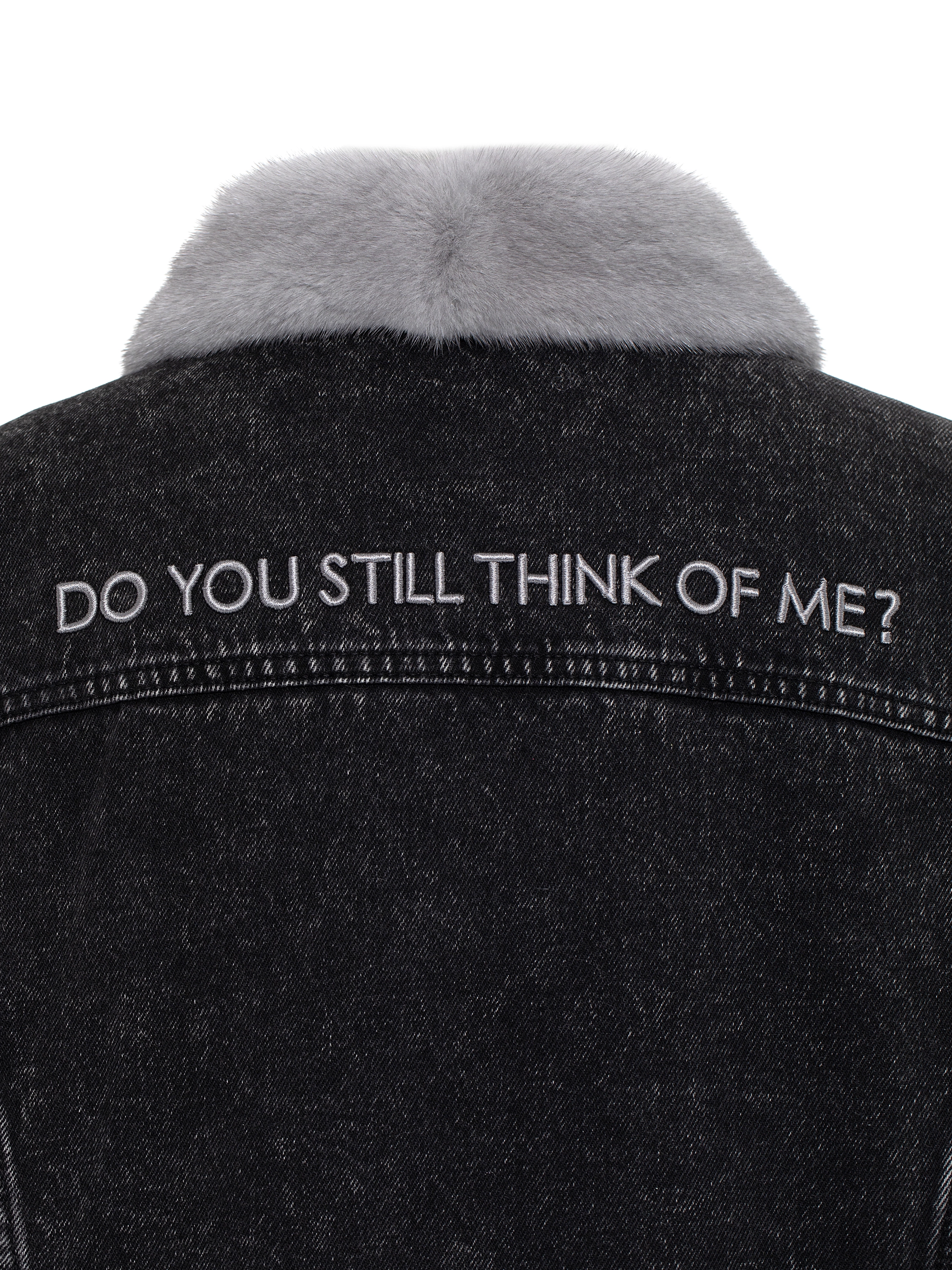 A black washed denim jacket with a grey mink fur lining will become a memorable accent in your wardrobe. The model is complemented by two patch pockets with flaps on the chest and two welt pockets at the sides. The jacket is decorated with grey "Do You still think of me?" embroidery on the back. Fastens with logo-embossed buttons.
