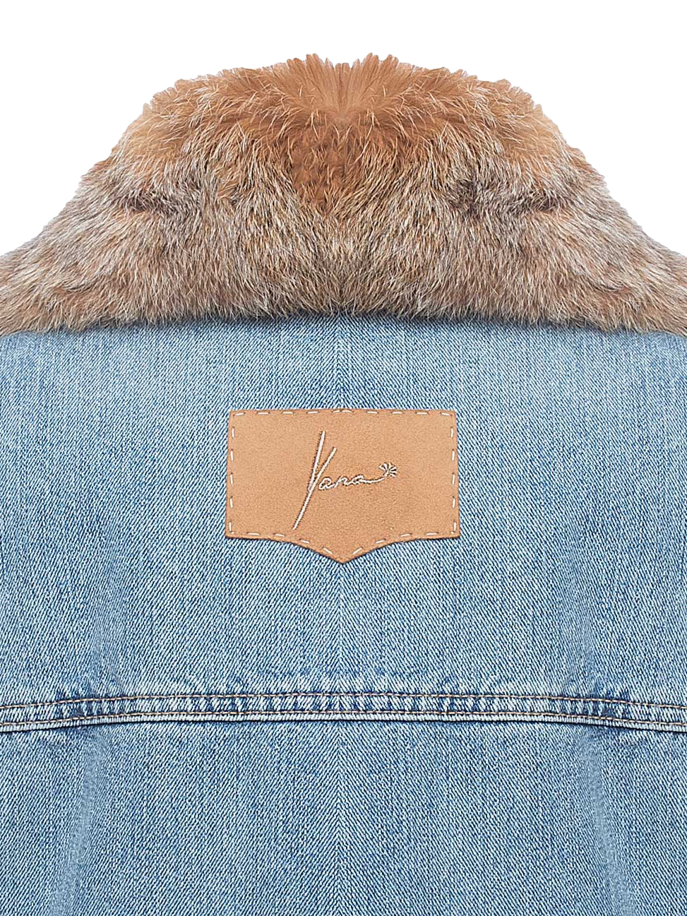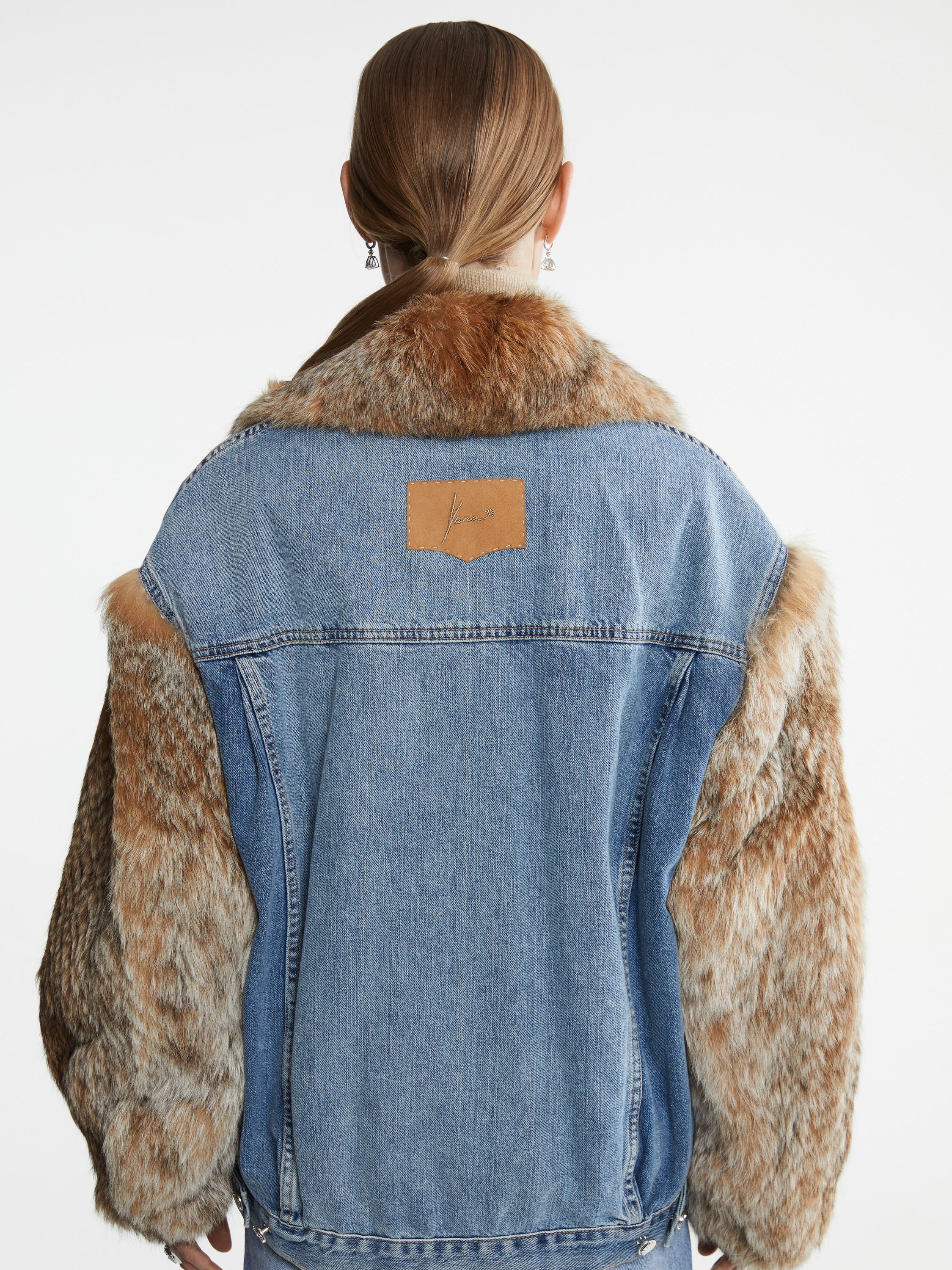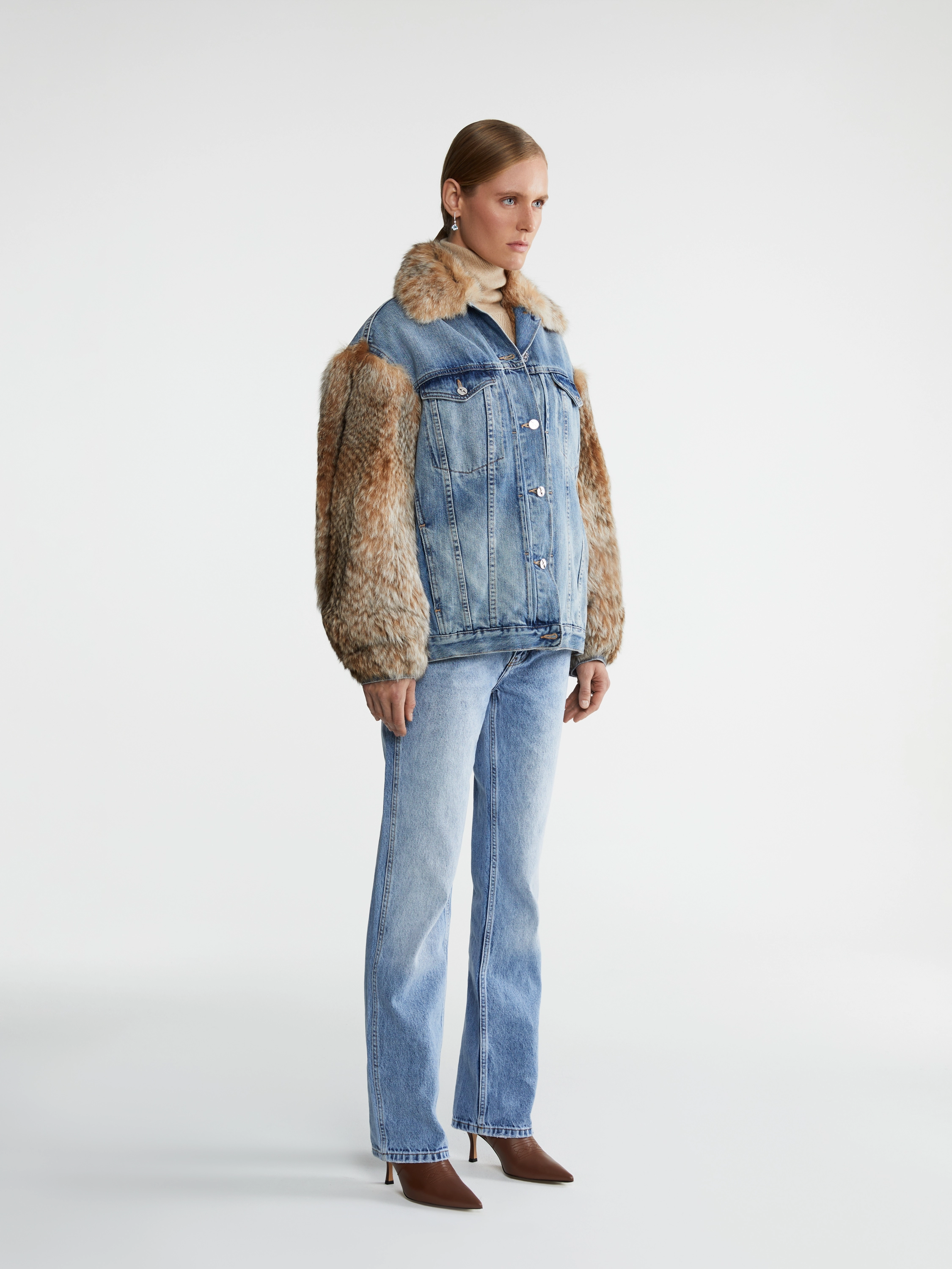 An oversized jacket made of washed denim with fur sleeves and lining. Made from wild lynx (bobcat) fur. Decorated with 925 sterling silver buttons.