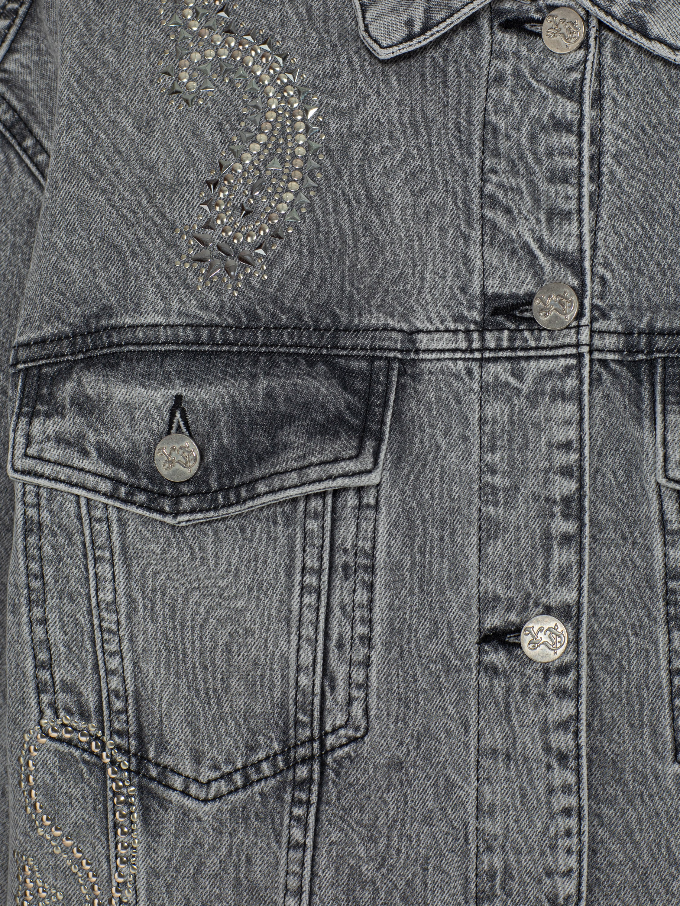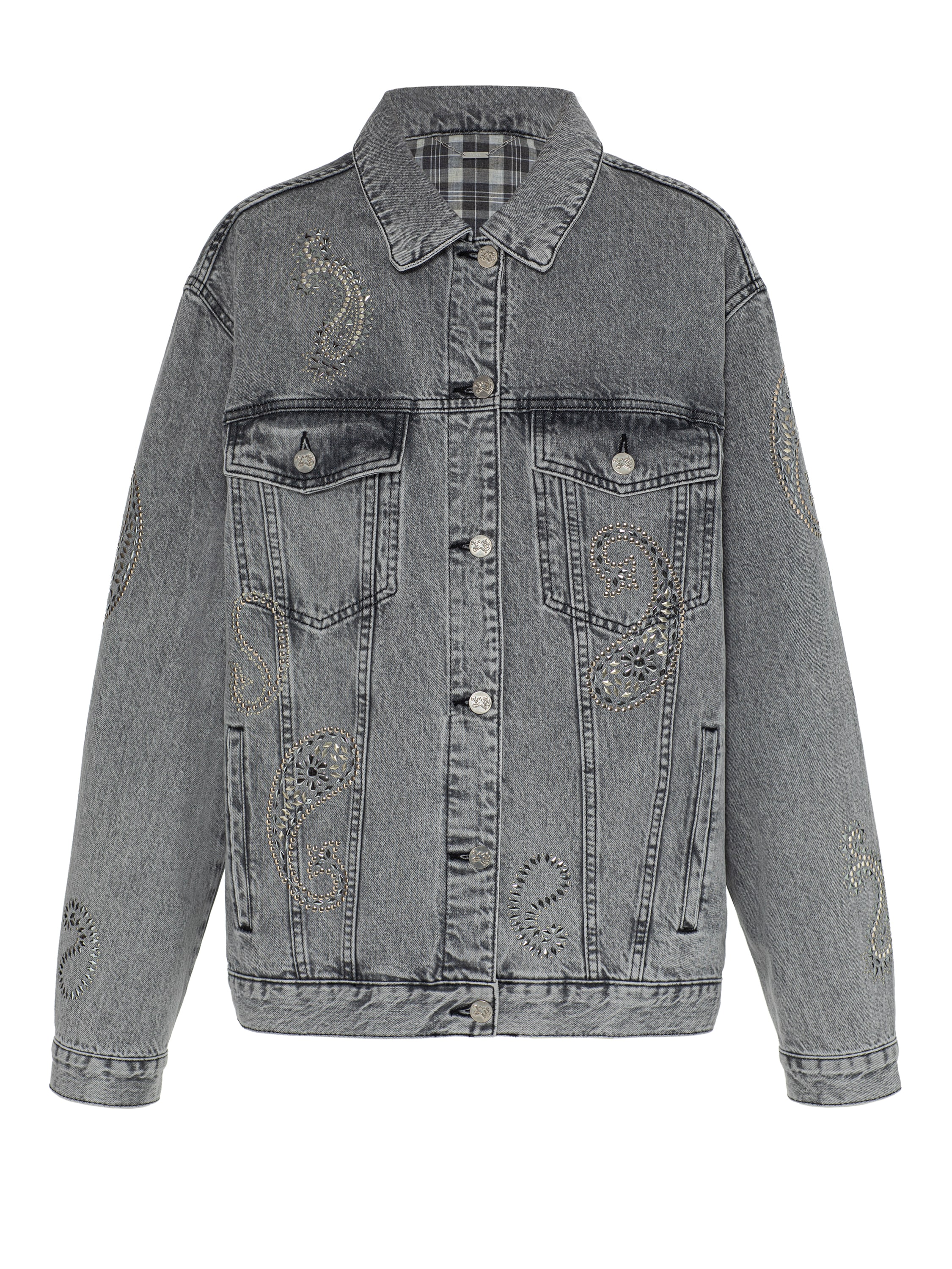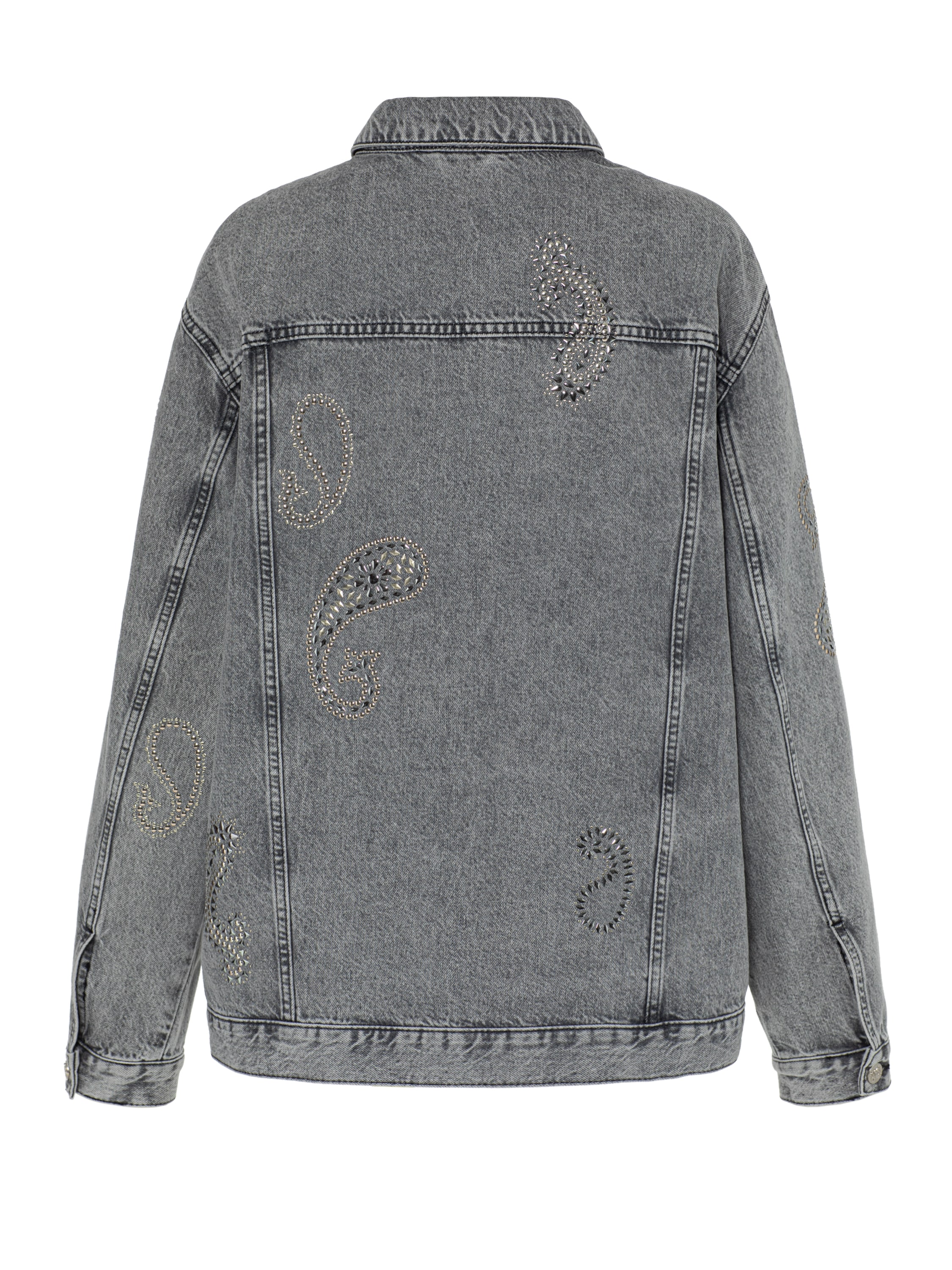 The light gray denim jacket is decorated with heat-applied paisley pattern appliqués. The decoration of the piece required 6 hours of handwork by the craftsmen of the Yana fashion house.