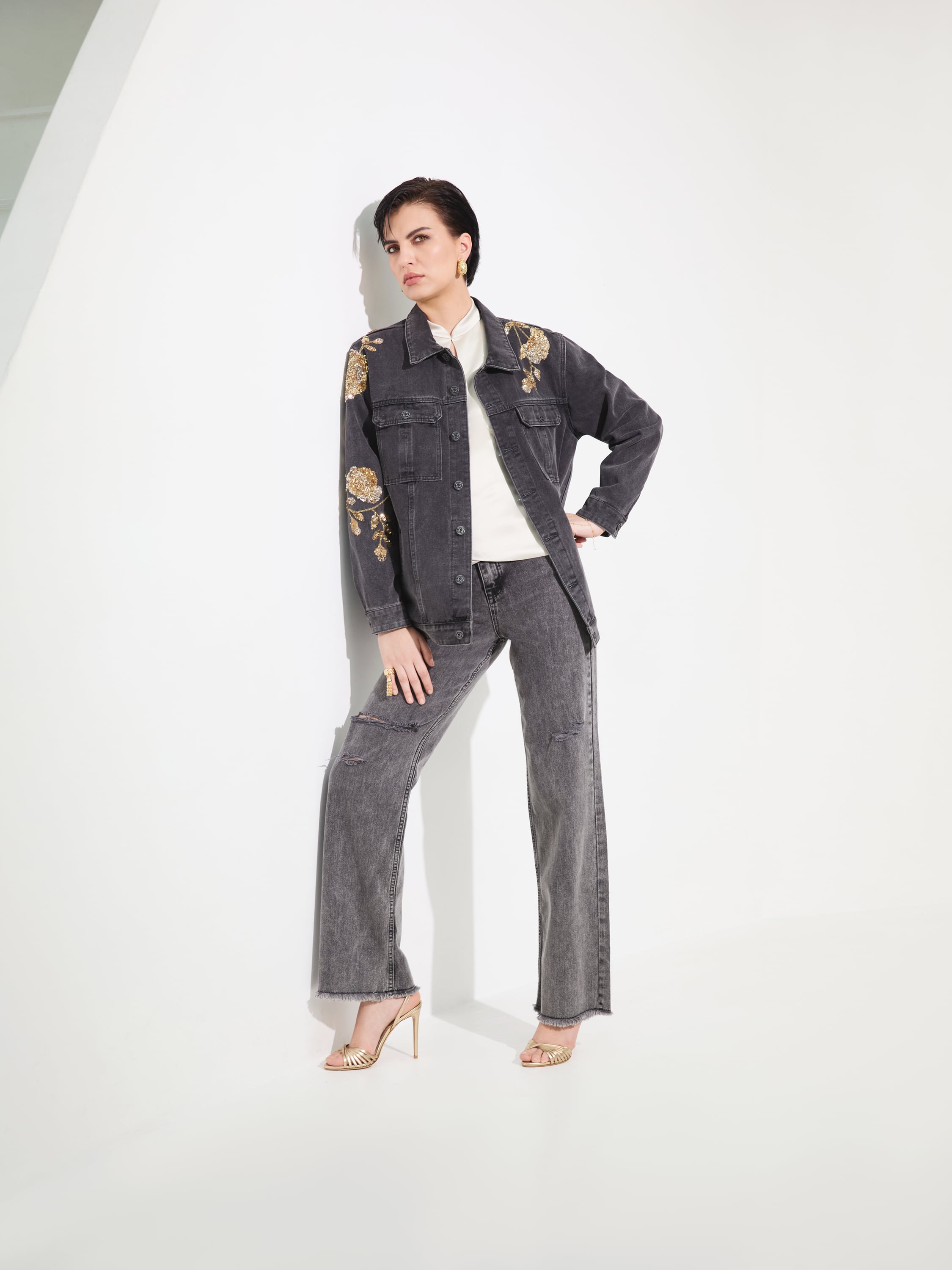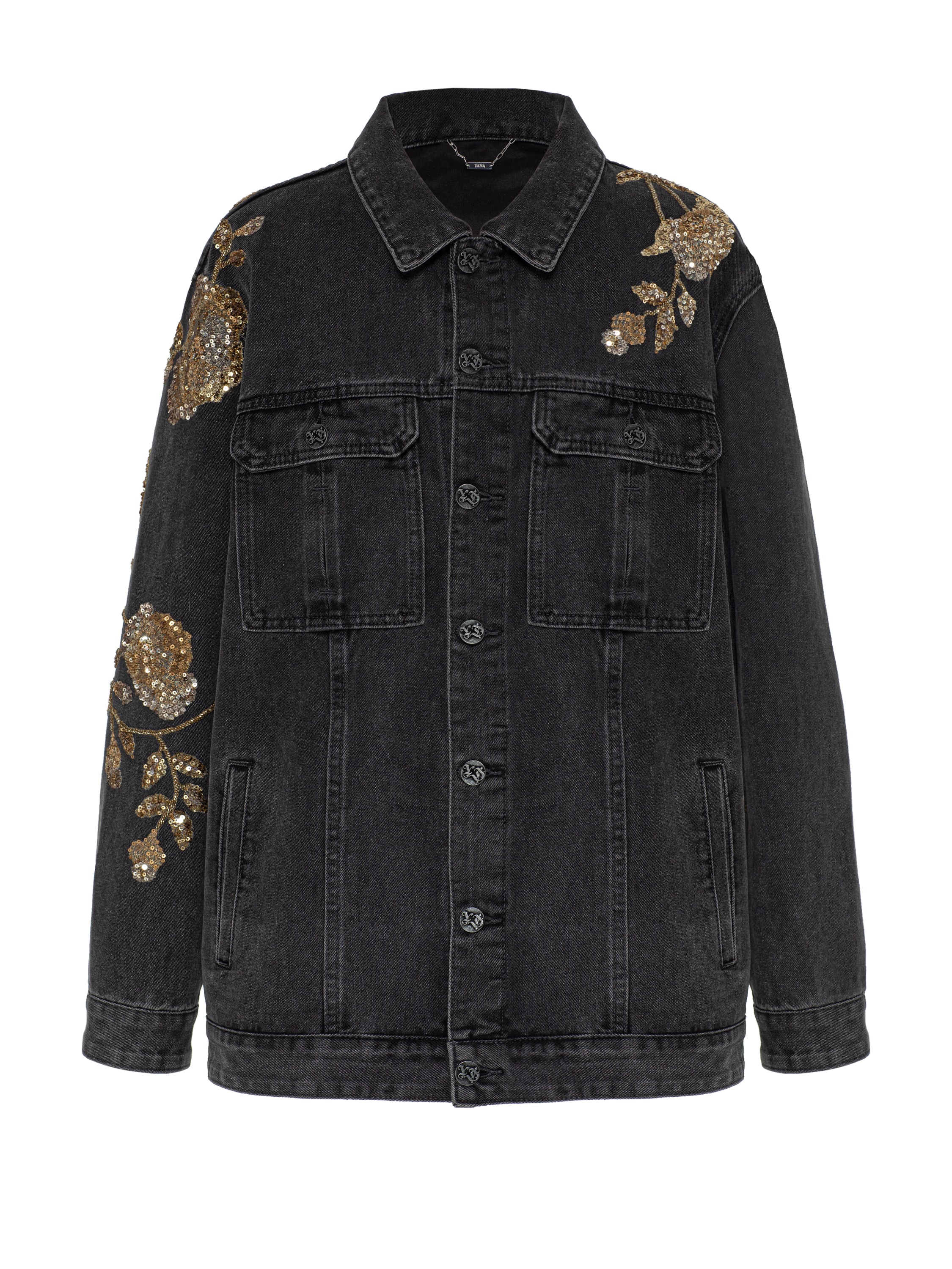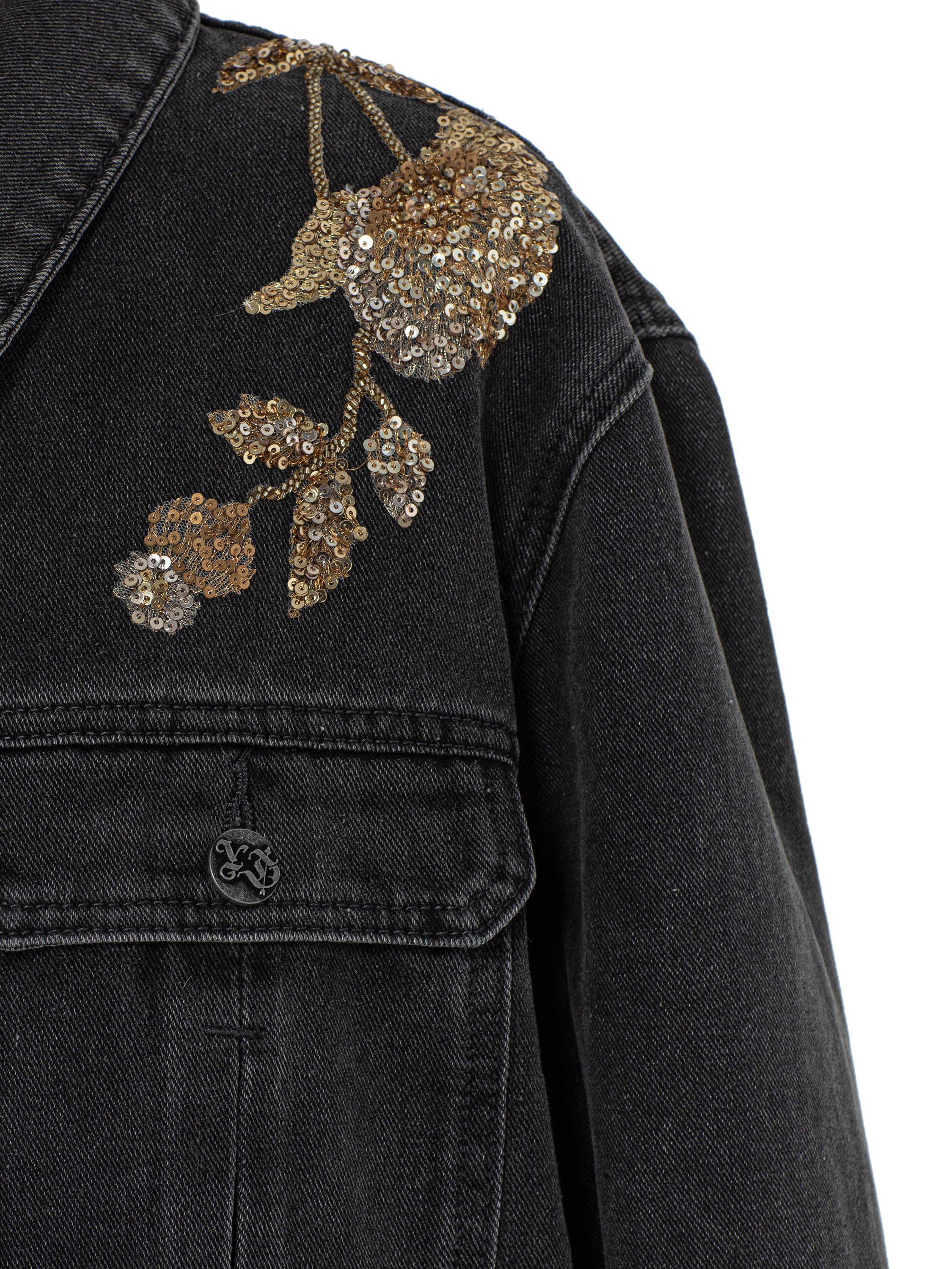The black denim jacket is complemented by delicate floral embroidery with golden sequins. The decoration of the piece required 46 hours of handwork by the craftsmen of the Yana fashion house.