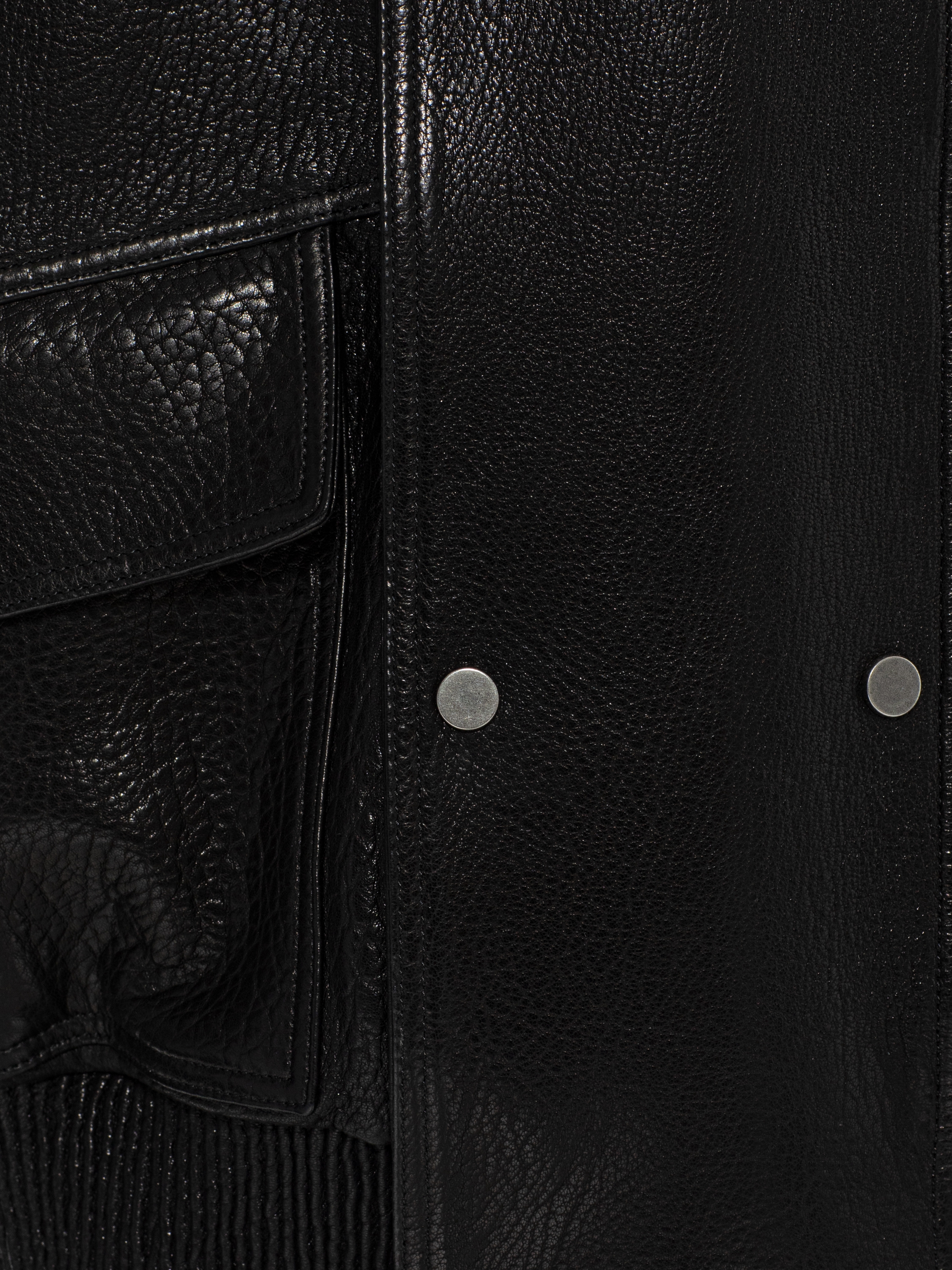 A black biker jacket made of genuine leather. A removable turn-down fur collar is included. Zip and snap button fastening.