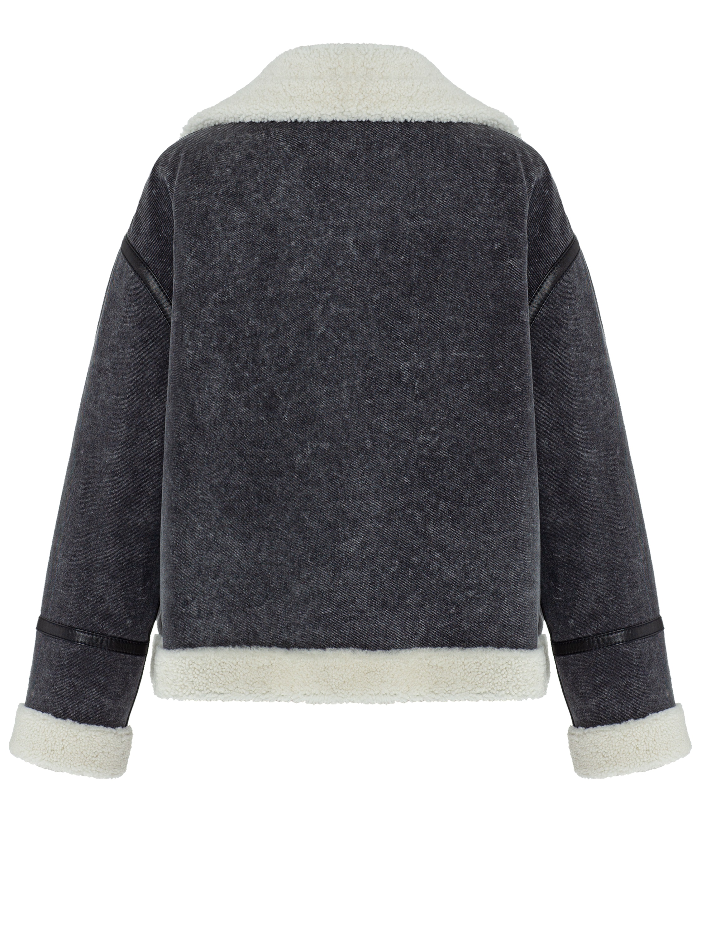 A biker jacket made of stonewashed denim insulated with white sheepskin fur is the perfect balance between comfort and style. The model is complemented by contrasting black leather trim. Two welt pockets on the sides.