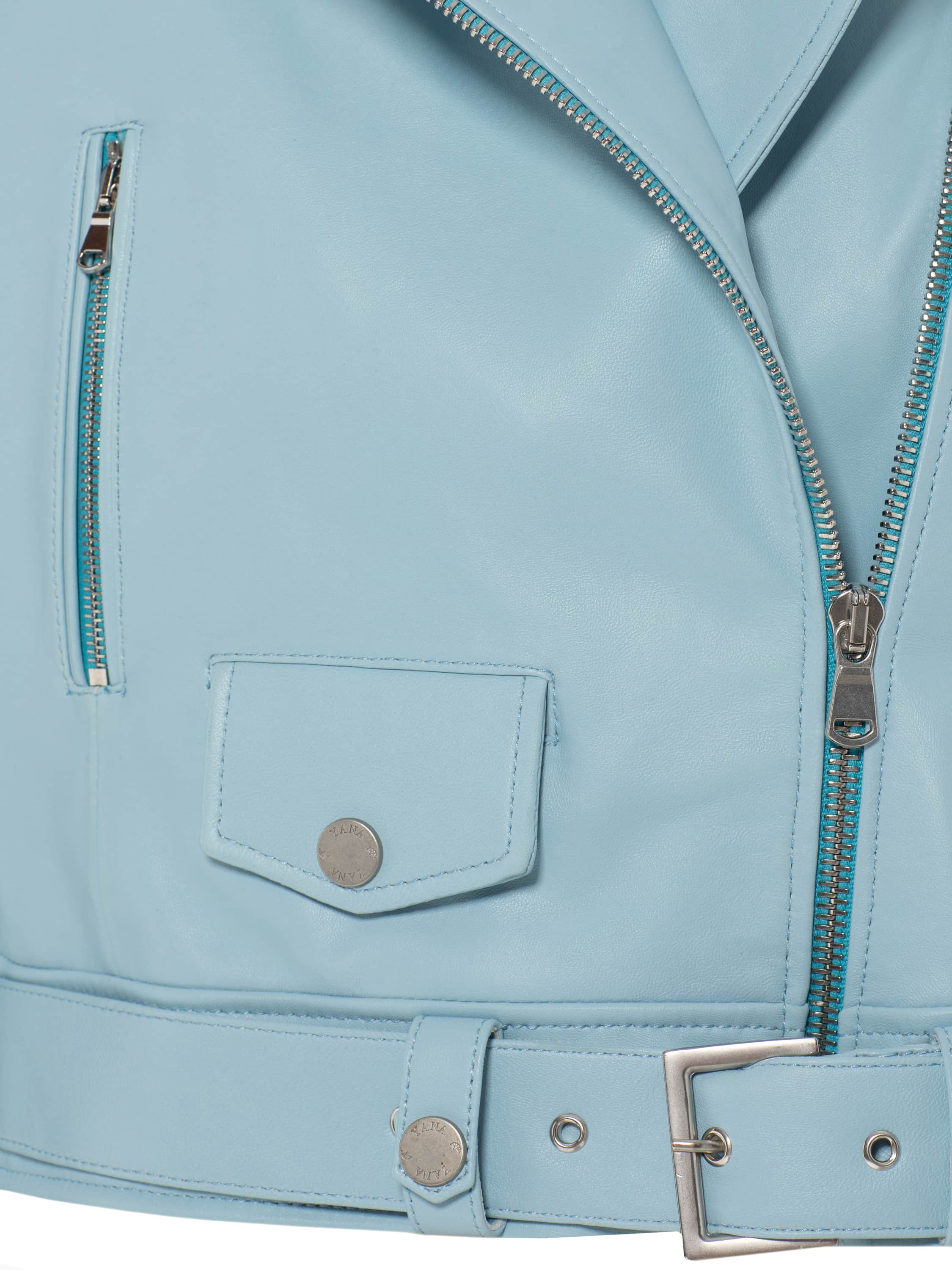 A pastel blue genuine leather biker jacket will become a versatile addition to any look. The cropped model pairs well with dresses and skirts as well as with trousers.