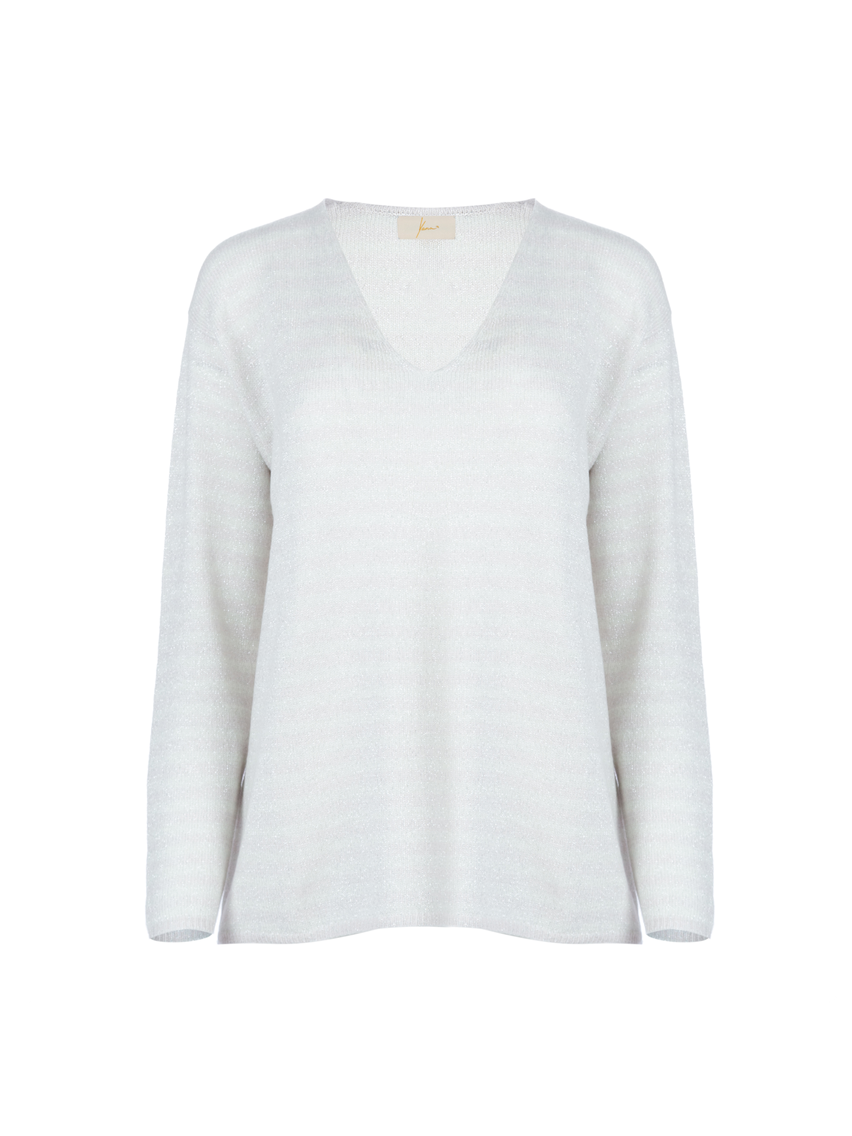A pullover made of natural cashmere will feel incredibly comfortable and warm. The model is crafted in a milky color with a light pink horizontal stripe and complemented with lurex. Loose fit and an elegant V-neckline.