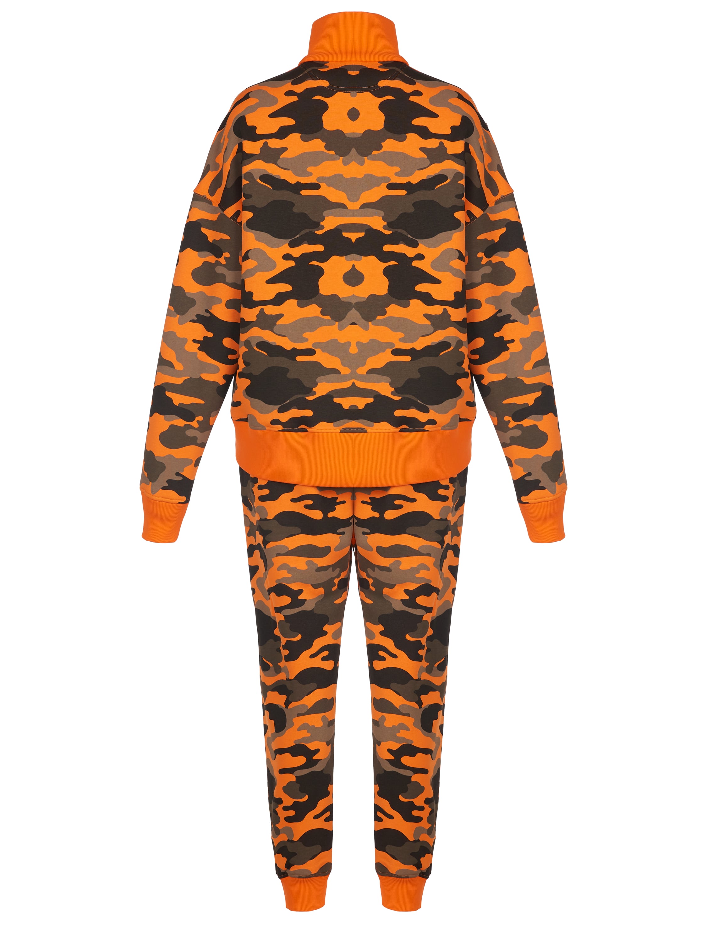 The unisex knitwear set is made of orange camouflage jersey and consists of a zip-up sweatshirt with a stand-up collar and track pants. The cuffs and collar are finished with a wide elastic band; the back pocket on the trousers is not sewn on — for all clients we offer to add personalization with embroidered owner’s initials on it and on the chest (+30% to the cost of the suit).