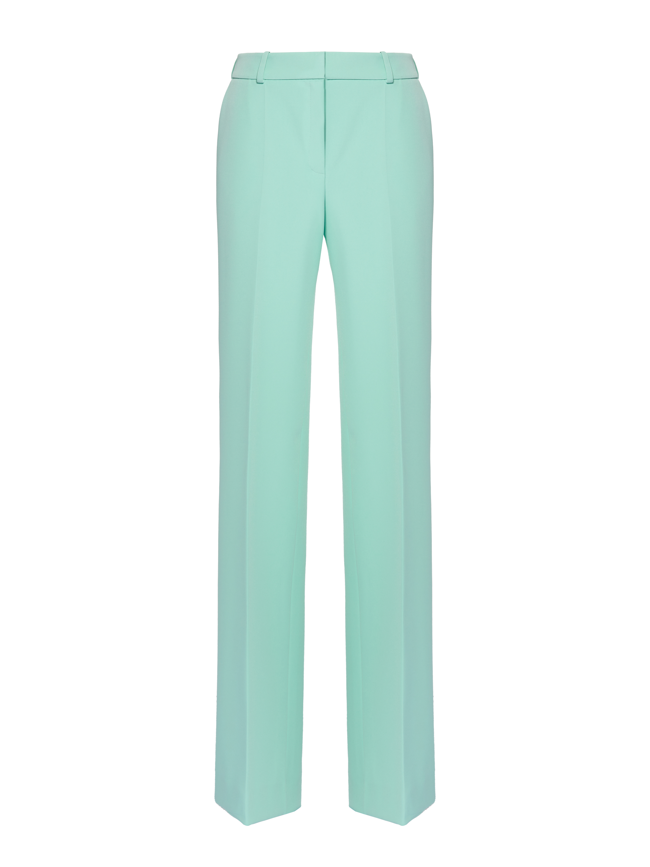 Classic pressed-crease trousers step beyond the borders of a formal wardrobe thanks to the delicate mint shade. The long straight-leg trousers are made of viscose: this material maintains a comfortable microclimate for the body in hot weather.