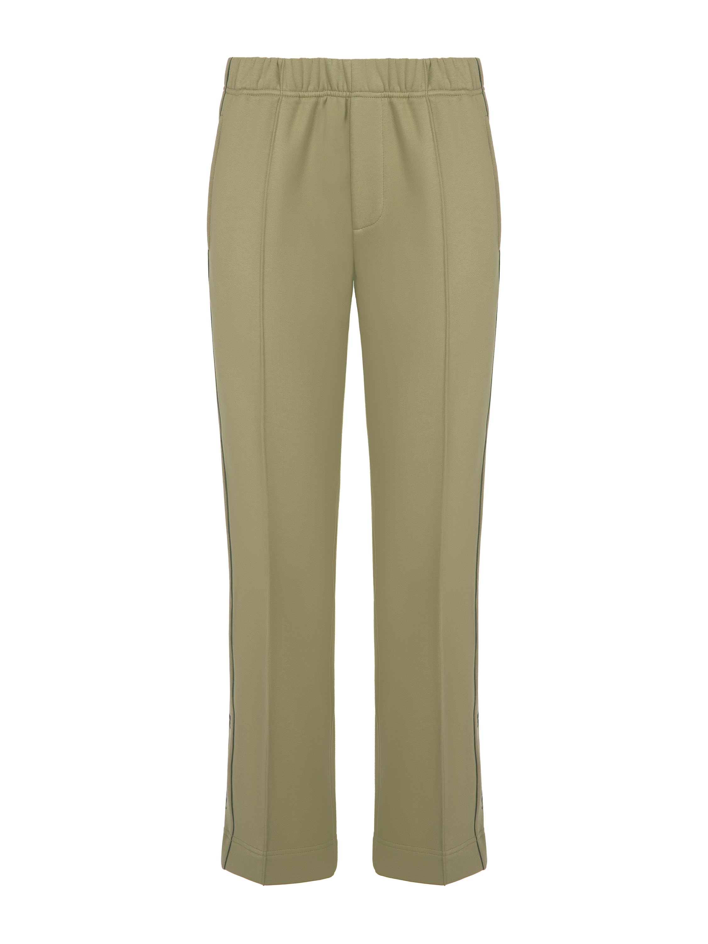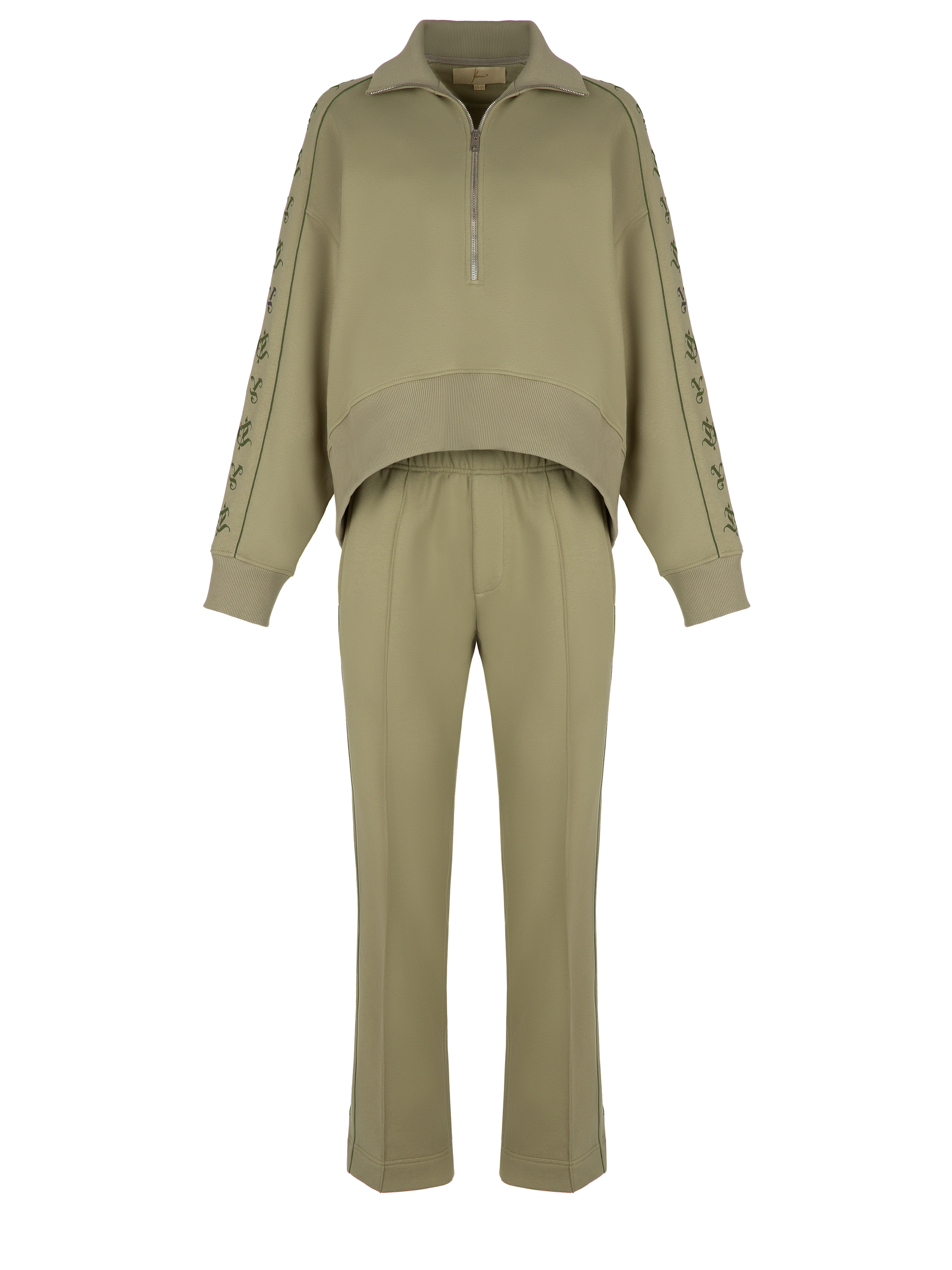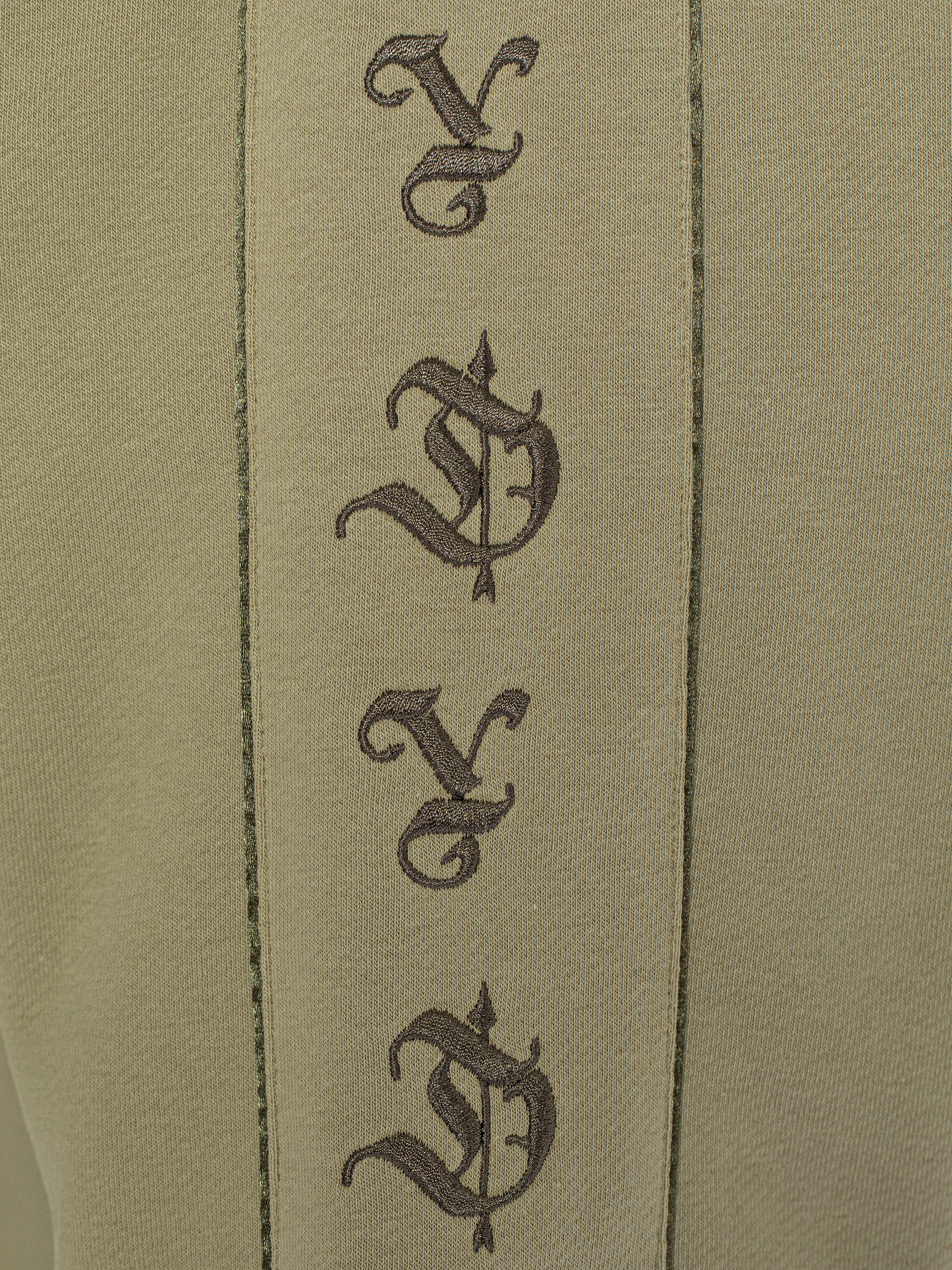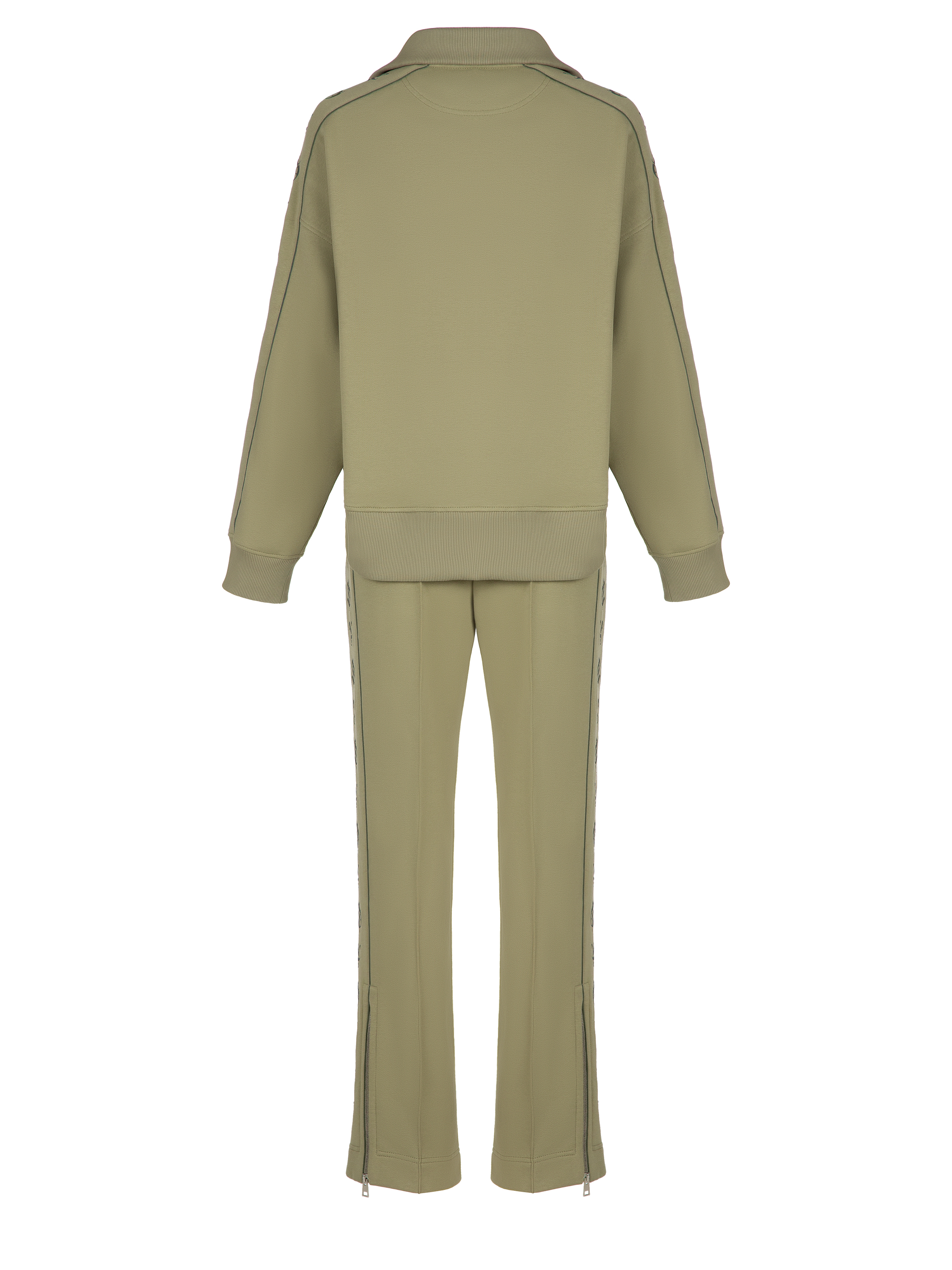 The knit suit is made of olive-green jersey and consists of a cropped zip-up sweatshirt with a stand-up collar and track pants. The cuffs and collar are finished with a wide elastic band. The sweatshirt is decorated with tone-on-tone YD embroidery on the sleeves. The trousers are complemented by side stripes and zippers at the bottom.