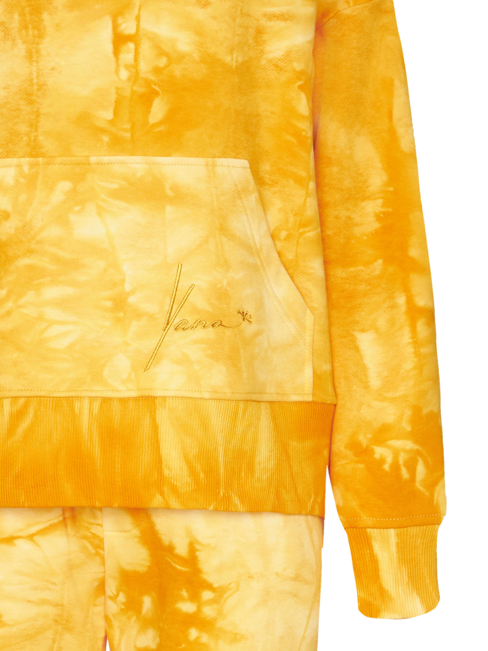An orange cotton suit dyed in the tie-dye technique consists of a hoodie with a kangaroo pocket and elasticated trousers.