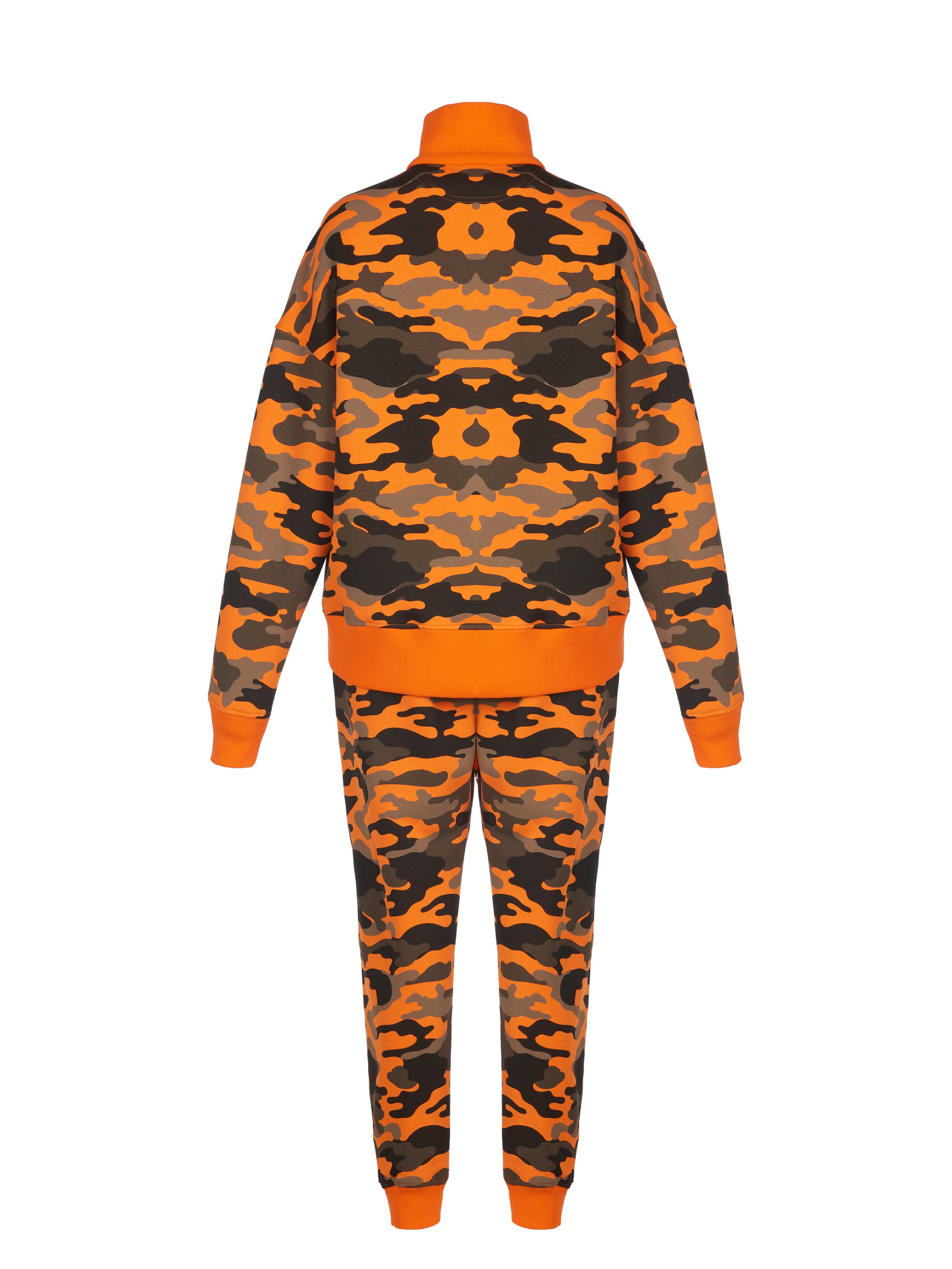 The unisex knitted tracksuit is made of orange jersey with a camouflage print and consists of a zip-up hoodie with a stand collar and track pants. The cuffs and collar are finished with a wide elastic band; the back pocket on the trousers is left unstitched — for all clients we offer to add personalization with embroidered owner’s initials on it and on the chest (+30% to the cost of the suit).