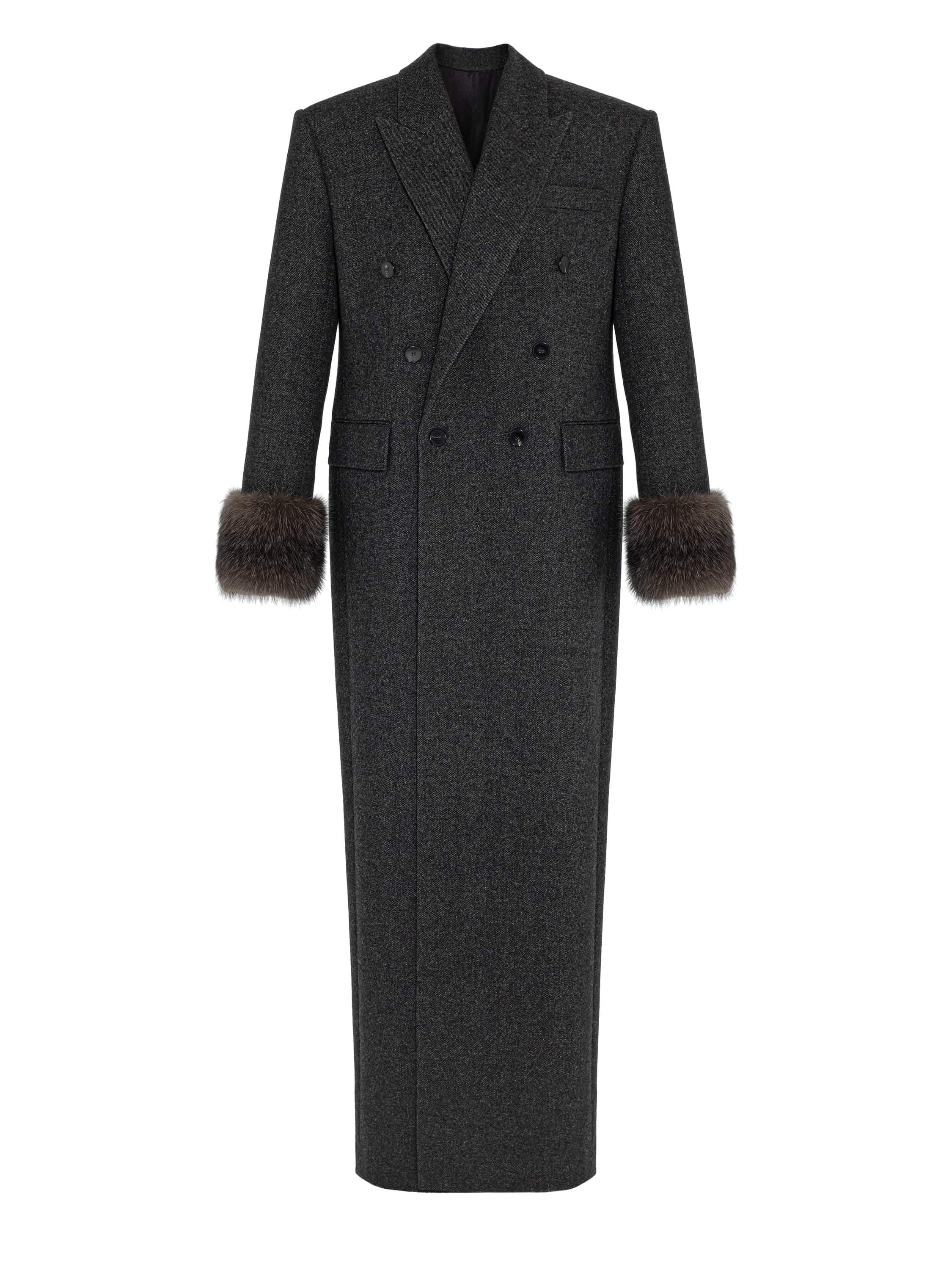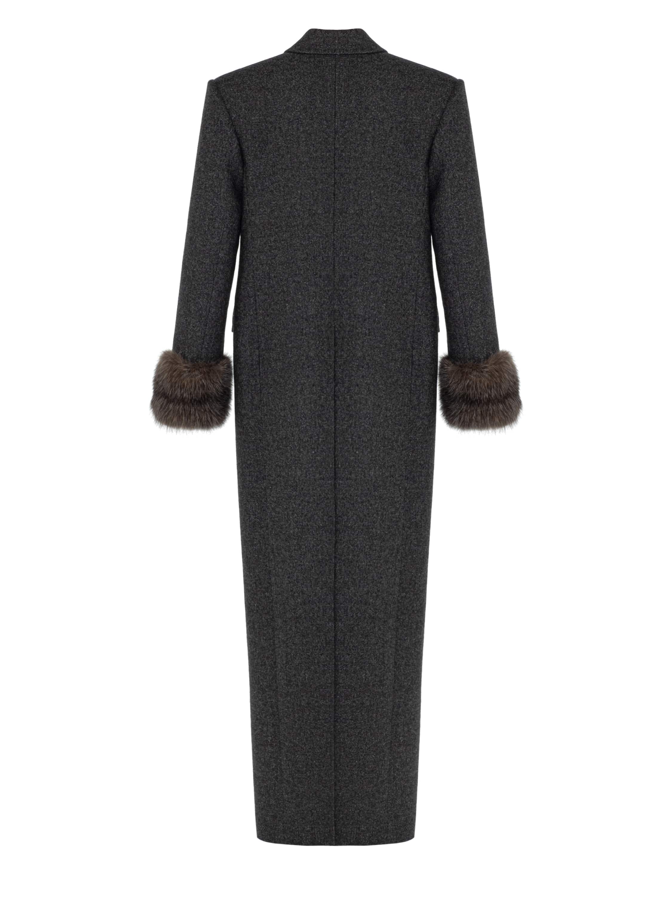 An elegant double-breasted coat is made of premium gray wool fabric with a pronounced texture. Cuffs made of sable fur give the piece special value. The noble gray shade makes the coat a versatile option for any look.