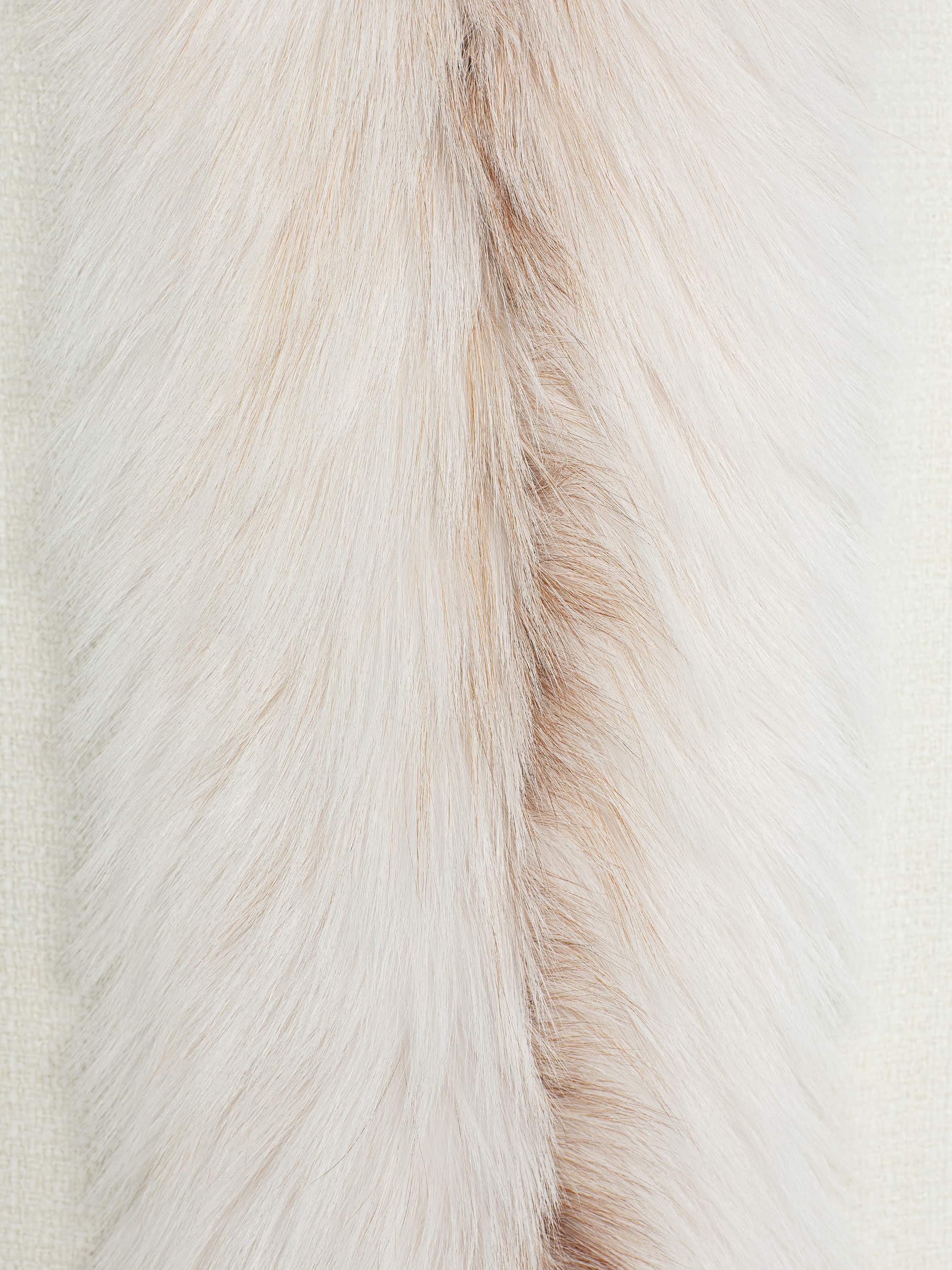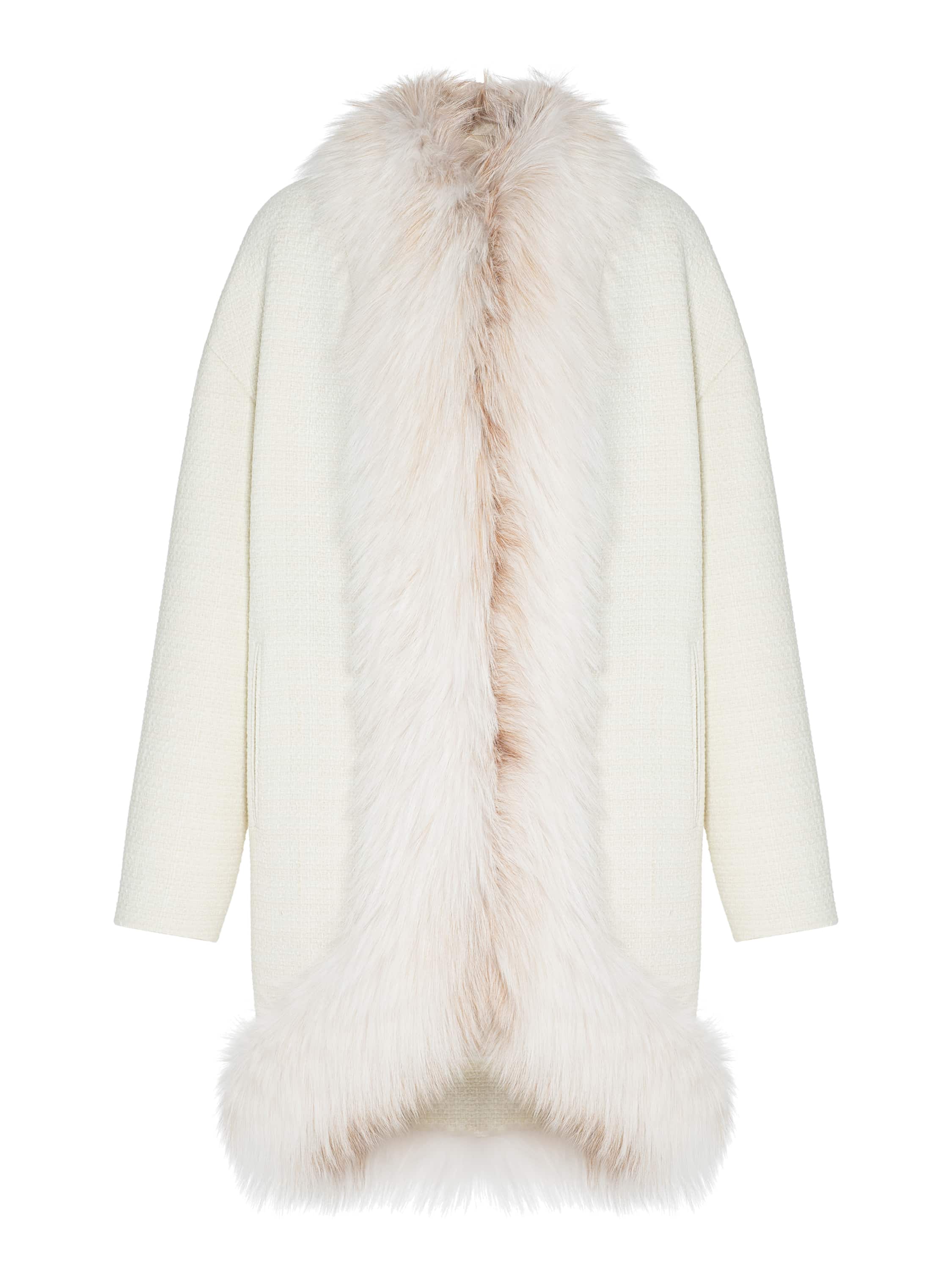 The milky coat is made of tweed fabric and complemented with precious fox fur. Since ancient times, fox fur has been considered a symbol of luxury, wealth and high status. Loose-fit design.