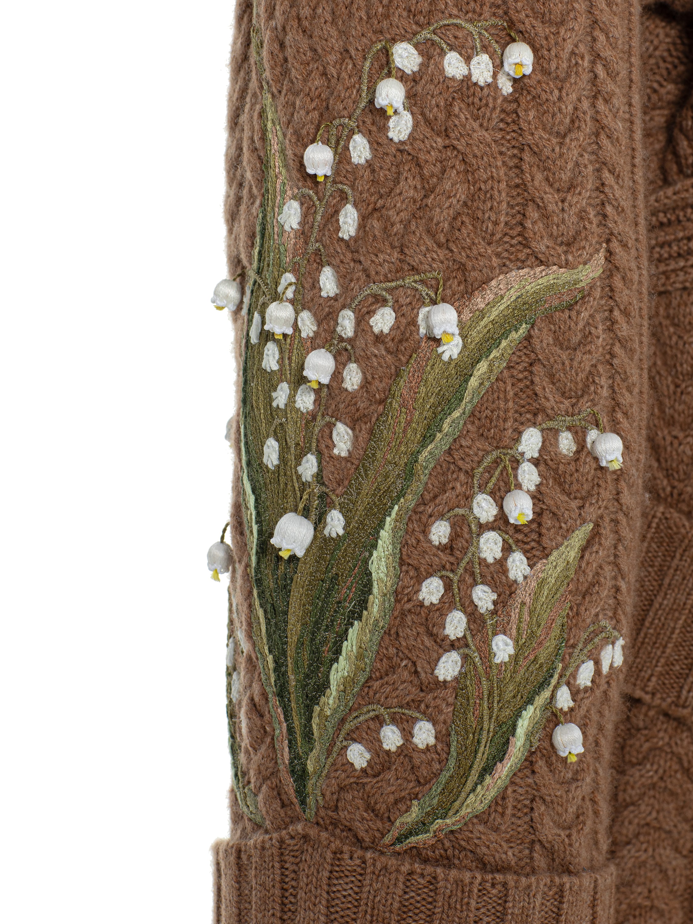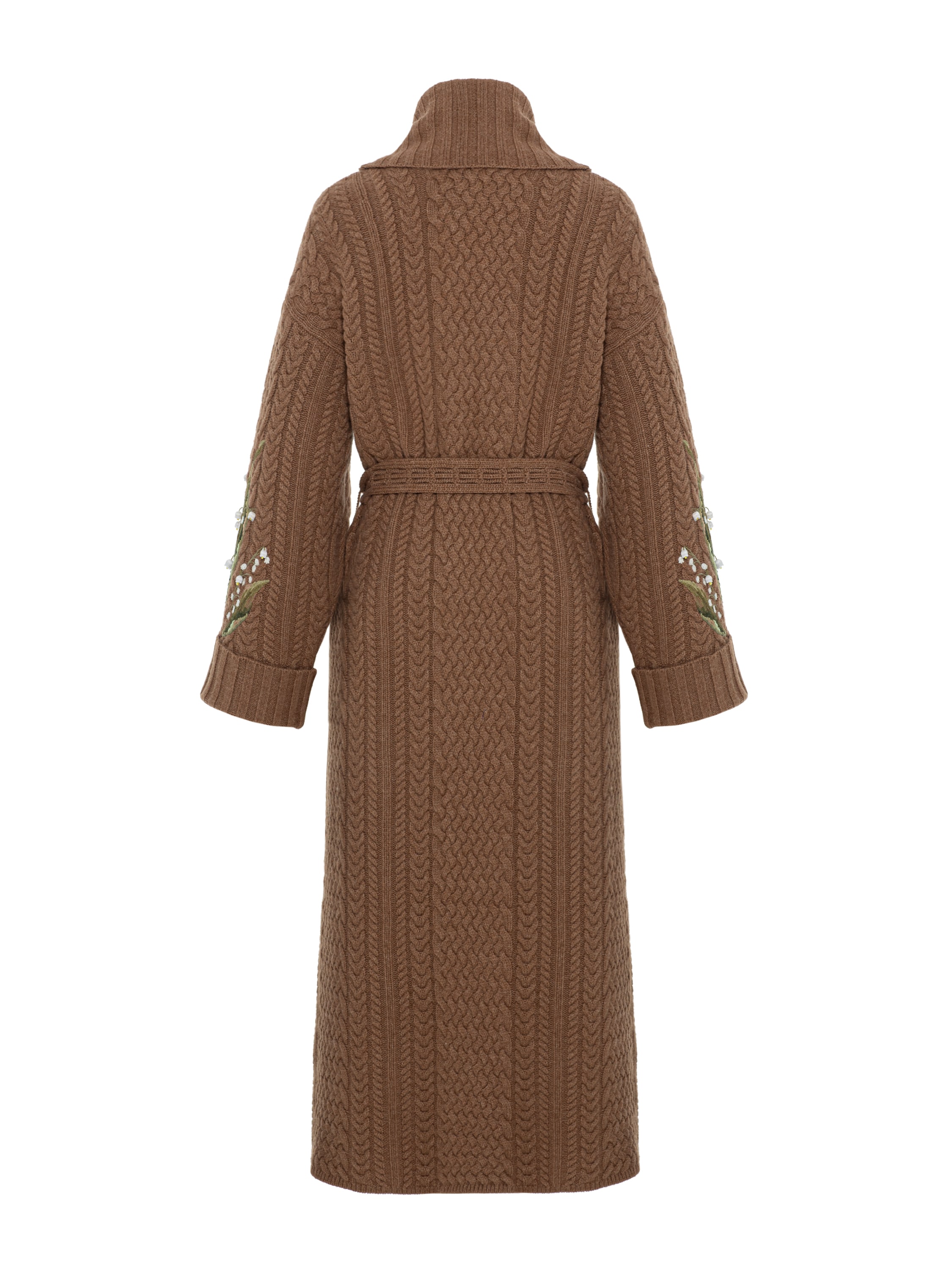 Brown Knitted Cashmere Coat With Lily Of The Valley Embroidery