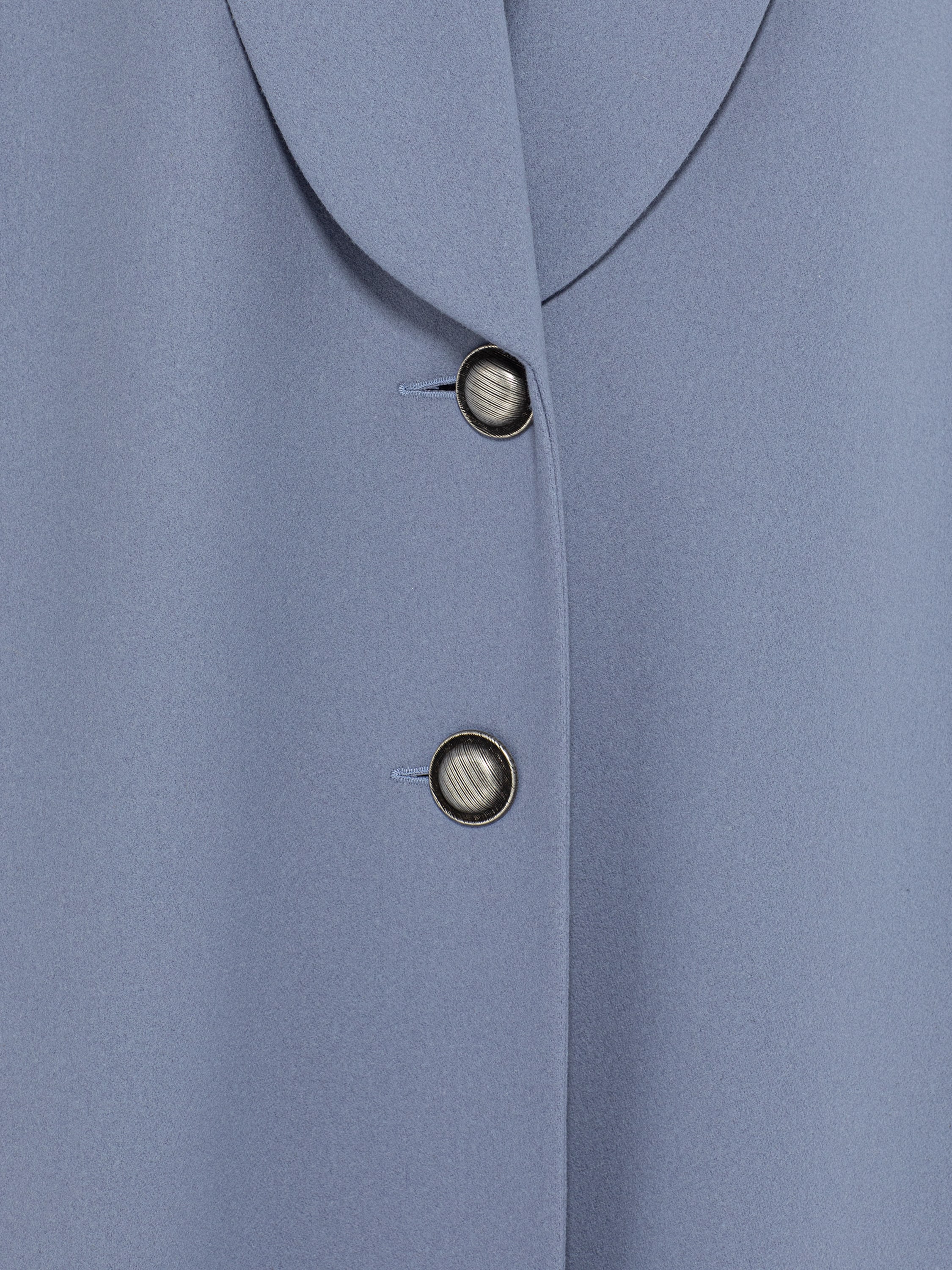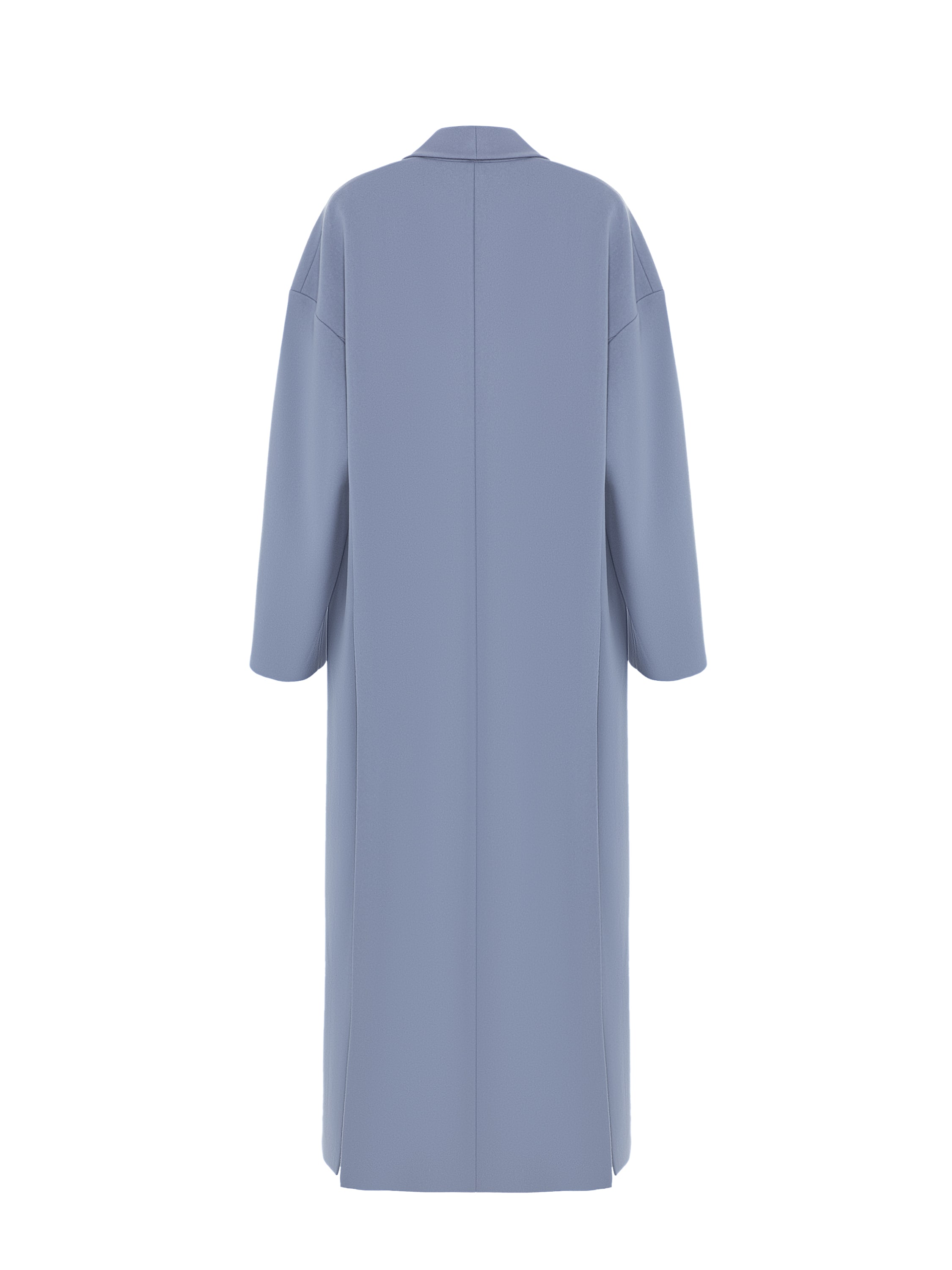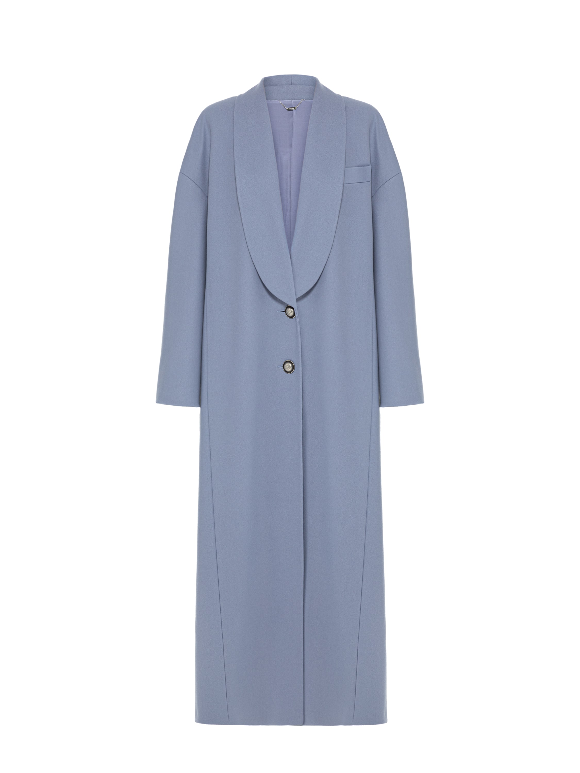 A solid light blue coat is made of wool fabric. The straight-cut model with a shawl collar is complemented by dropped sleeves. Fastens with two buttons.