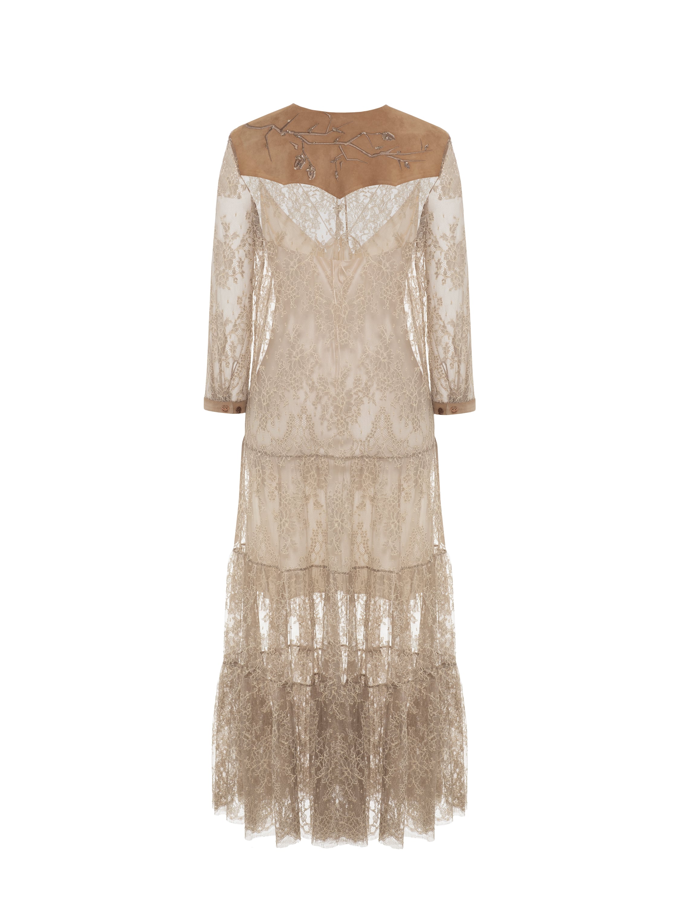 A beige midi dress with 3/4 sleeves is made of semi-sheer lace. The model is complemented by brown genuine suede inserts on the shoulders and sleeves, bead embroidery, and ties with tassels at the chest. The dress comes with a matching silk slip.