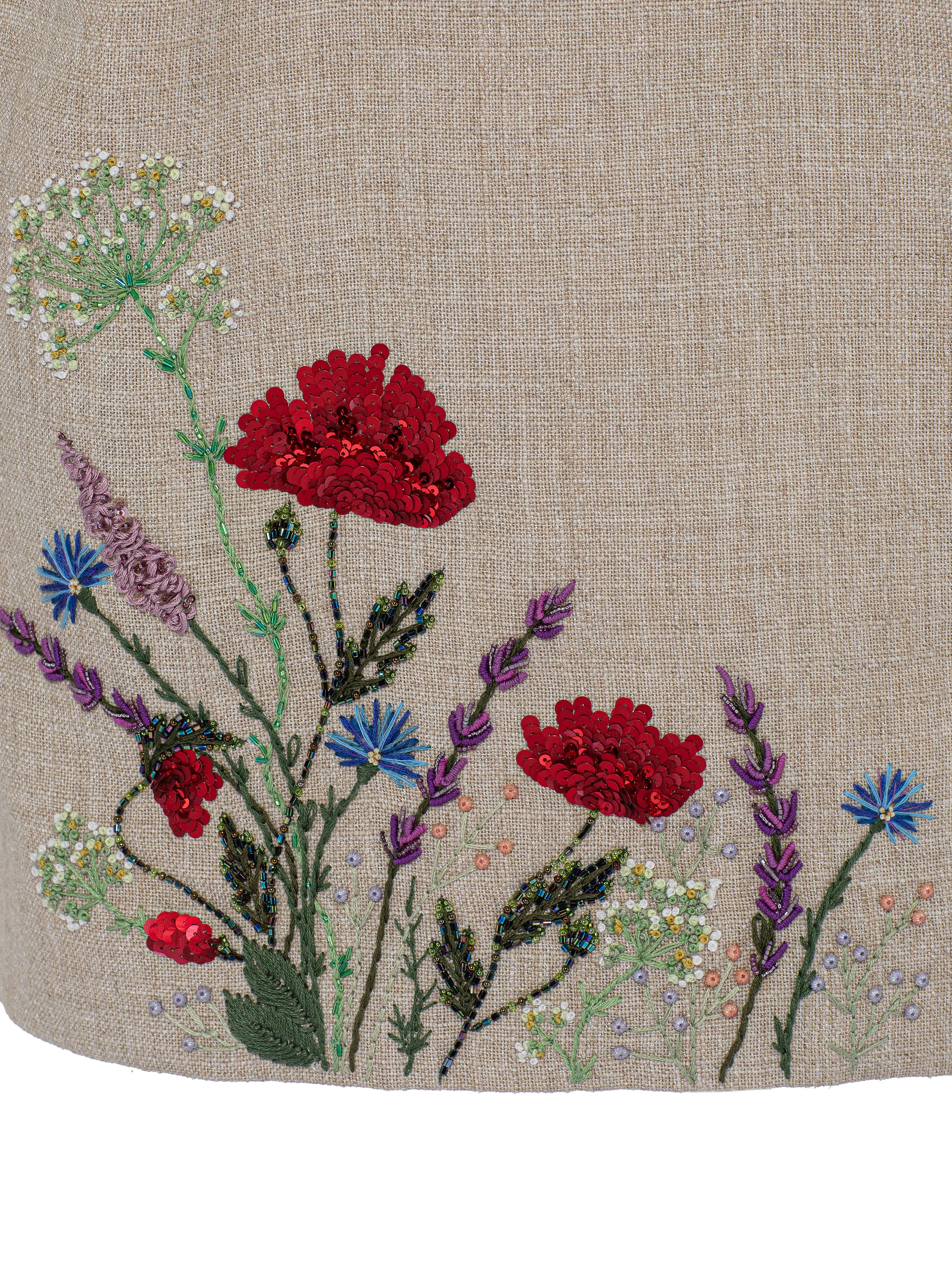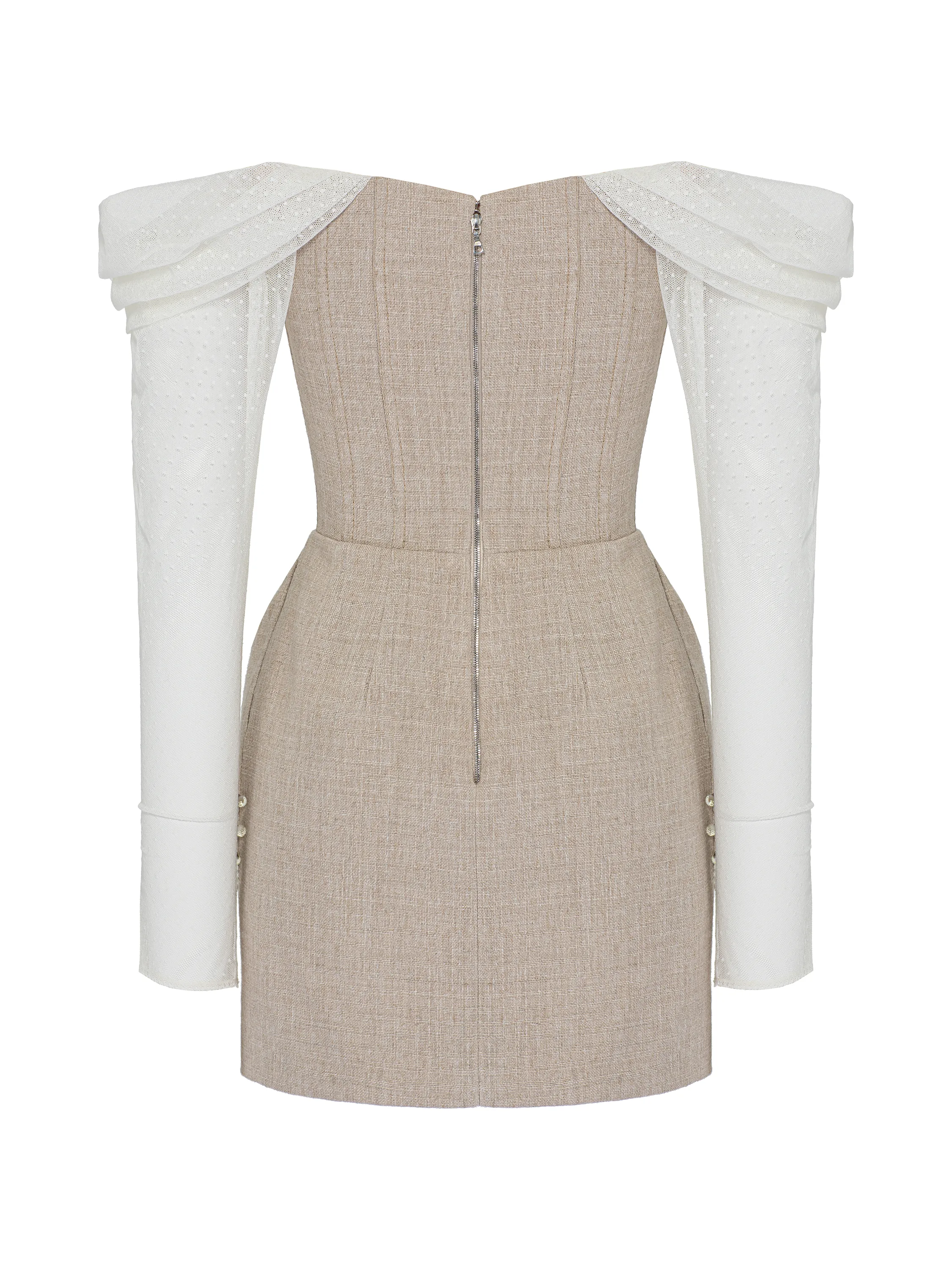 The mini dress with a corset base is made of natural linen fabric in a natural light beige color. The model with an open shoulder line is complemented by voluminous sleeves made of semi-transparent milk polka-dot mesh. Hand embroidery in the form of a bouquet of wildflowers makes the look delicate and romantic. Model parameters: height – 179 cm, 84/62/89.