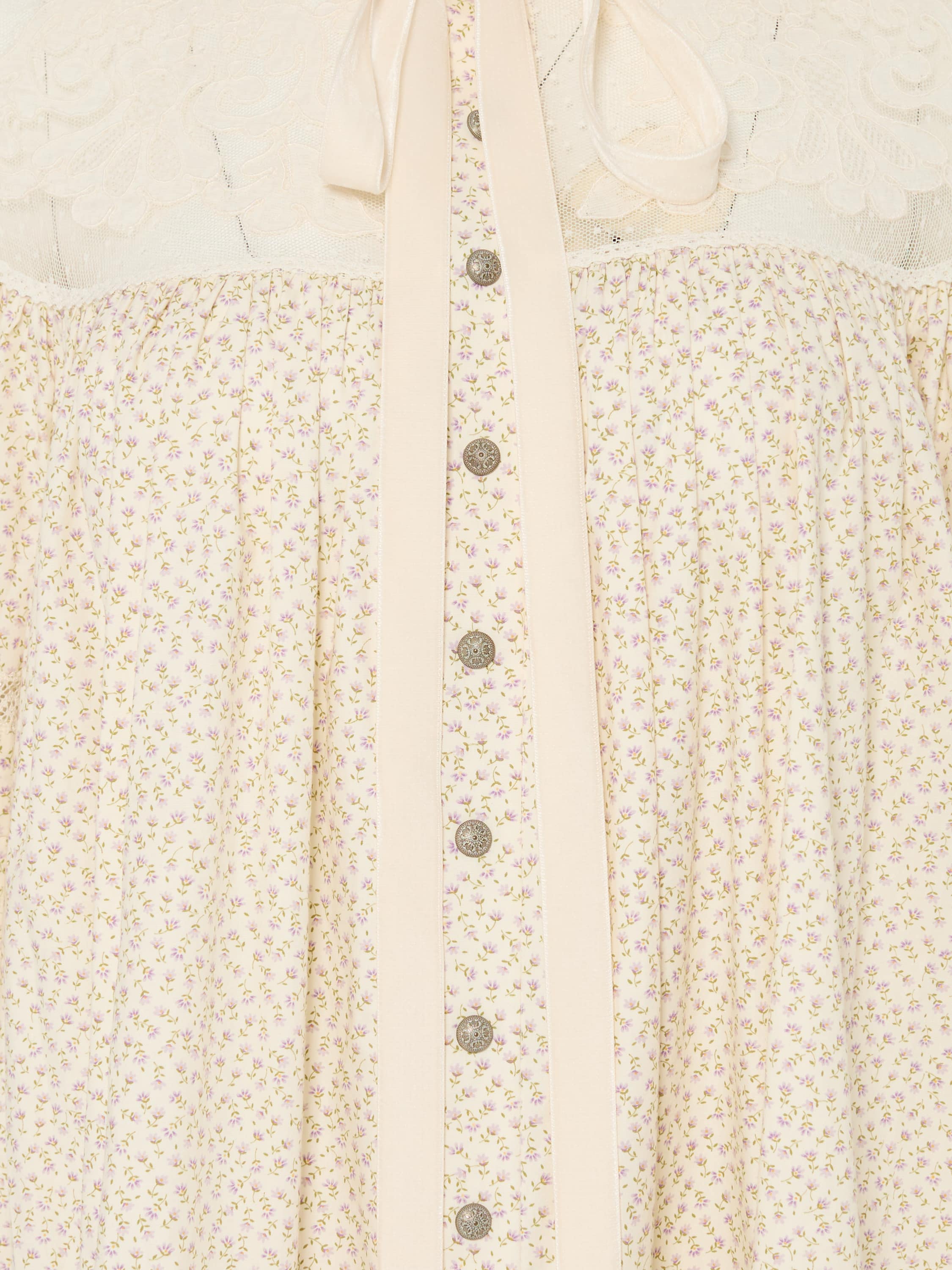 The delicate dress in a milky shade is made of pleasant-to-the-touch cotton decorated with an exquisite floral print. The A-line silhouette harmoniously combines with a lace yoke and a ruffle along the hem, creating a light and romantic look. The practical snap-button closure on the placket makes the dress easy to wear, which makes it an excellent choice for warm spring and summer days.