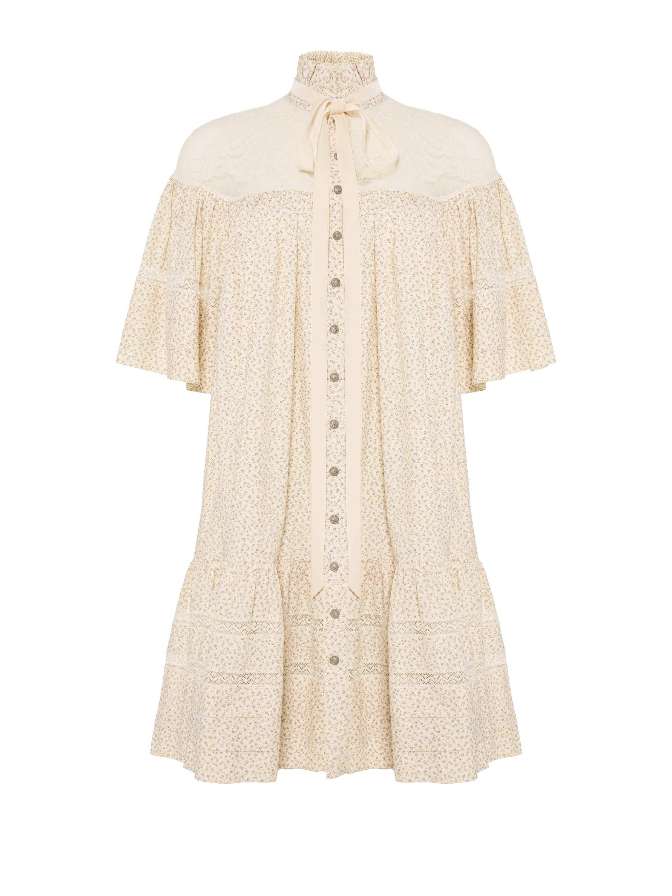 Milk-colored mini dress with floral print and lace
