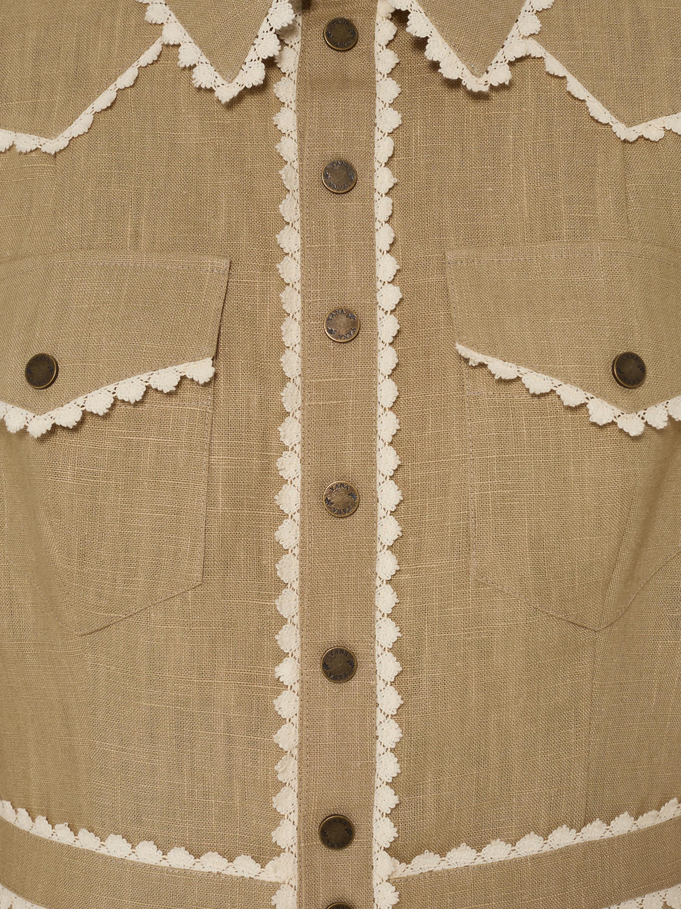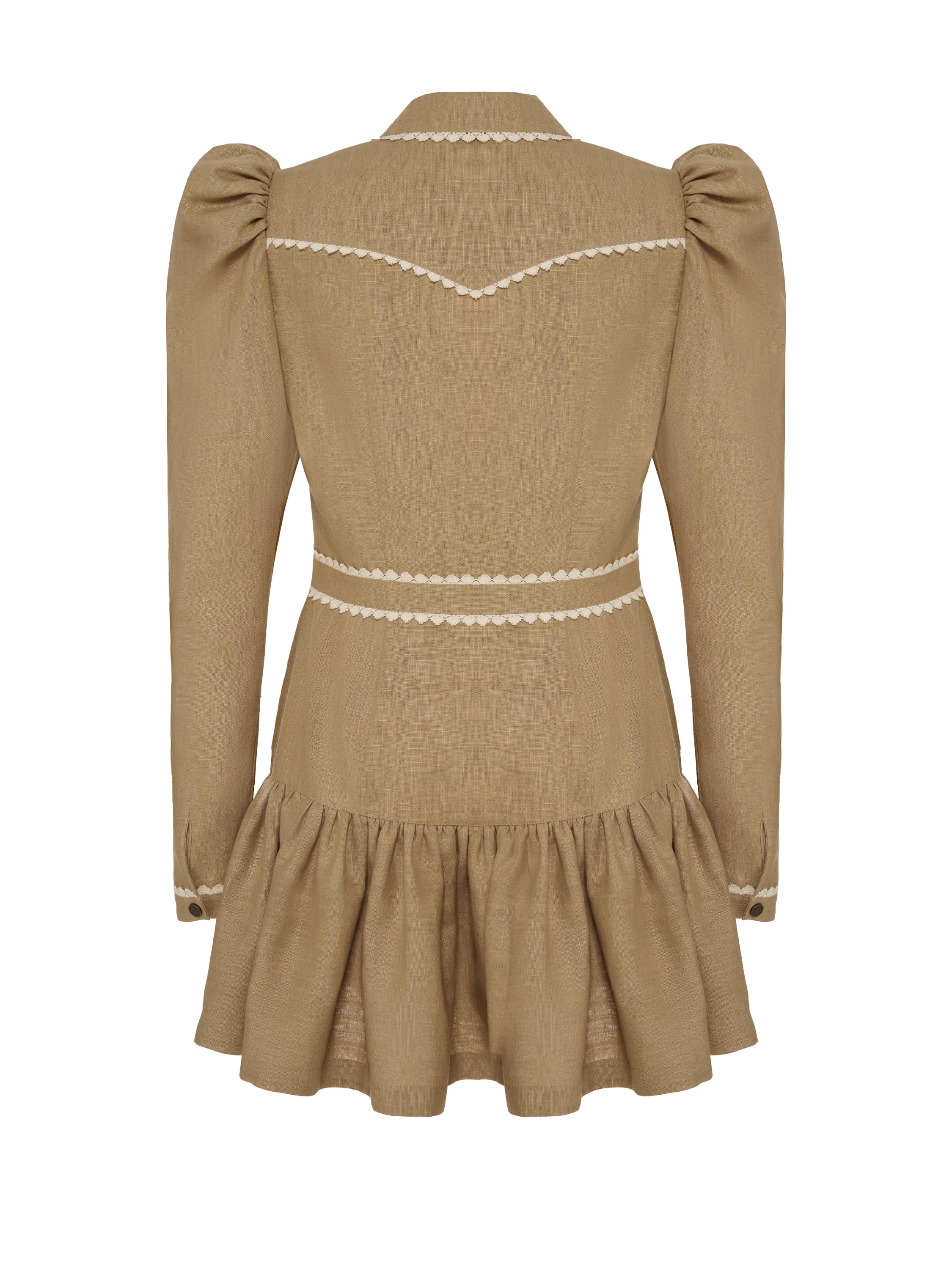 The everyday mini dress made of natural linen in a noble olive color will become an indispensable item in your summer wardrobe. The model with a detachable flounce on the skirt and pockets with decorative flaps on the chest is decorated with lace braid. Fastens with snap buttons along the entire front length.