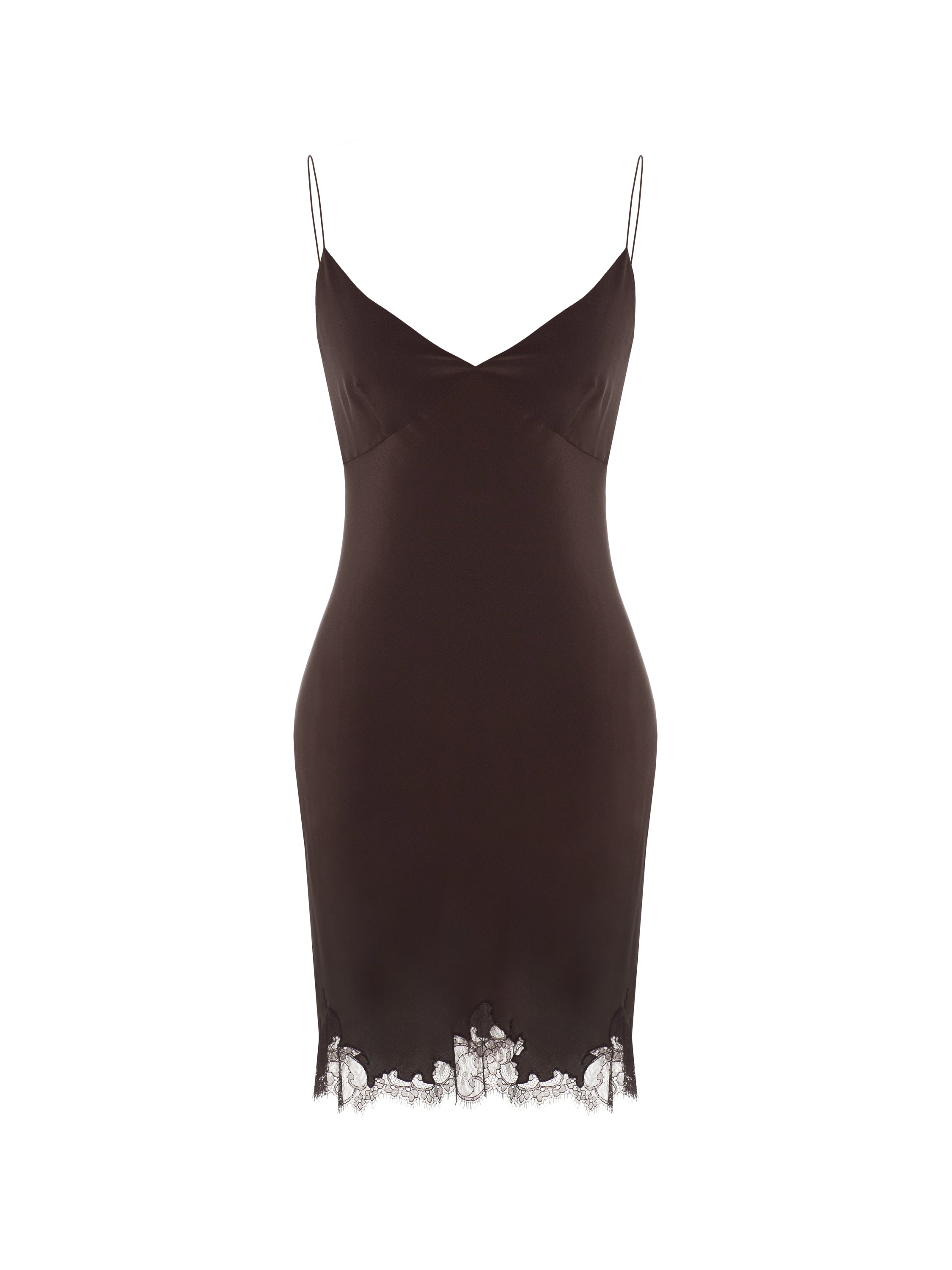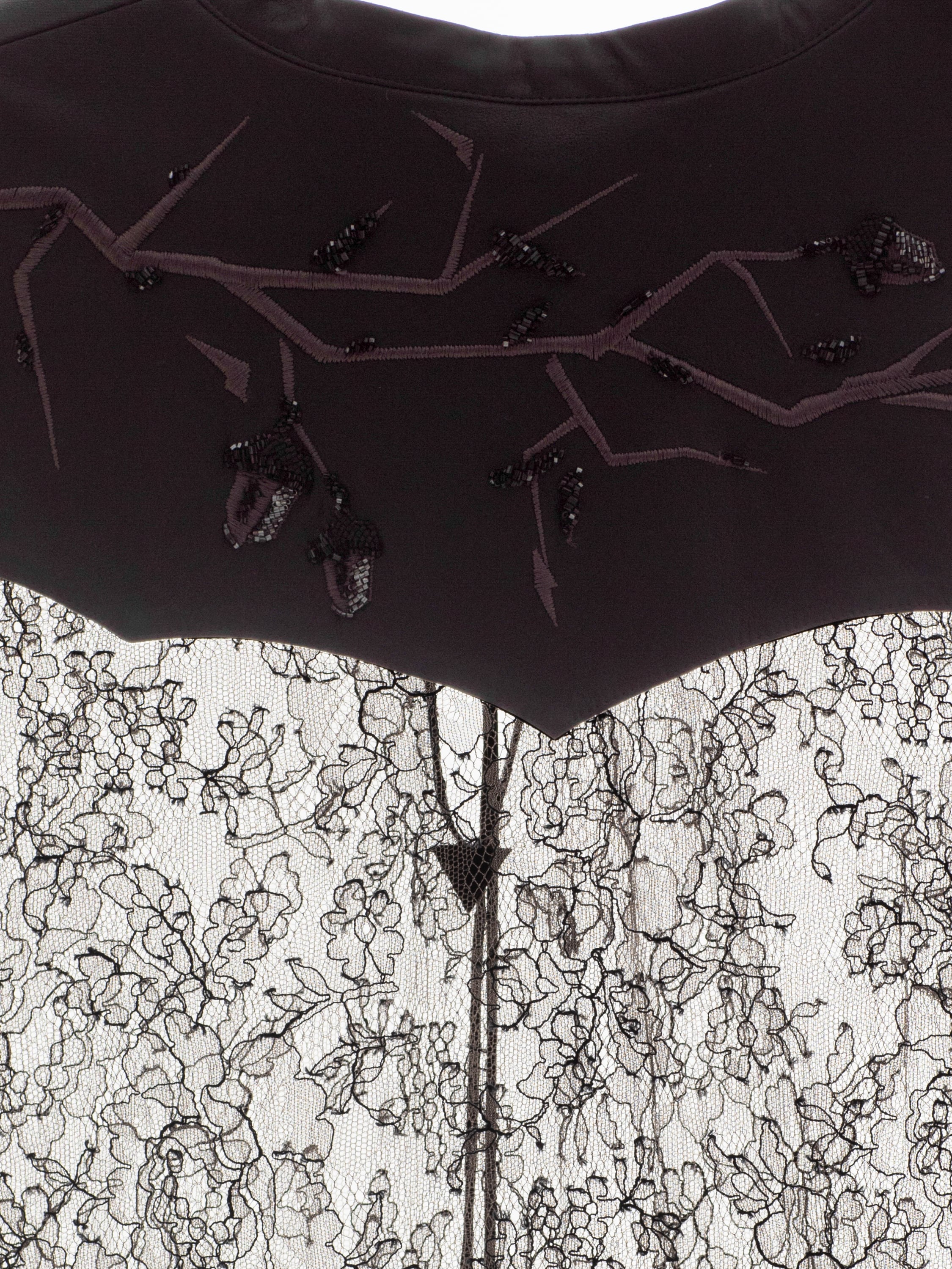 The grey-brown midi dress with 3/4 sleeves is made of semi-sheer lace. The model is complemented by inserts of natural brown leather on the shoulders and sleeves, bead embroidery and tassel ties at the chest. The dress comes with a matching silk slip.
