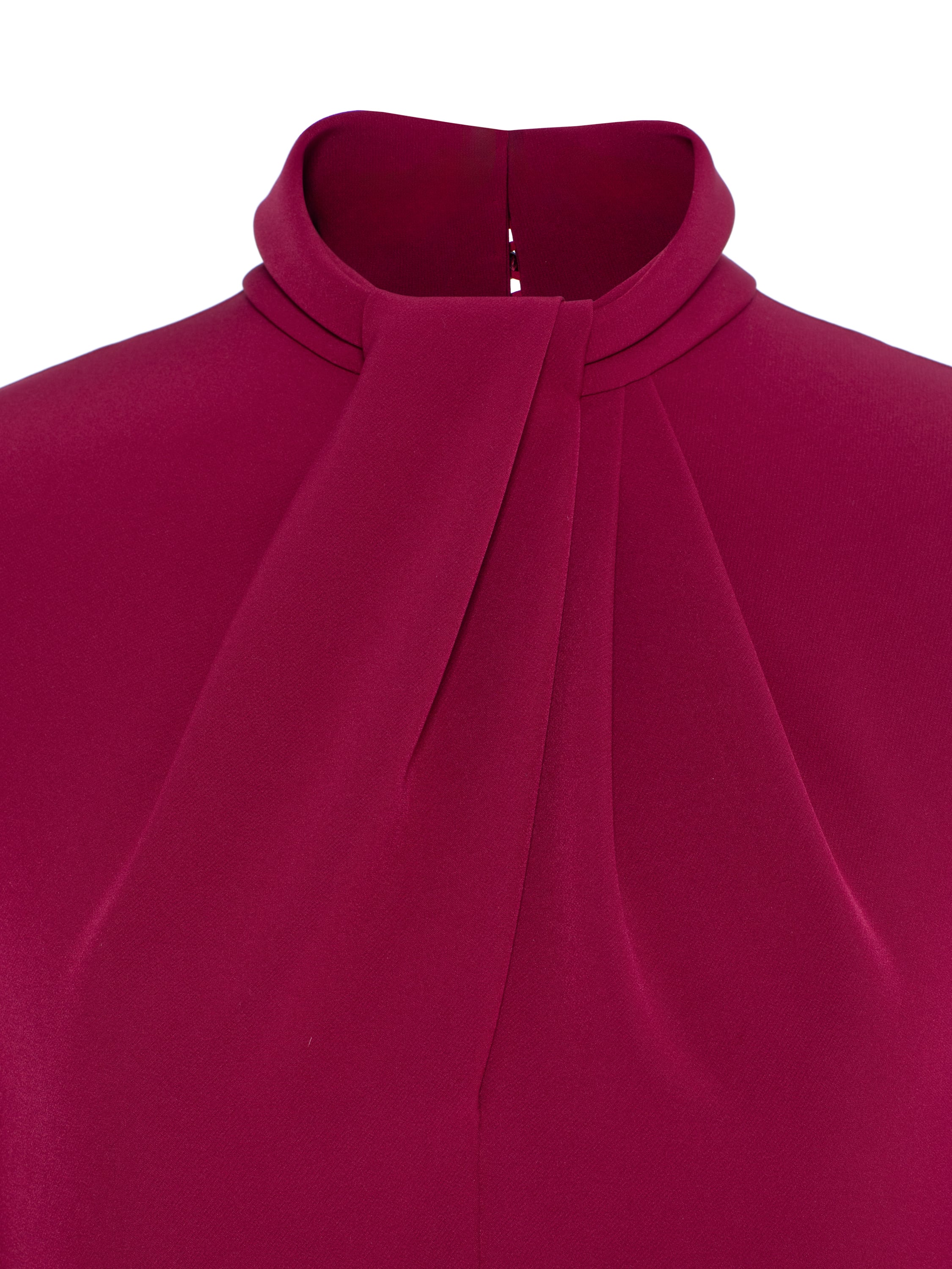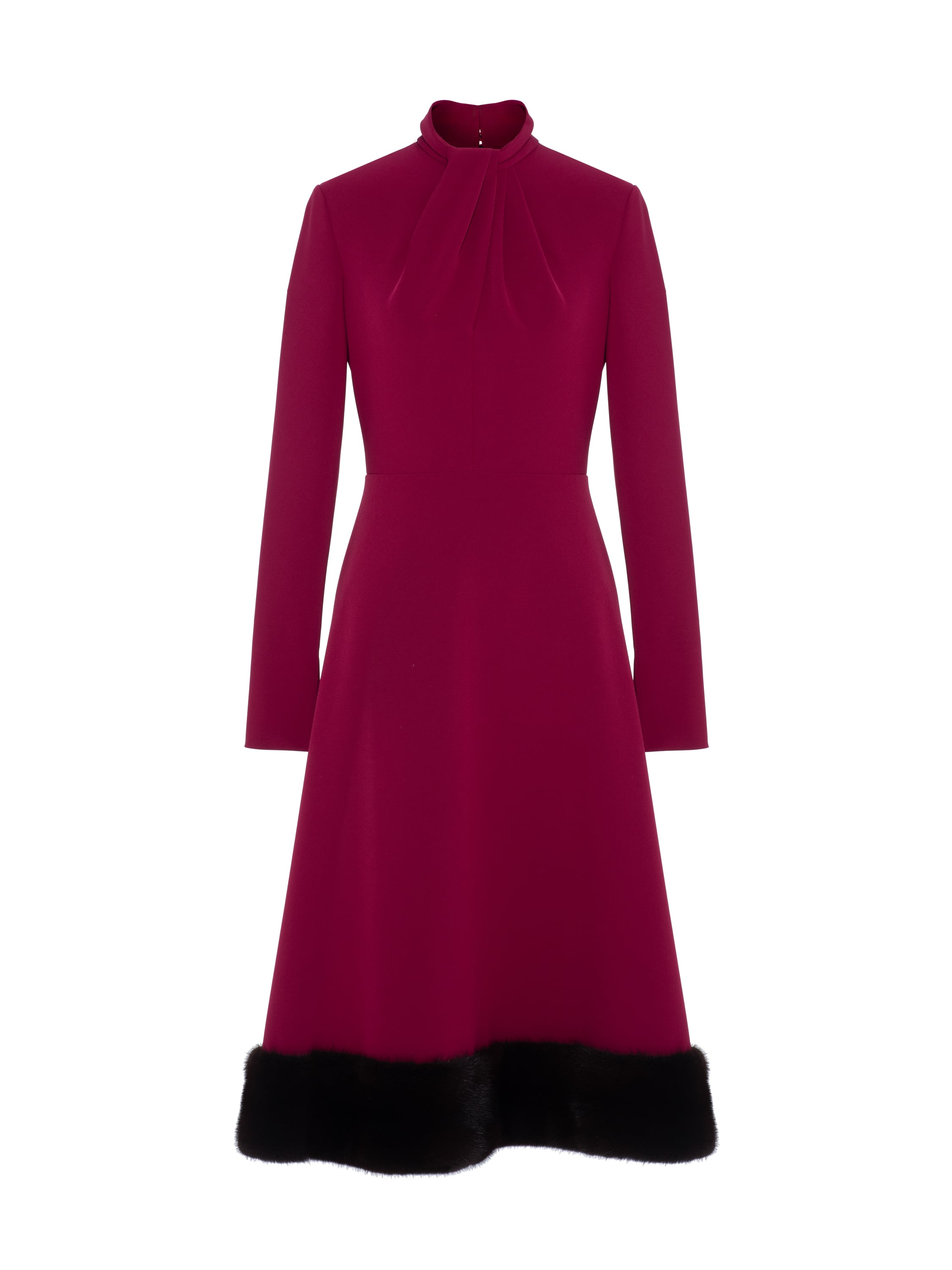 An elegant burgundy midi dress with contrasting mink fur trim guarantees a flawless evening look. The style with a stand-up collar is complemented by graceful draping. Fastening with a concealed zip at the back.