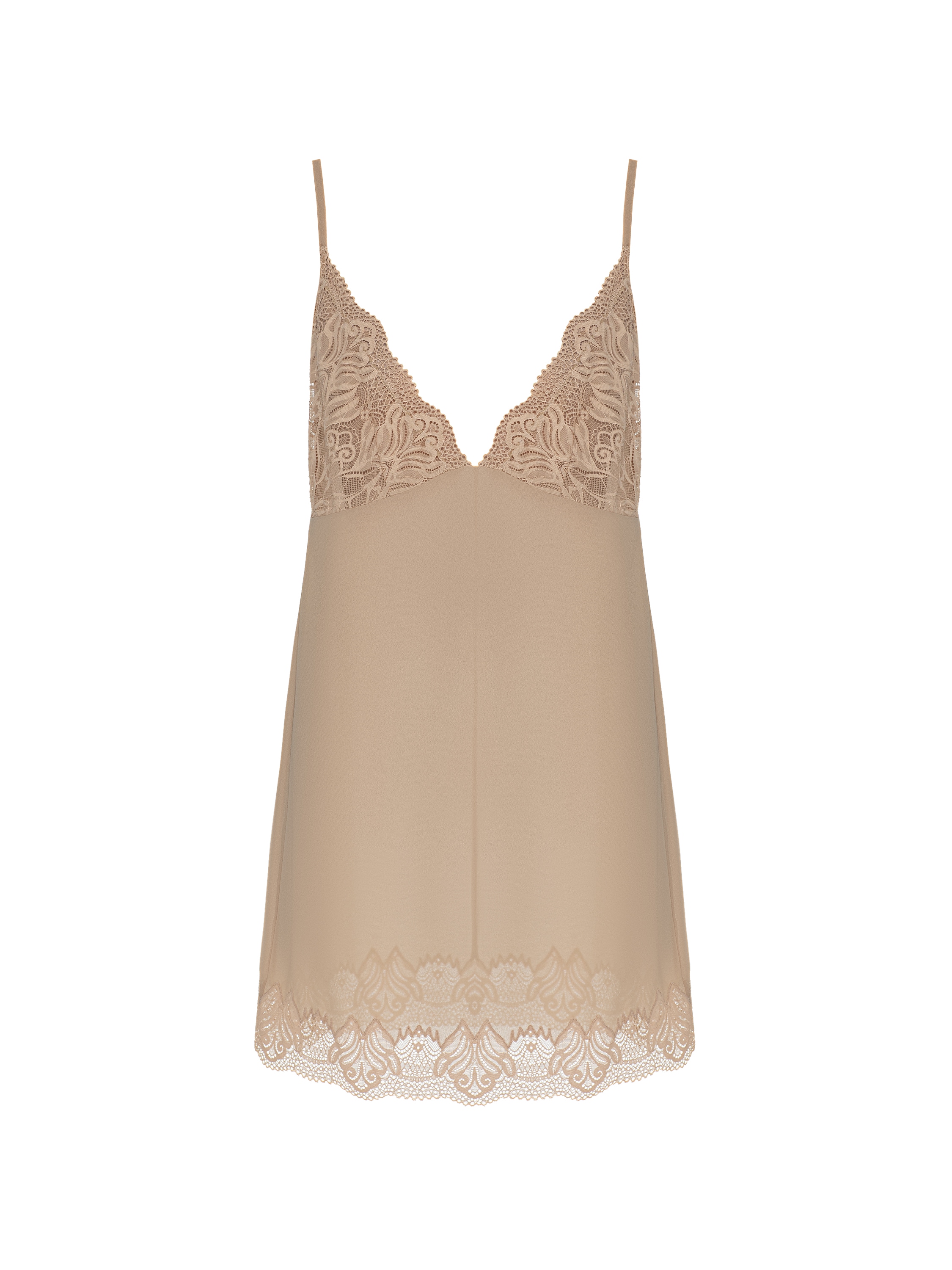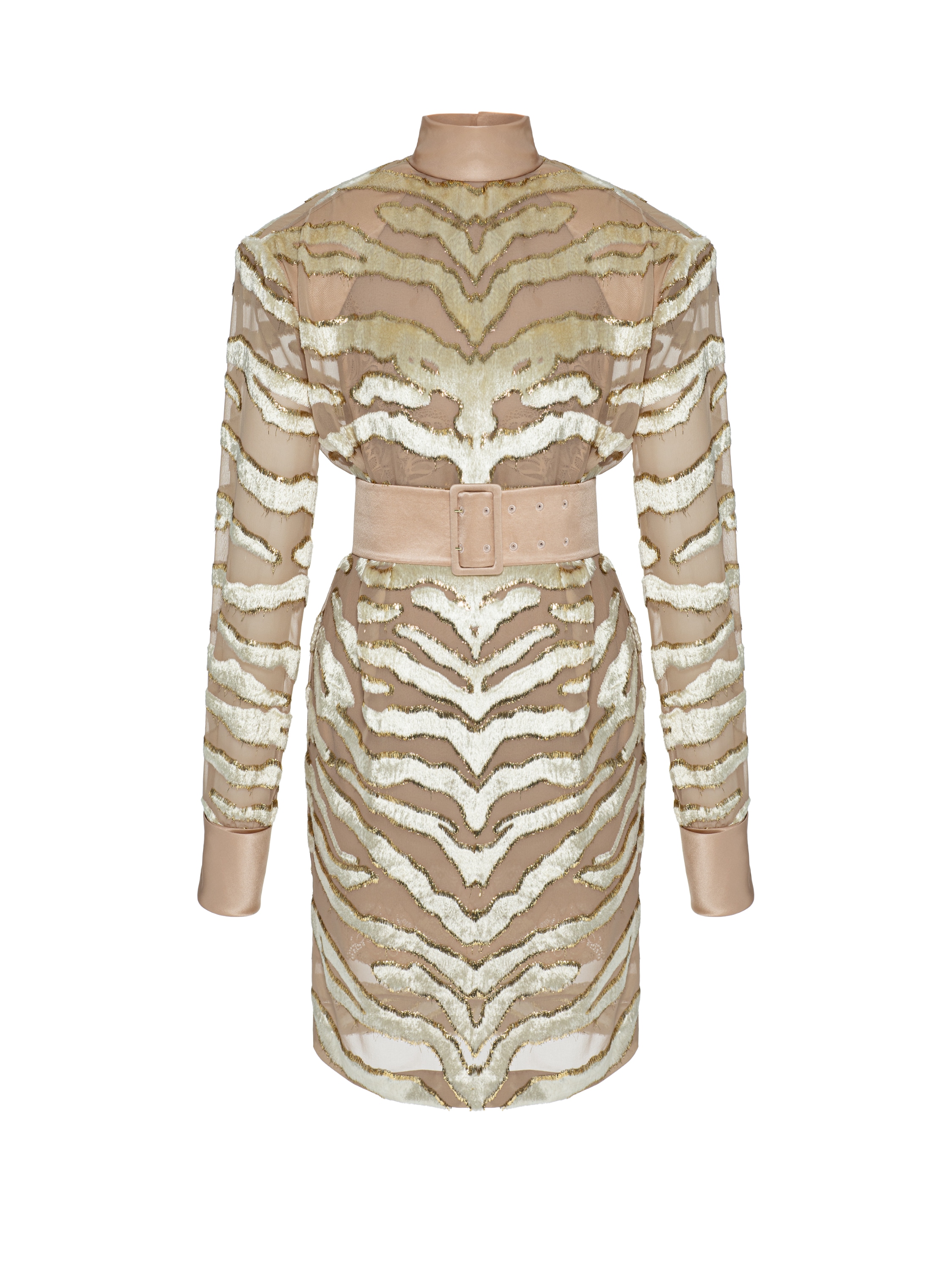 The midi dress made of beige devoré velvet with a trendy animal print is a striking and memorable evening look. The set includes a short slip dress made of silk chiffon with lace and a wide waist belt.
