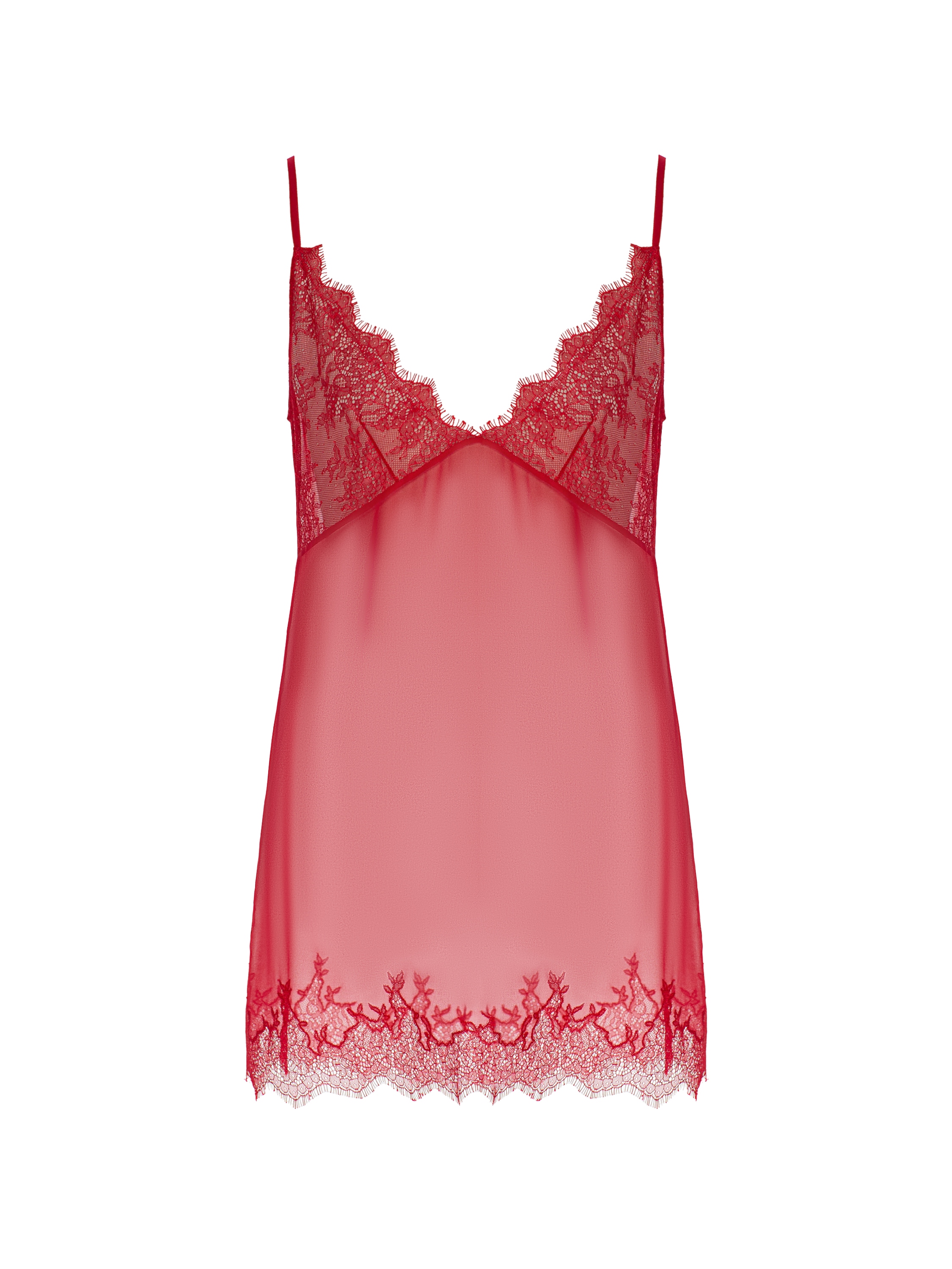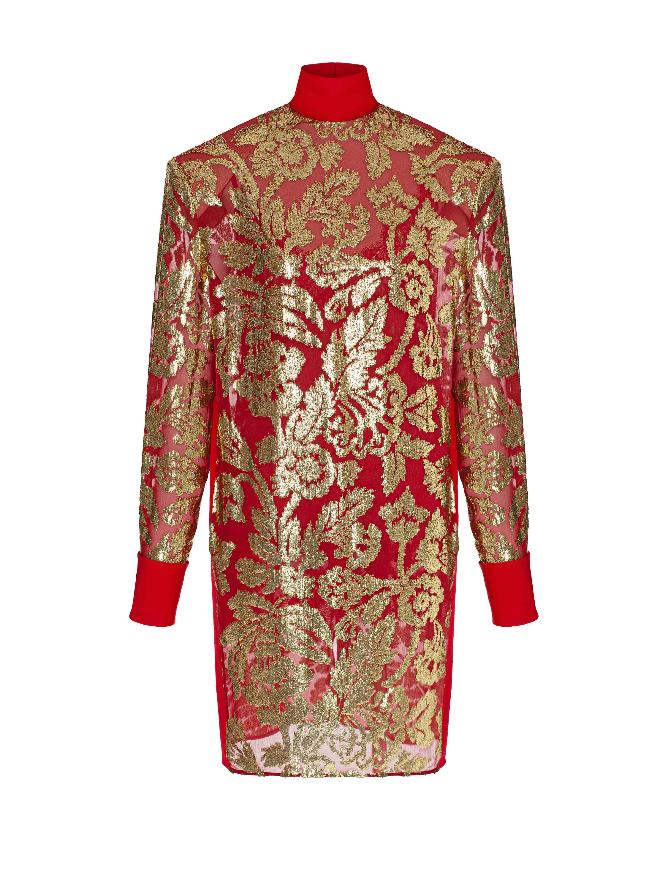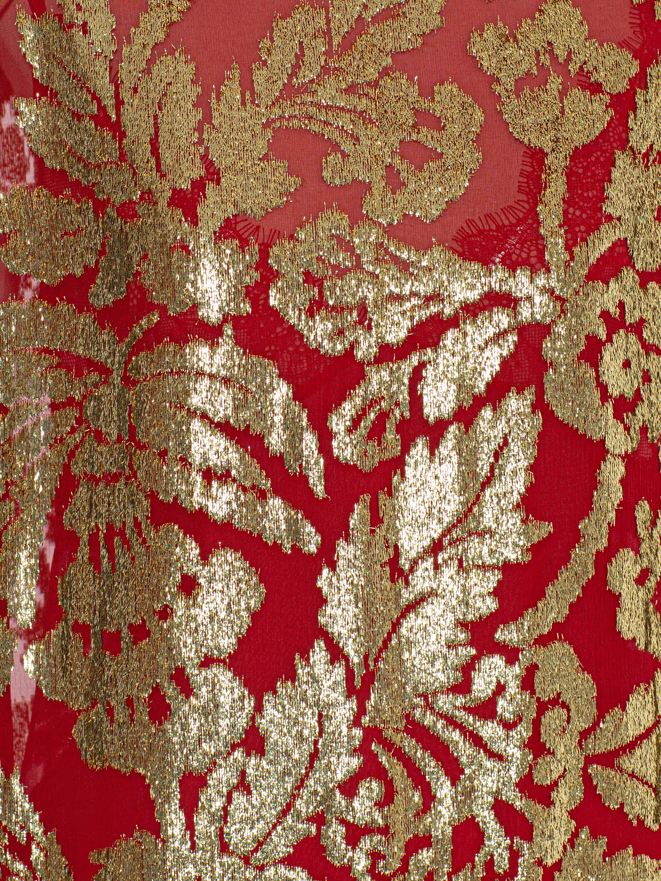 The red velvet devoré midi dress with an expressive gold oriental-style print creates a bright and memorable evening look. The style with broad shoulders is complemented by side stripes. The set includes a slip dress with delicate lace that subtly shows through the main layer.