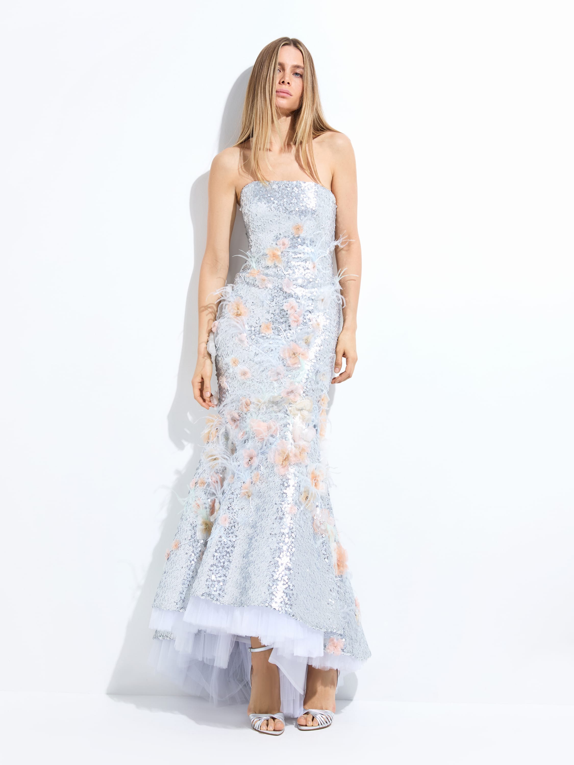 The evening dress made of mesh is completely embroidered with iridescent silver sequins. The figure-hugging silhouette emphasizes harmonious proportions and the beauty of body curves. The exquisite floral composition is handcrafted from organza and feathers by the Yana fashion house artisans in 103 hours.