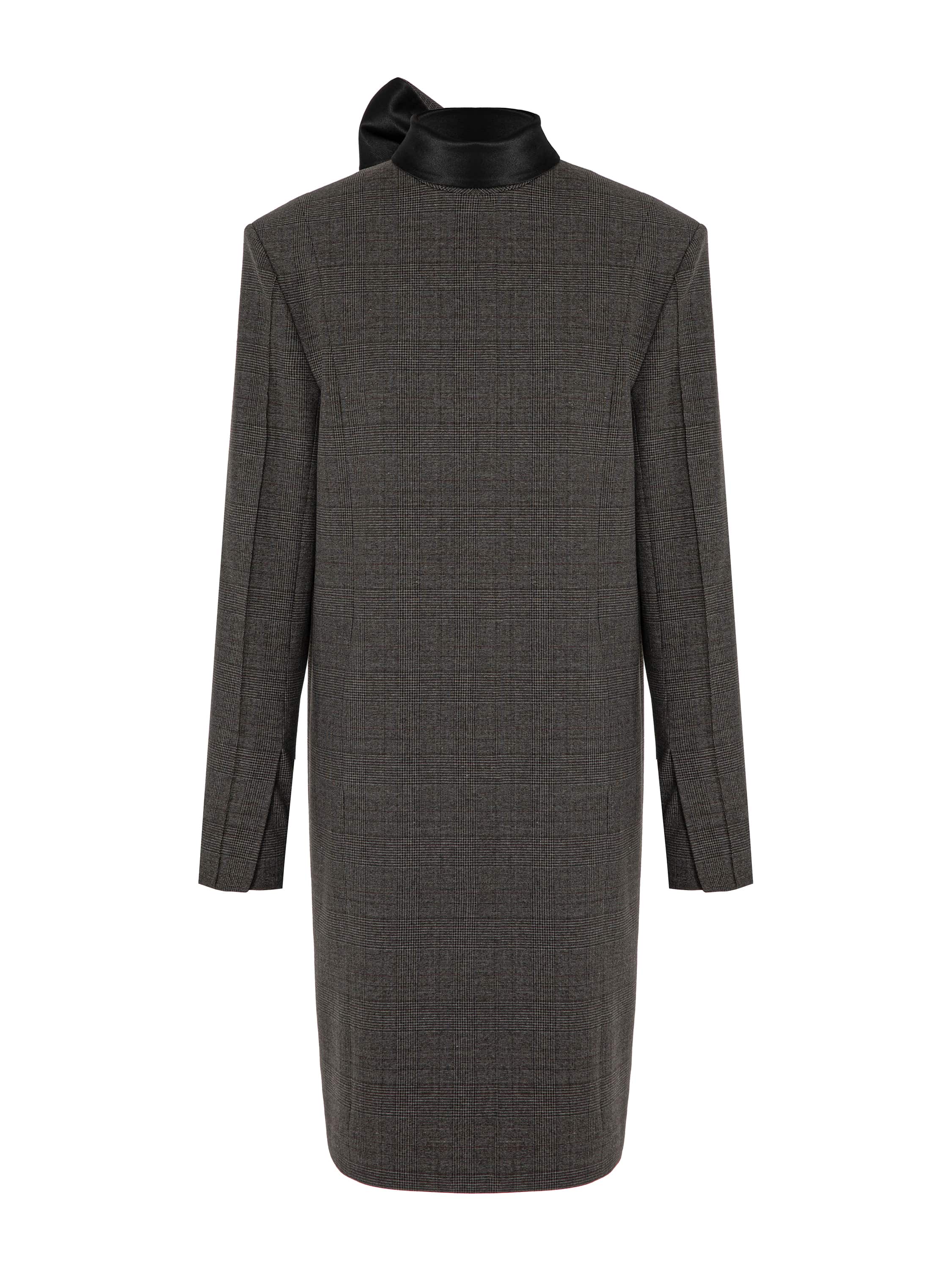 A strict grey mini dress with an accent on the shoulder line refers to the uniforms of the 1960s. This cut creates a sense of discipline and strength, and in the new YANA collection it turns into an elegant symbol of refinement and status. The model with long sleeves is complemented by a high stand-up collar that turns into long black ties at the back, which can be tied into a bow or an original knot.