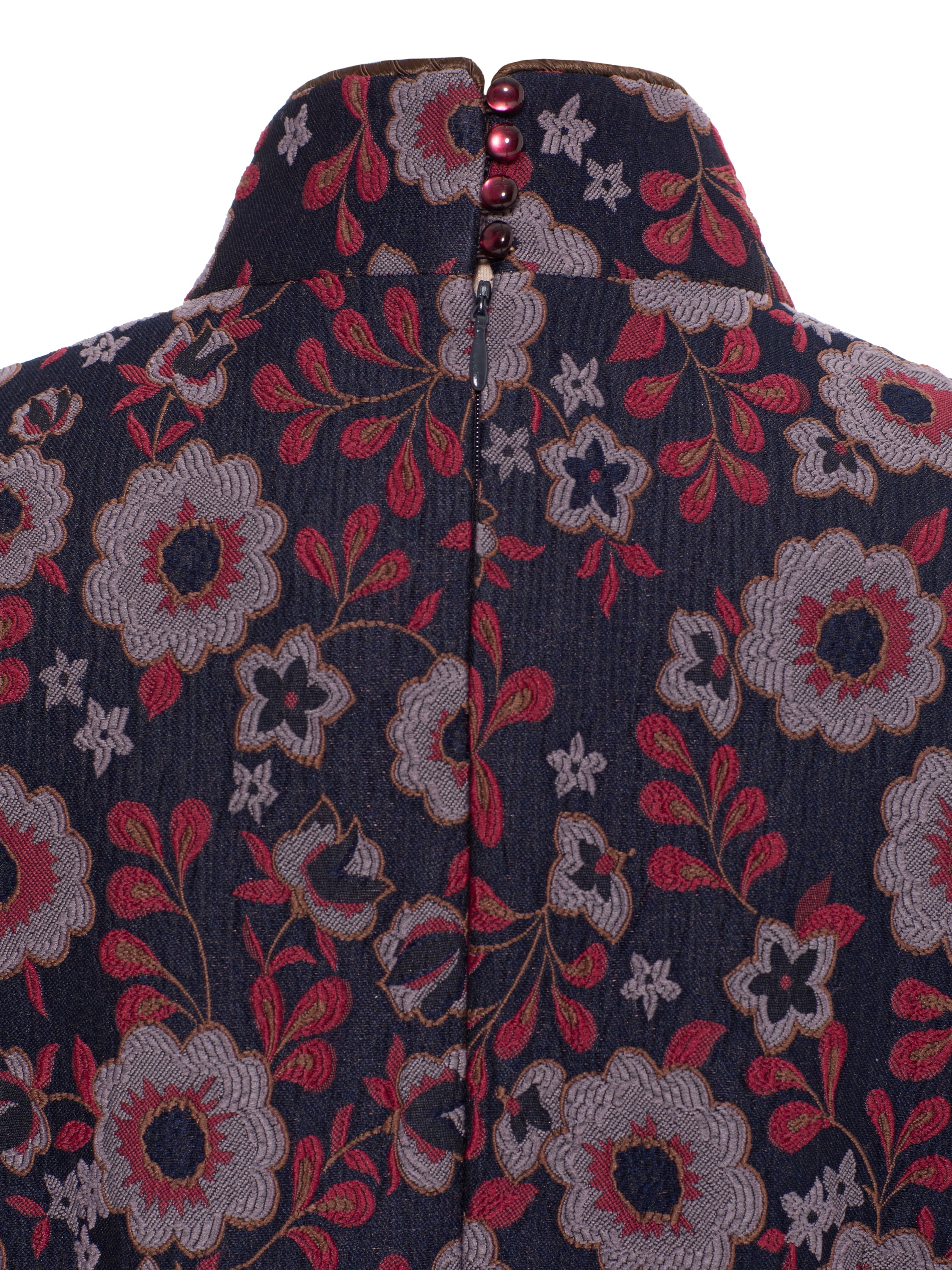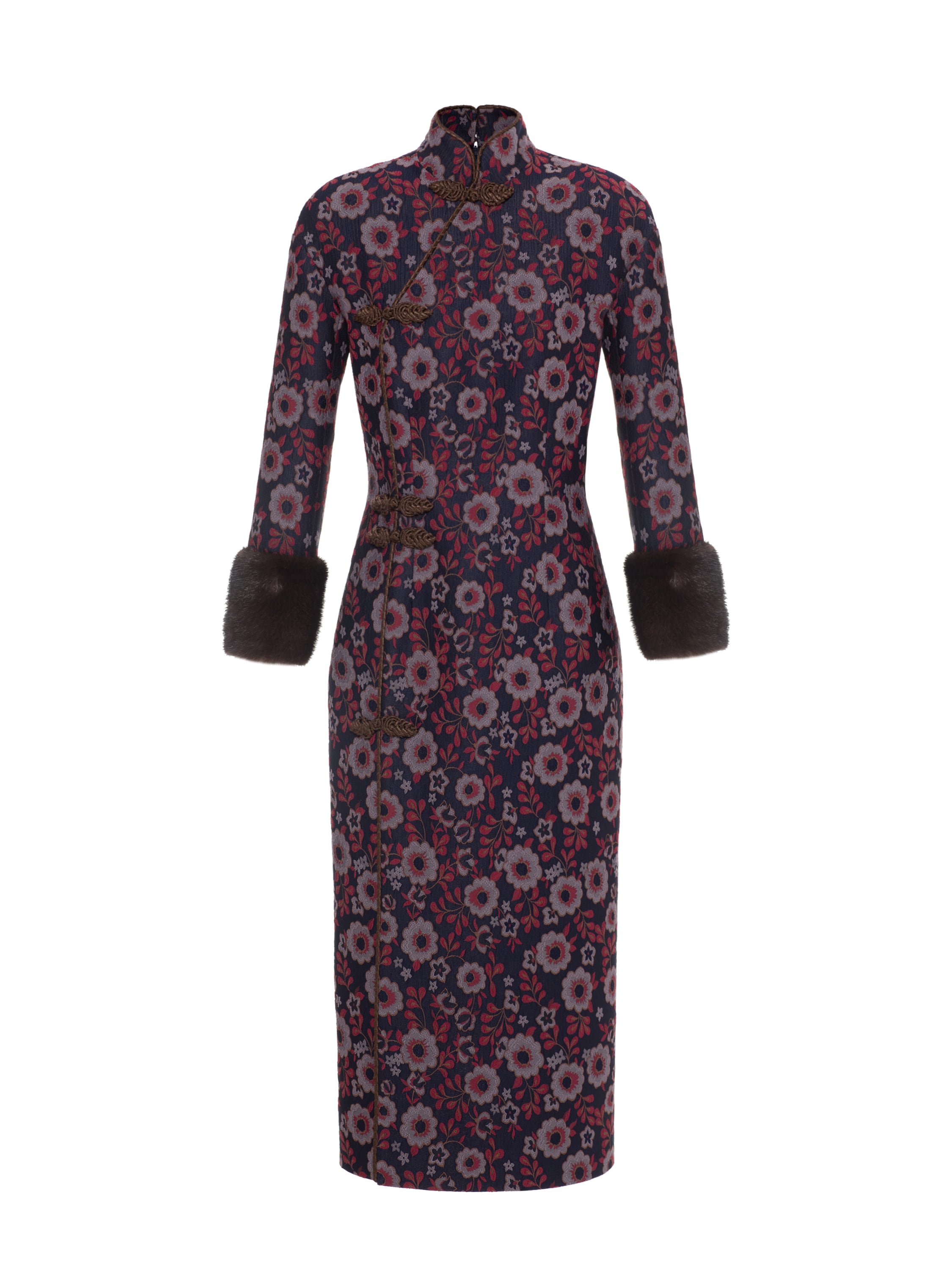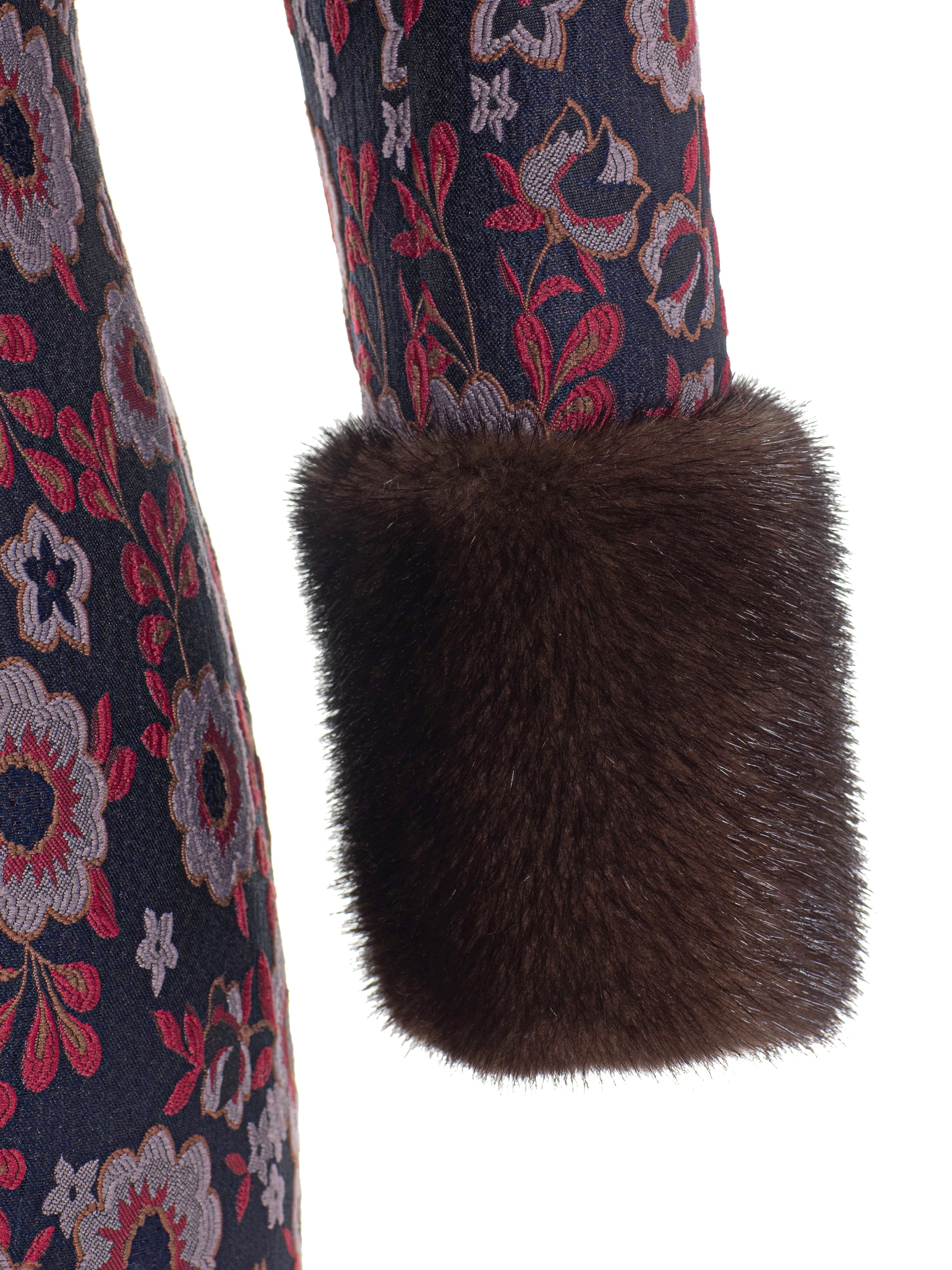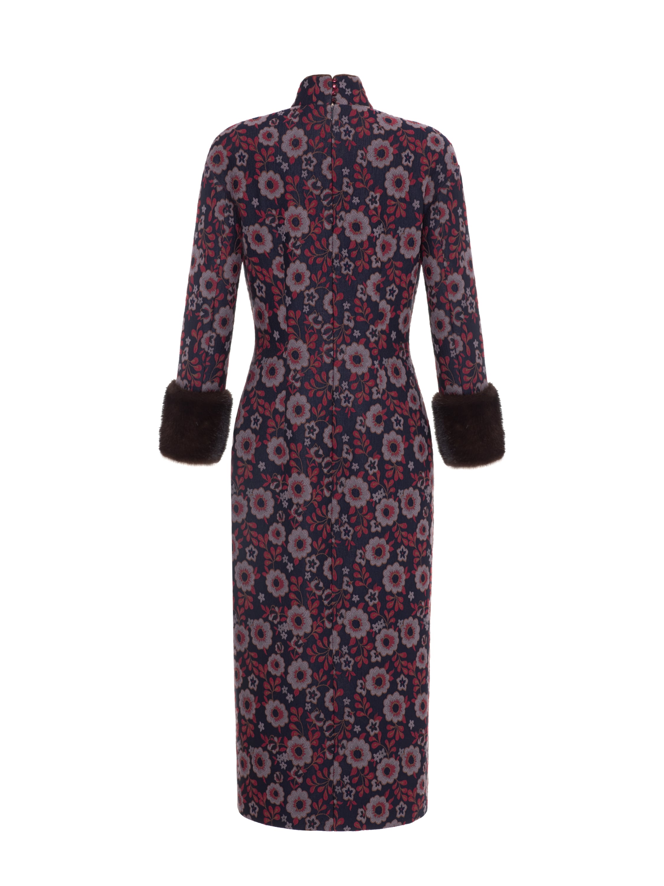 The elegant midi dress is made of jacquard with a floral print. The model is complemented by sleeves with mink fur cuffs and handmade toggles, which took the Yana fashion house craftsmen 20 hours to create. The dress fastens with a concealed zip at the back.