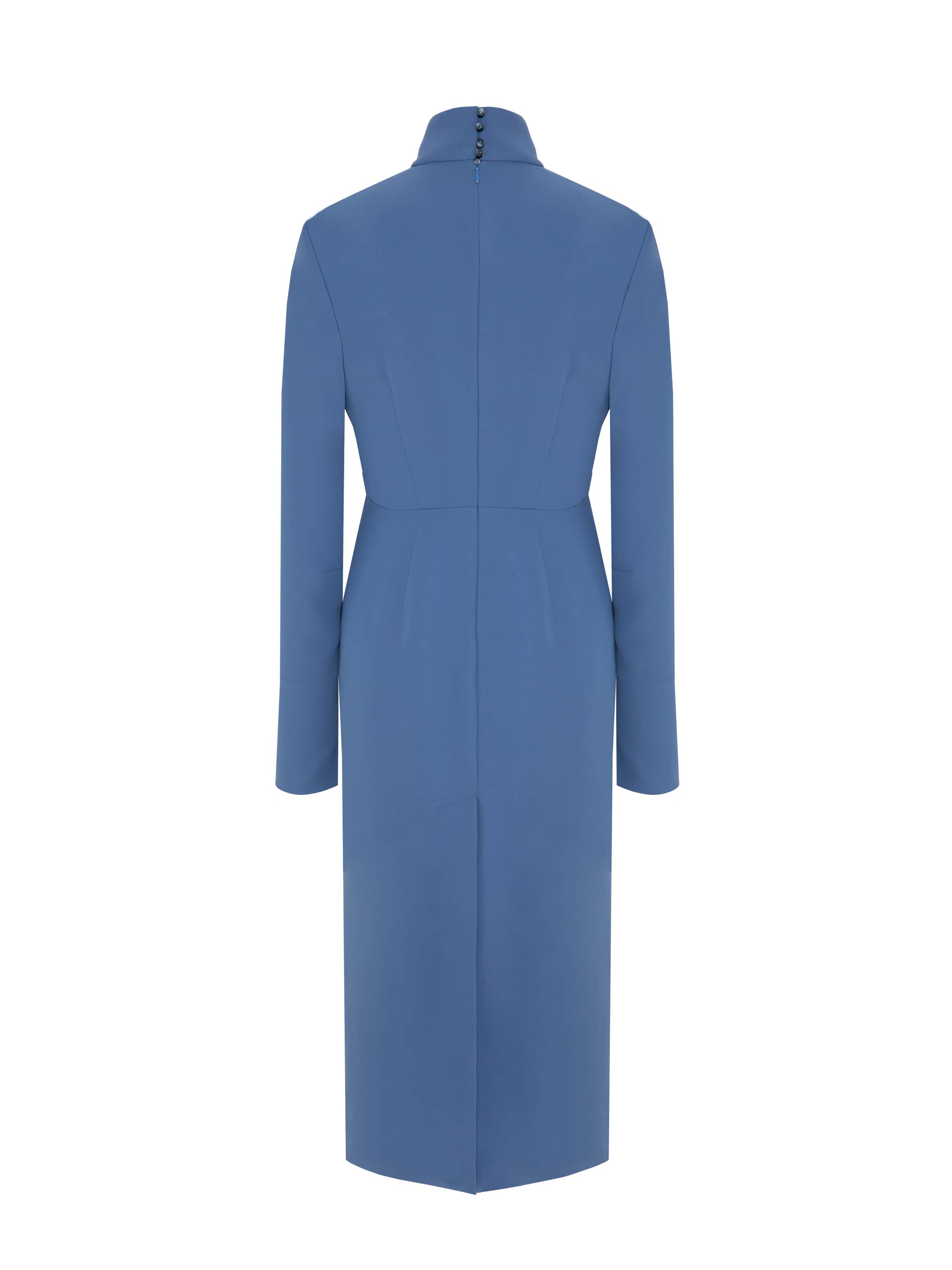 A blue midi dress looks self-sufficient and needs no bright accents; it instantly becomes the center of attention. The style with a stand-up collar and soft draping on the bodice delicately hugs the upper body, flattering the figure. The clean cut and below-the-knee skirt length make the dress a suitable option even for events with a formal dress code.