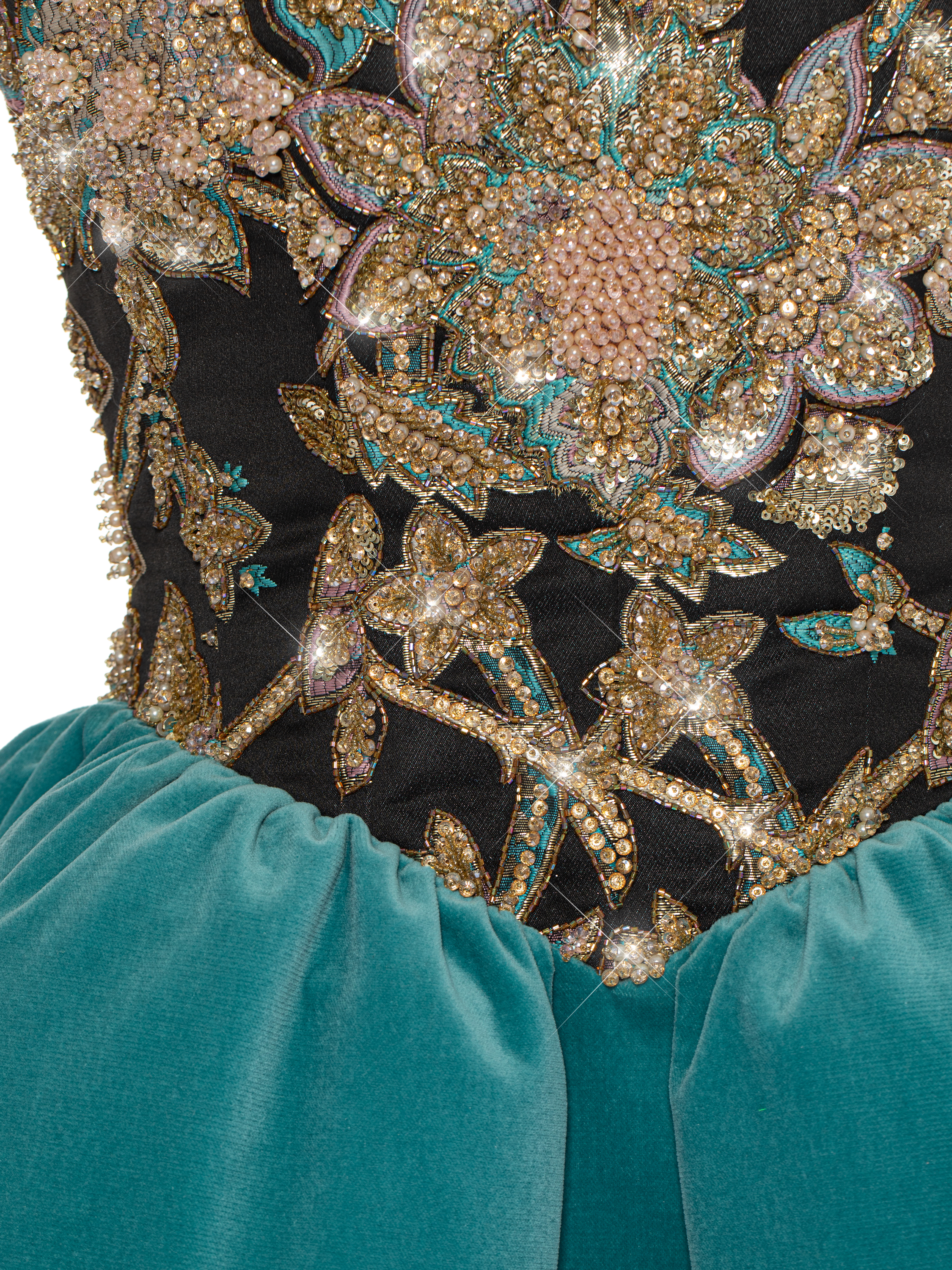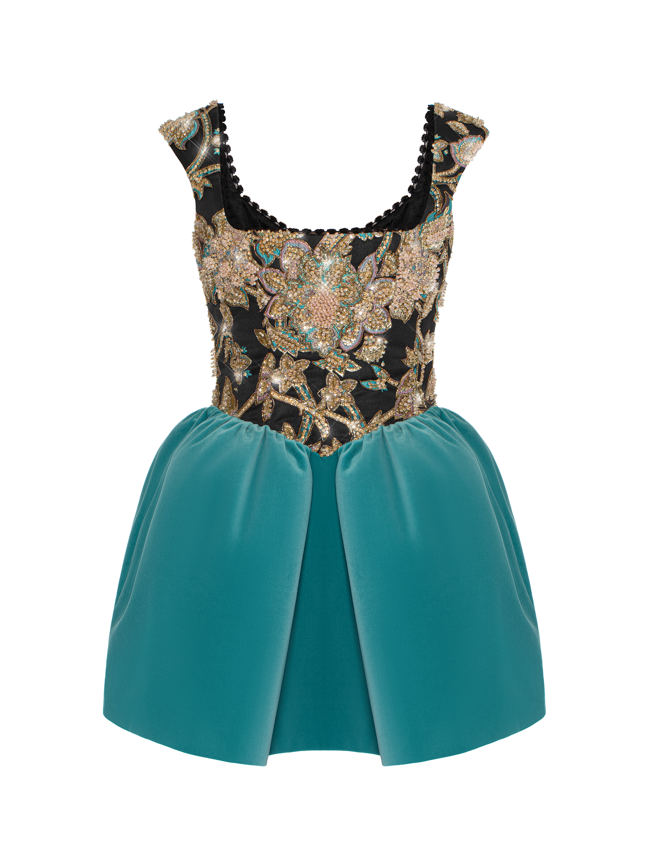 Mini dress with a voluminous skirt, corset bodice and square neckline is an example of the perfect combination of femininity and originality. The item is made of black natural silk jacquard embroidered with sequin and bead flowers and soft velvet in a rich turquoise color. Fastens with a zip at the back.