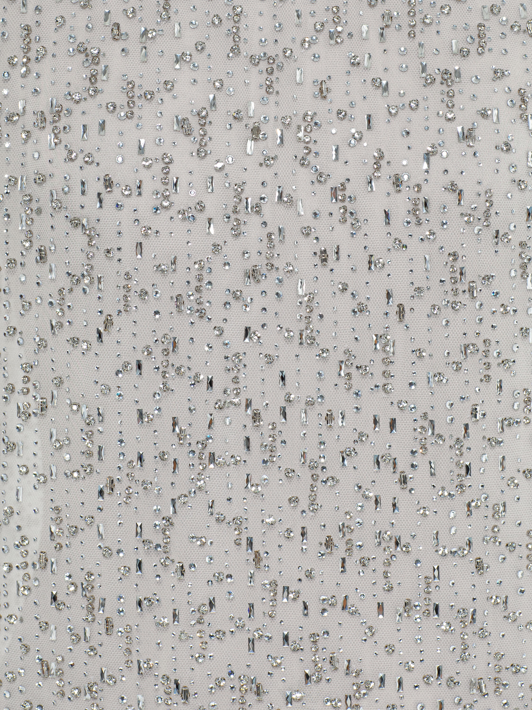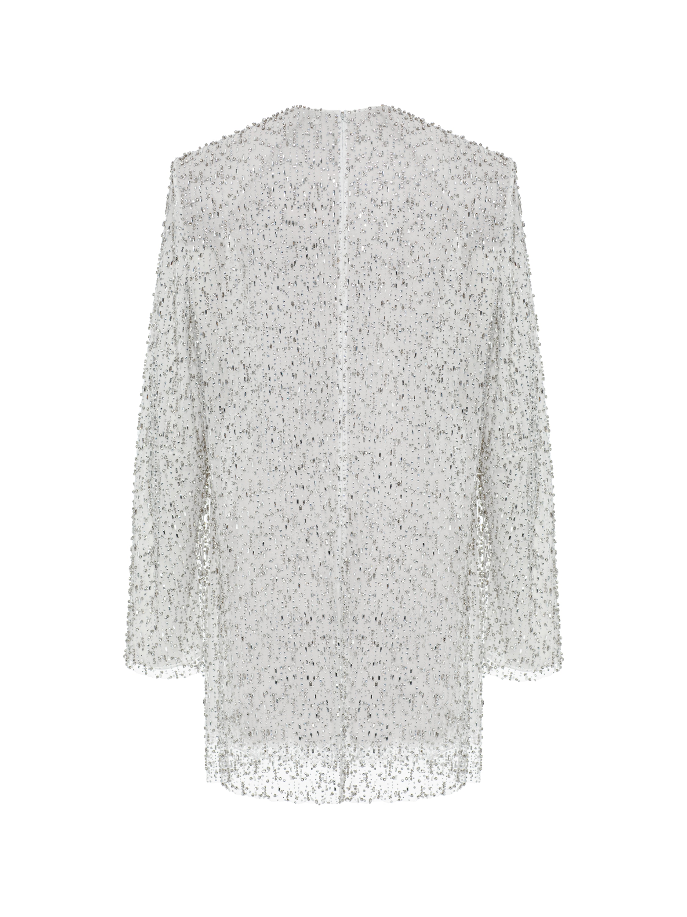 Evening mini dress with broad shoulders made of white mesh fabric. The model is decorated with shimmering crystals. Fastens with a concealed zipper at the back.