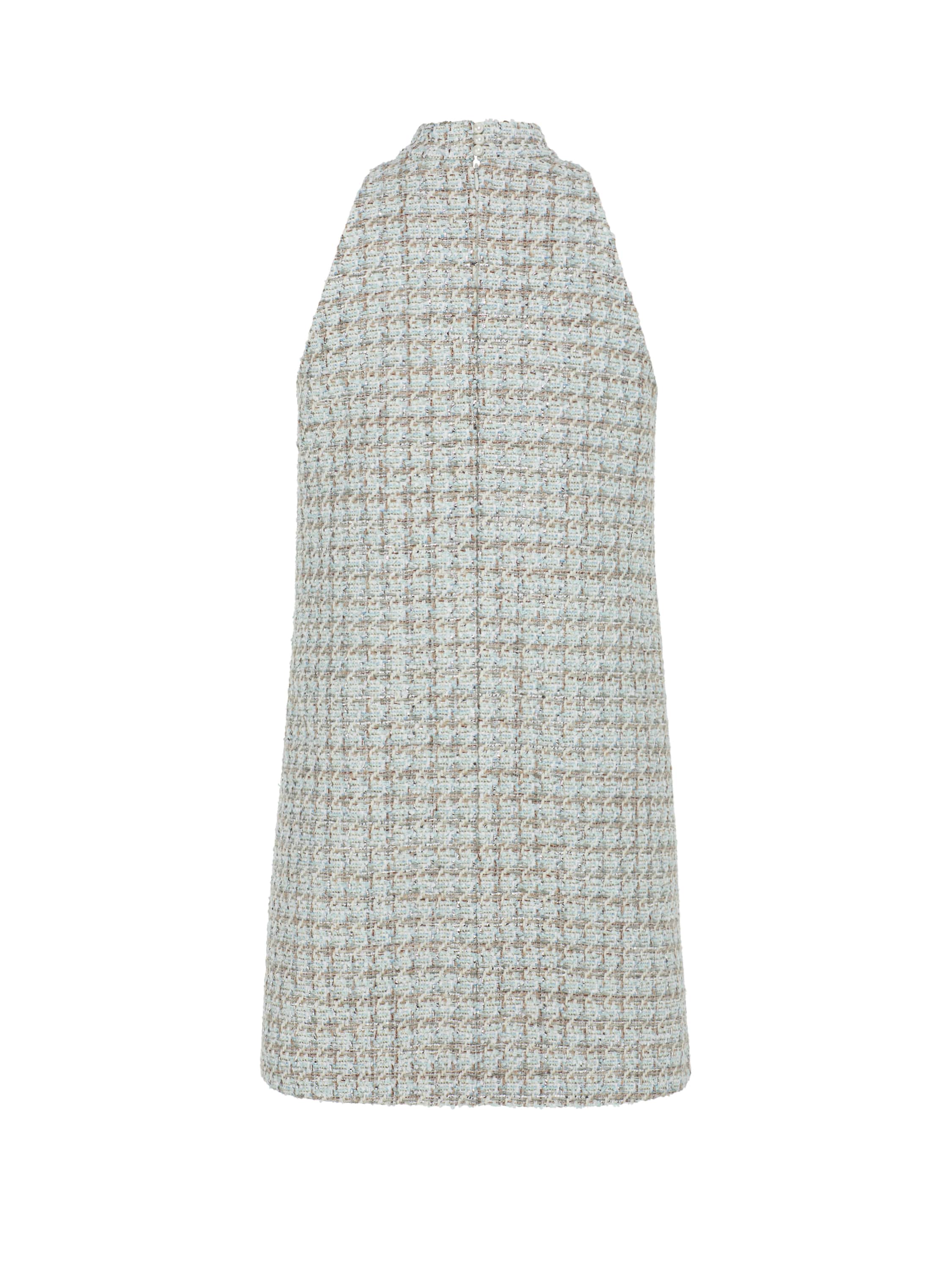 The beige-and-mint mini dress is made of tweed. The sleeveless piece is complemented by a stand-up collar; the keyhole neckline is accentuated by a hand-crafted clou fastening. Fastens with a concealed zipper at the back.